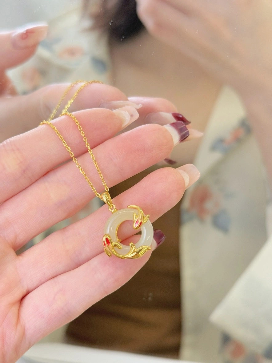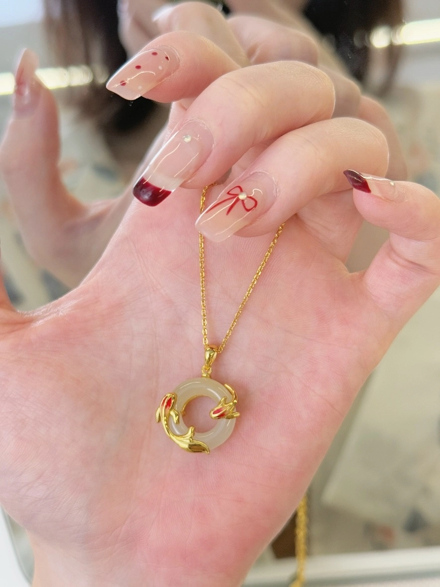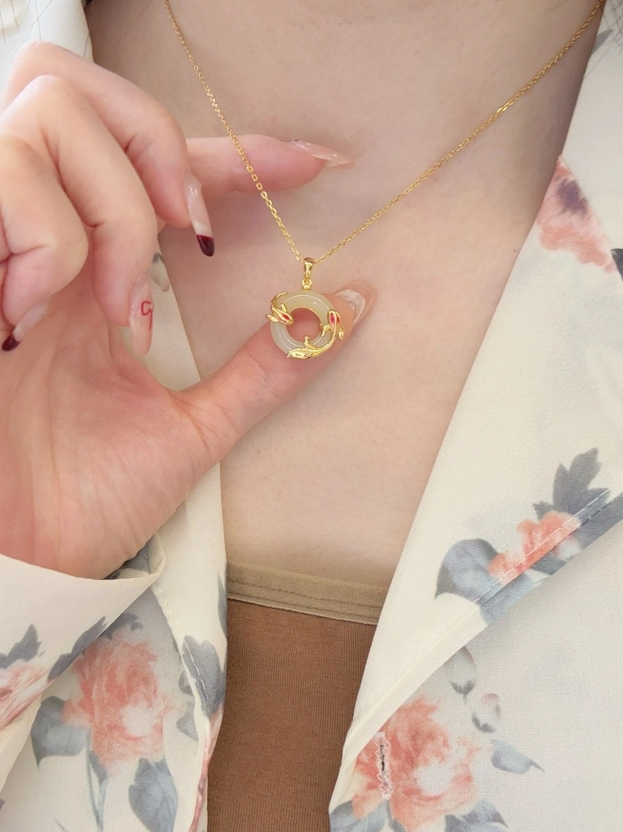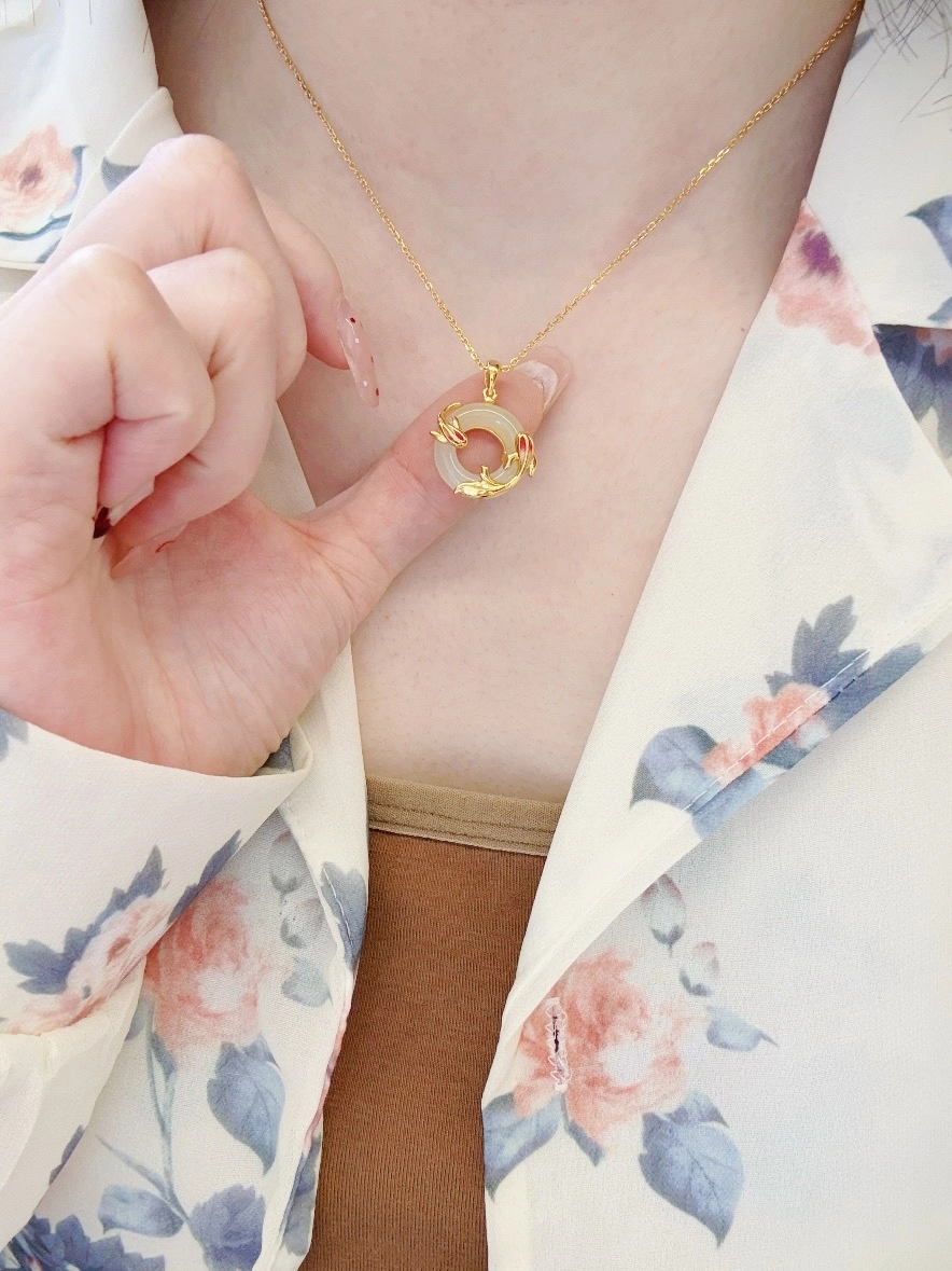 精致的和田玉锦鲤平安扣项链,锦鲤灵动可爱,平安扣圆润饱满,两者结合,寓意着好运与平安。戴上它,让好运与你同行,幸福满满!