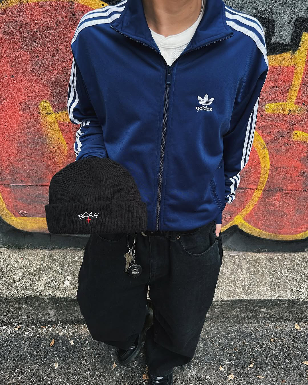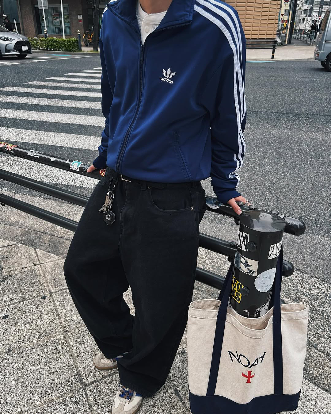 经典阿迪夹克,简约黑白条纹勾勒利落线条。搭配随性黑裤与复古板鞋,头戴针织帽,慵懒氛围感拉满。再拎上个性NOAH帆布袋,街头潮流感轻松拿捏,日常出街超吸睛。在喧嚣中寻一份独属于自己的宁静,至简随性才是潮流前线