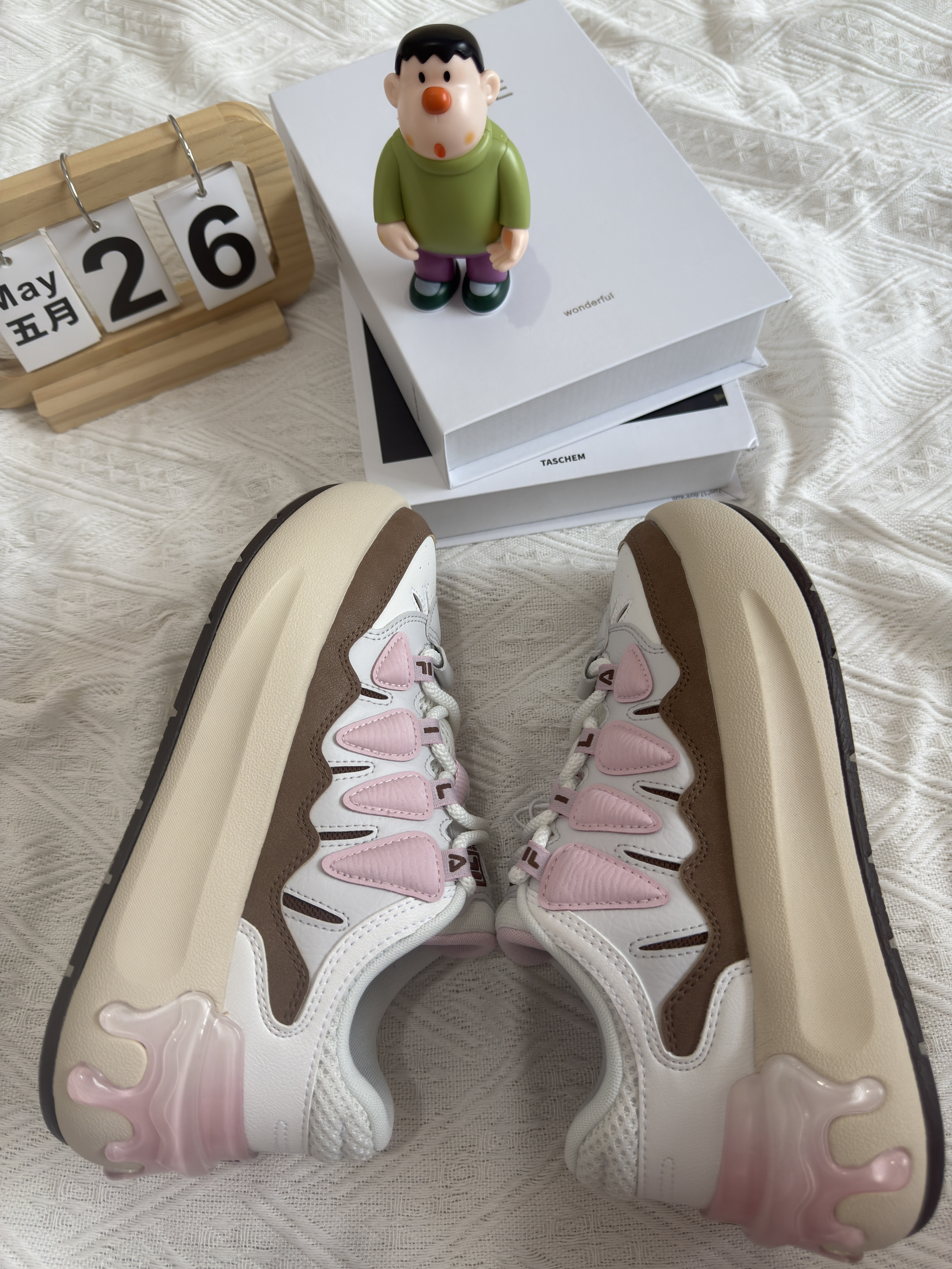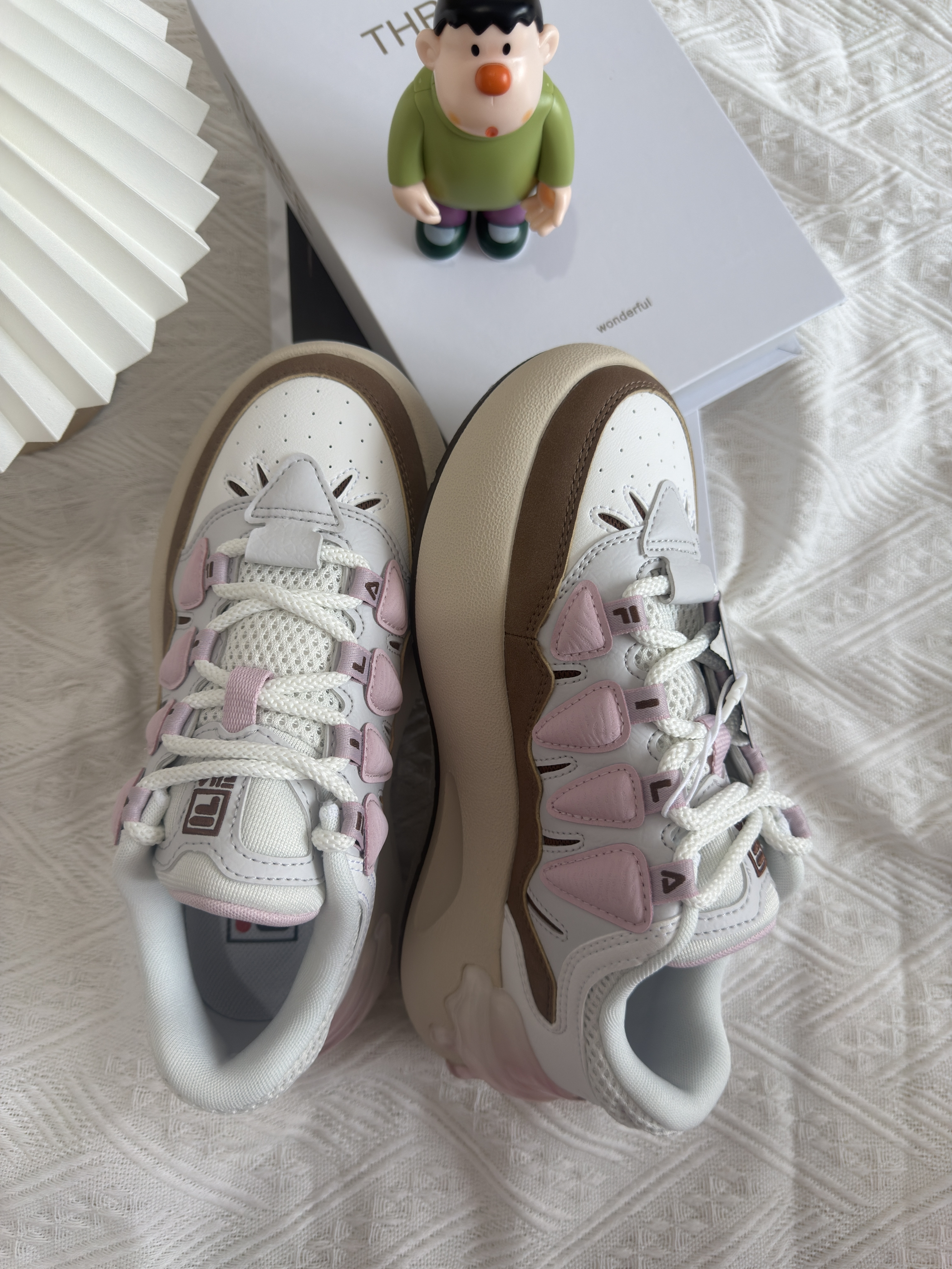 姐妹们快看斐乐这双白棕萝卜鞋! 奶fufu的米白拼棕色调,像奶茶一样温柔✨ 圆滚滚的鞋头超可爱,侧面小logo简简单单但很有辨识度。 搭牛仔裤显得腿很细,配裙子又很元气! 鞋面有透气孔也不会闷脚,稍带点增高底还能偷偷拉比例☺️ 日常出门随便套双袜子就能搭,最近出镜率超高的一双👟 很喜欢🥰哈哈~