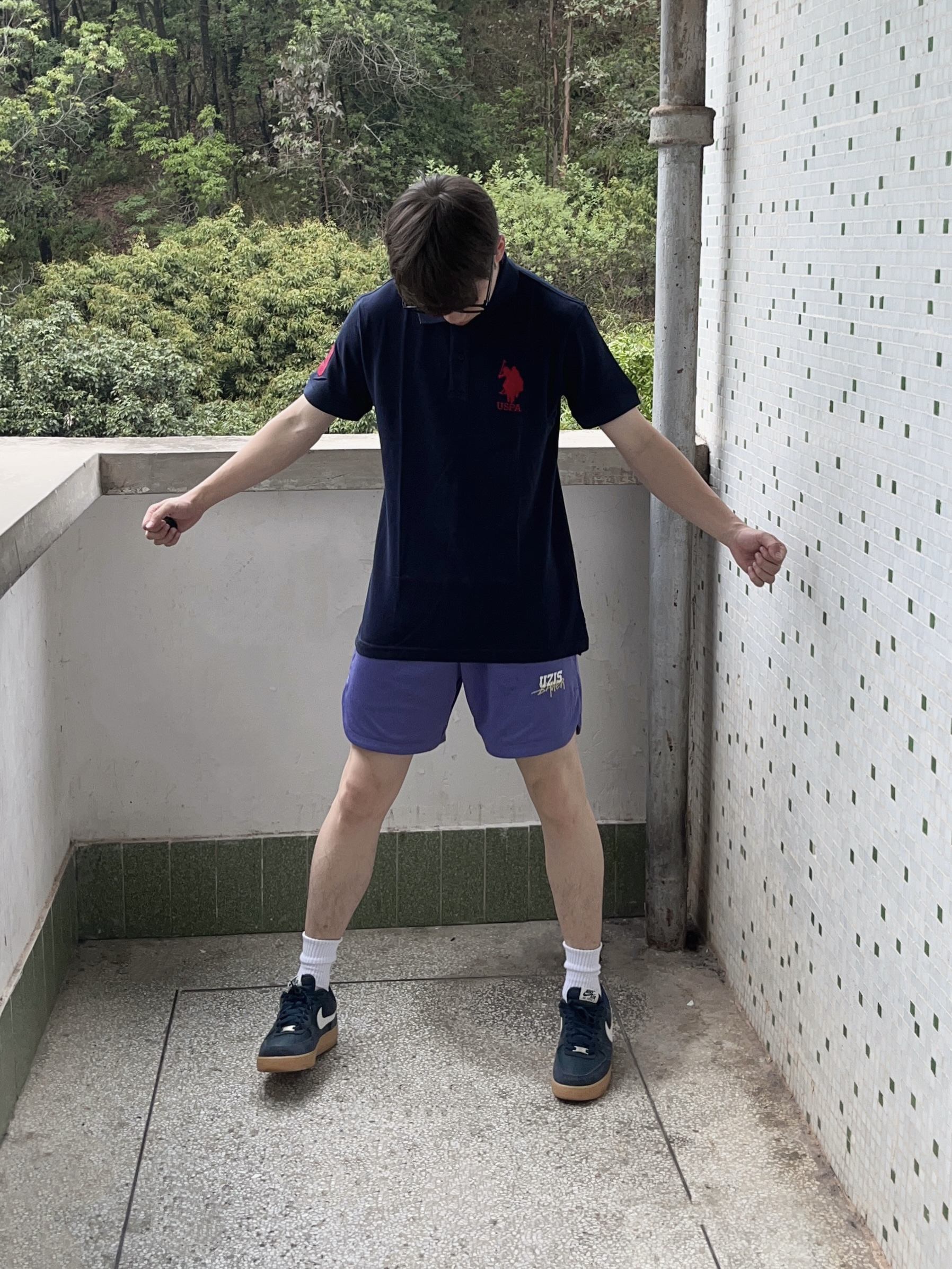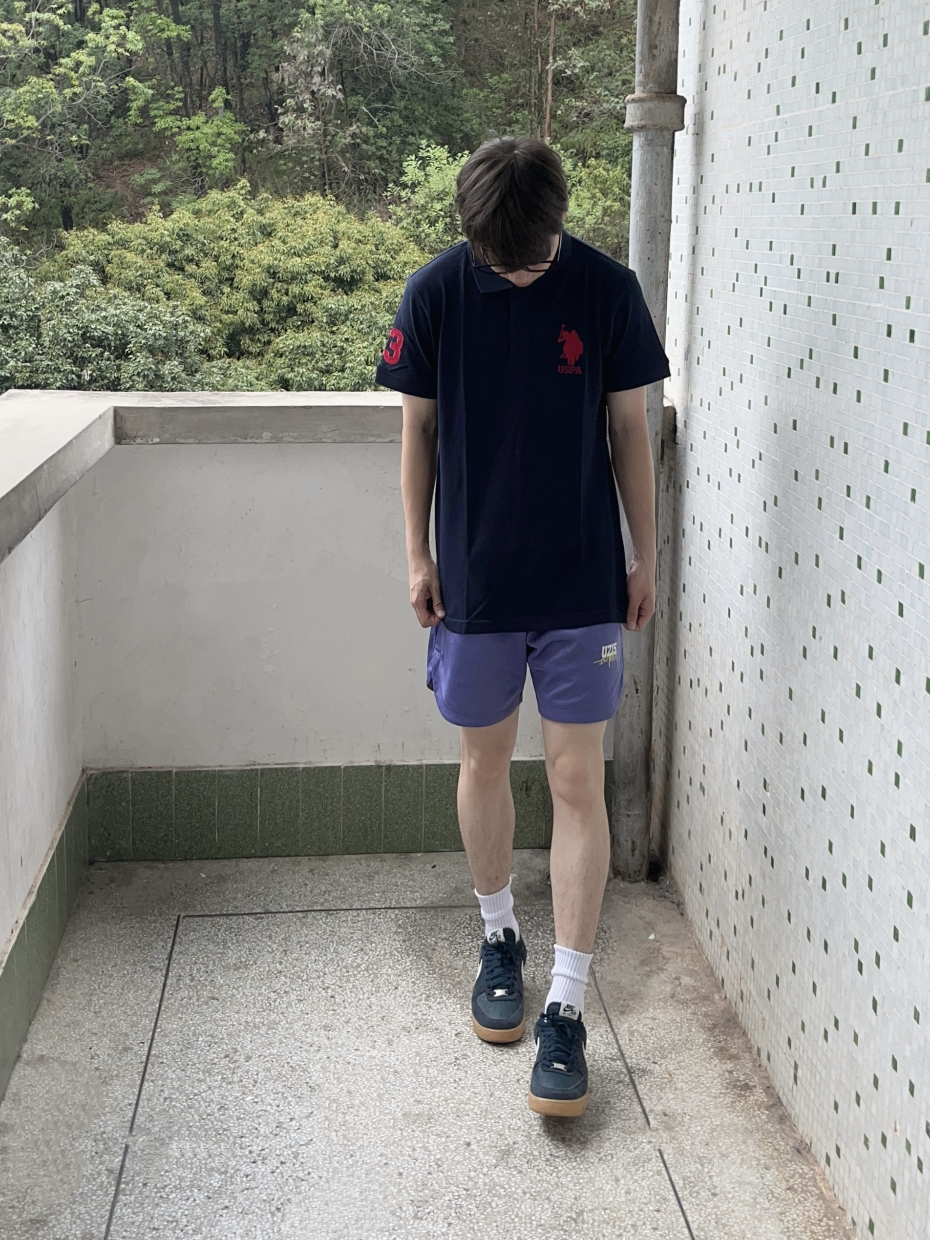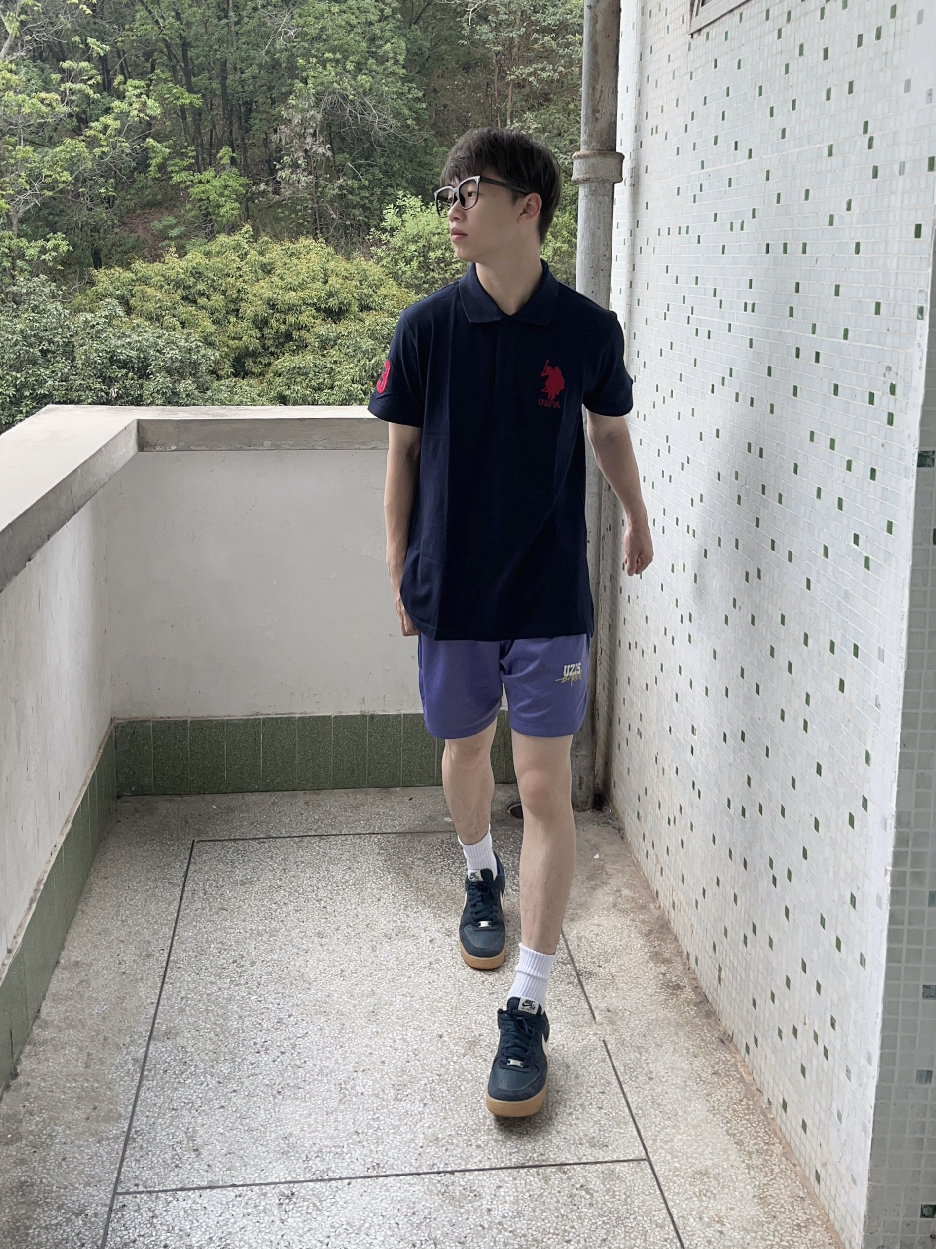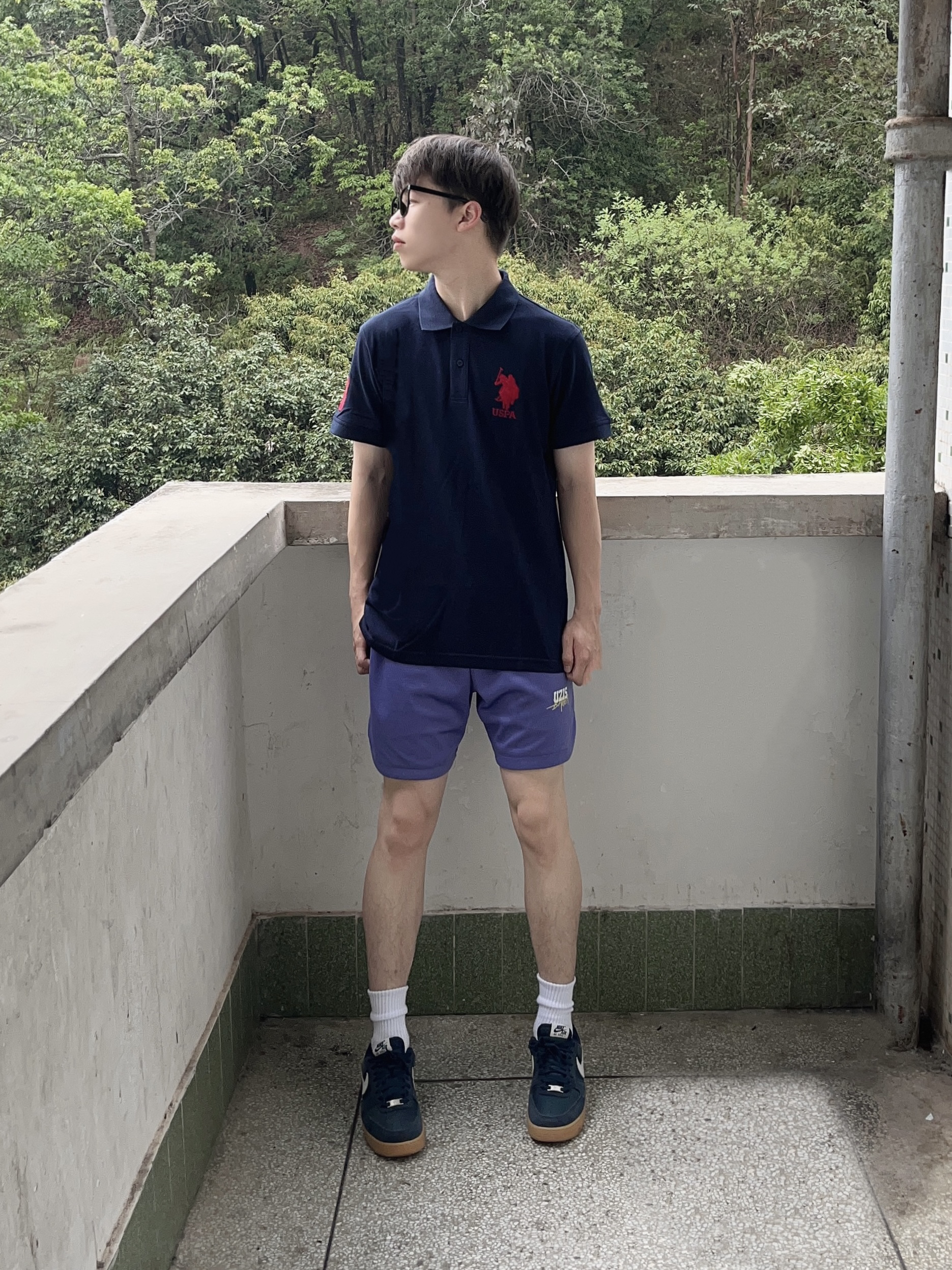 今日份穿搭分享look👀 衣服是 U.S. POLO ASSN. 家的藏蓝色经典Polo衫短袖👔 颜值简约时尚 纯棉面料舒适不紧绷 再搭配一条紫色休闲运动短裤 一套搭配下来 夏日出行百搭又好看
