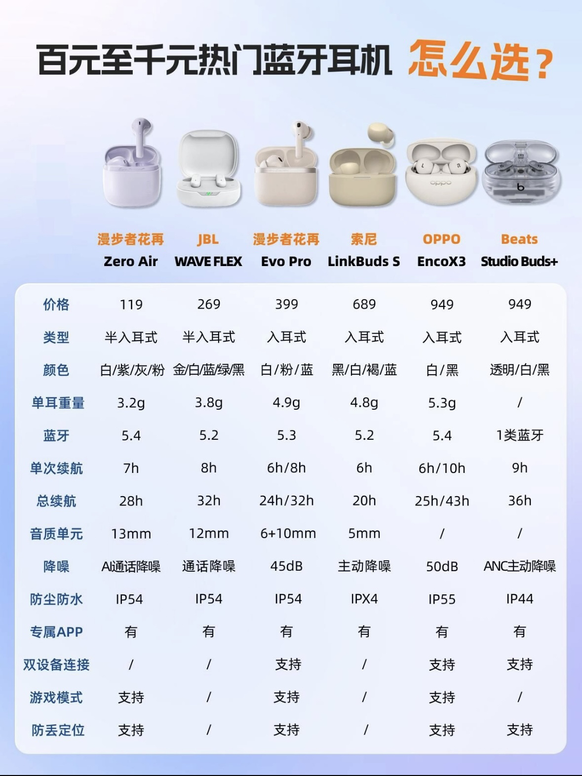 百元至千元热门蓝牙耳机怎么选? 今天给大家带来6款热门蓝牙耳机的详细参数对比,包括2款半入耳式和4款入耳式耳机,从价格到功能全解析! ①漫步者花再 Zero Air @UBLWAVE FLEX ③漫步者花再Evo Pro ④索尼LinkBuds S БОРРО EncoX3 @Beats Studio Buds+ \ 挑选蓝牙耳机时,重点关注以下几点: 1、佩戴舒适性 半入耳式适合长时间佩戴,入耳...