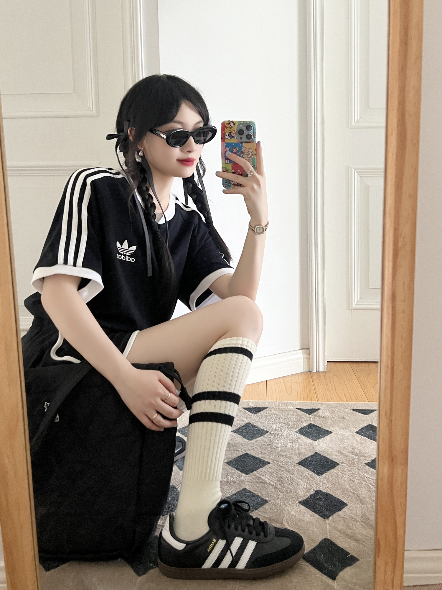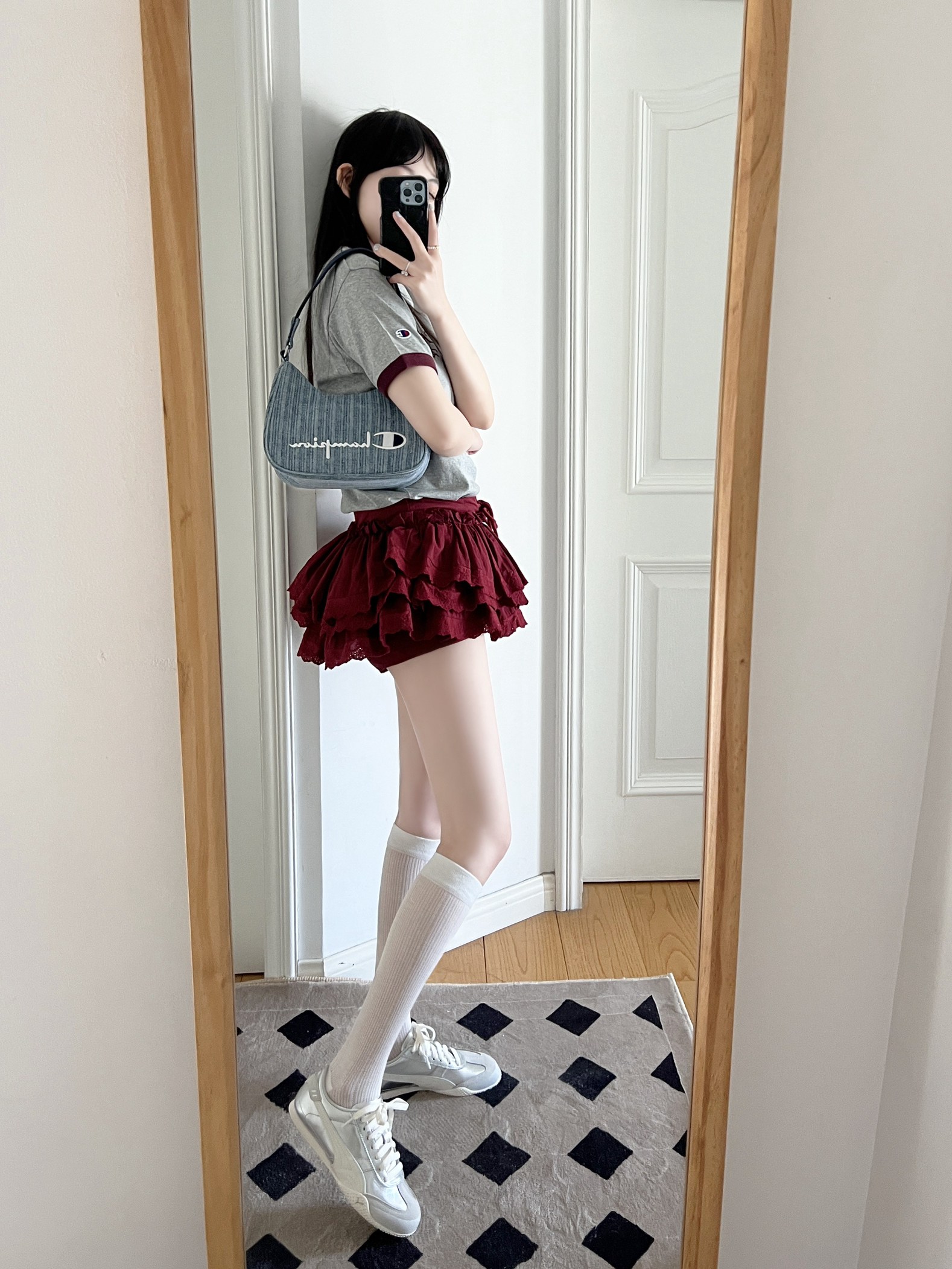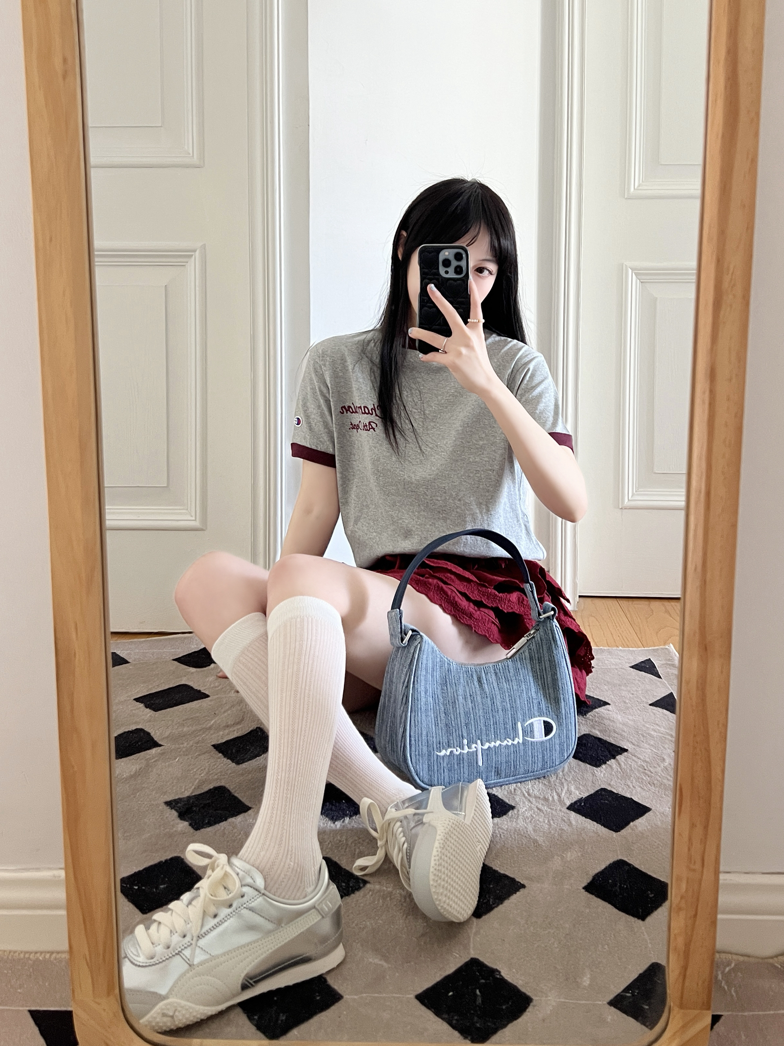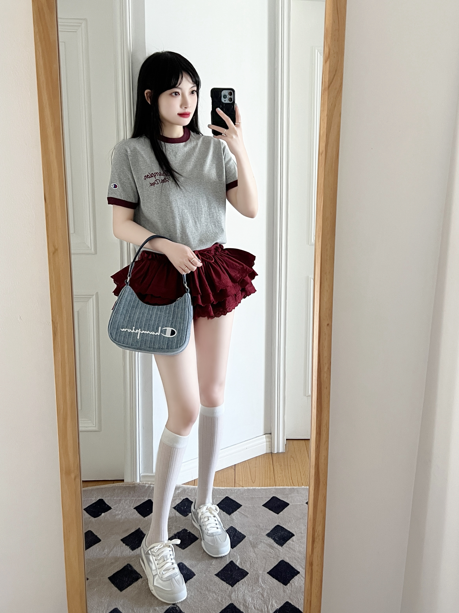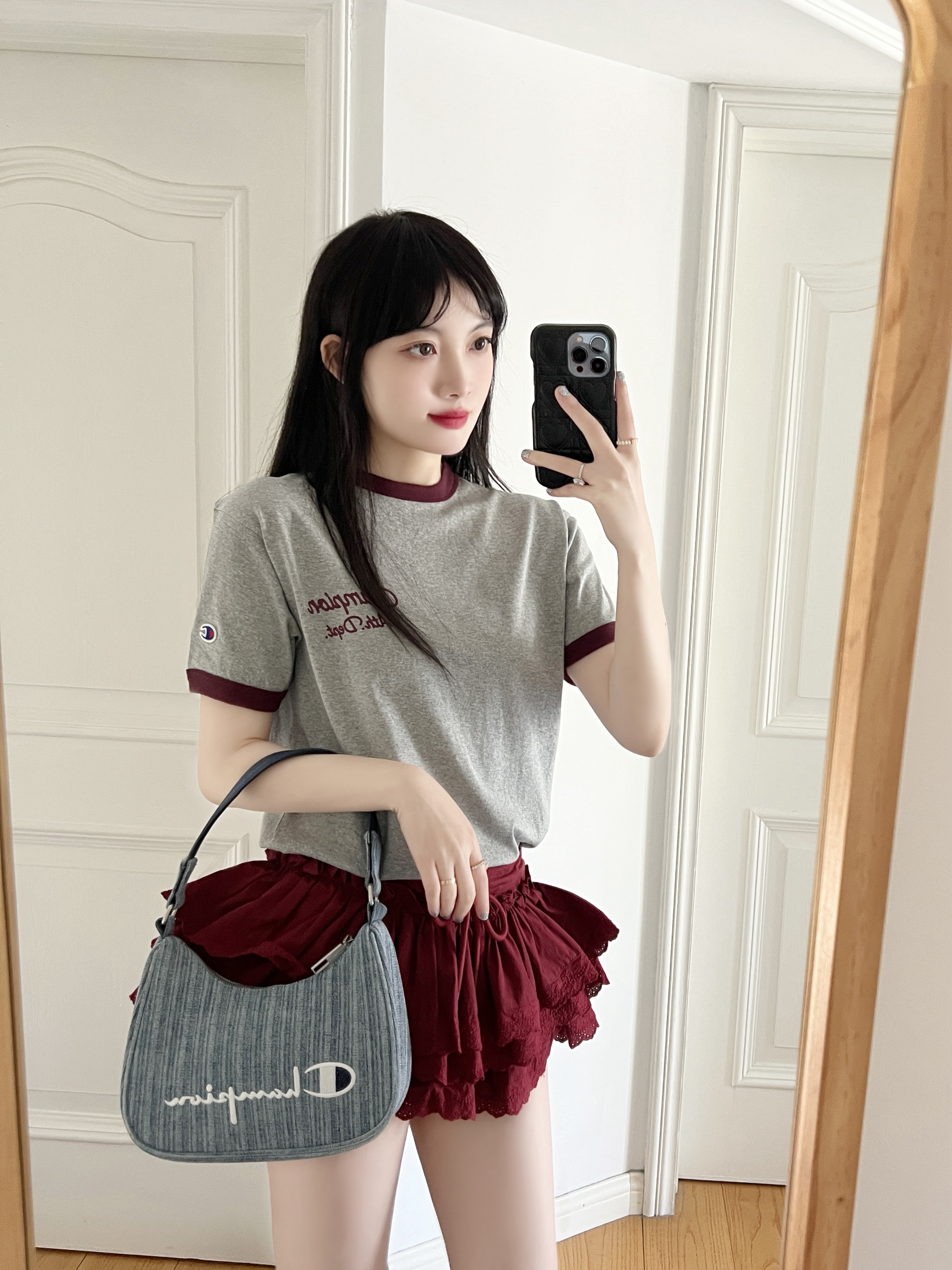 今日份的甜辣穿搭来啦❕ 美式复古T恤🎧➕芭蕾风半身裙🩰 搭配银色德训鞋👟复古可爱 牛仔腋下包包自带时髦感✨ 自带千禧辣妹的氛围感穿搭💕