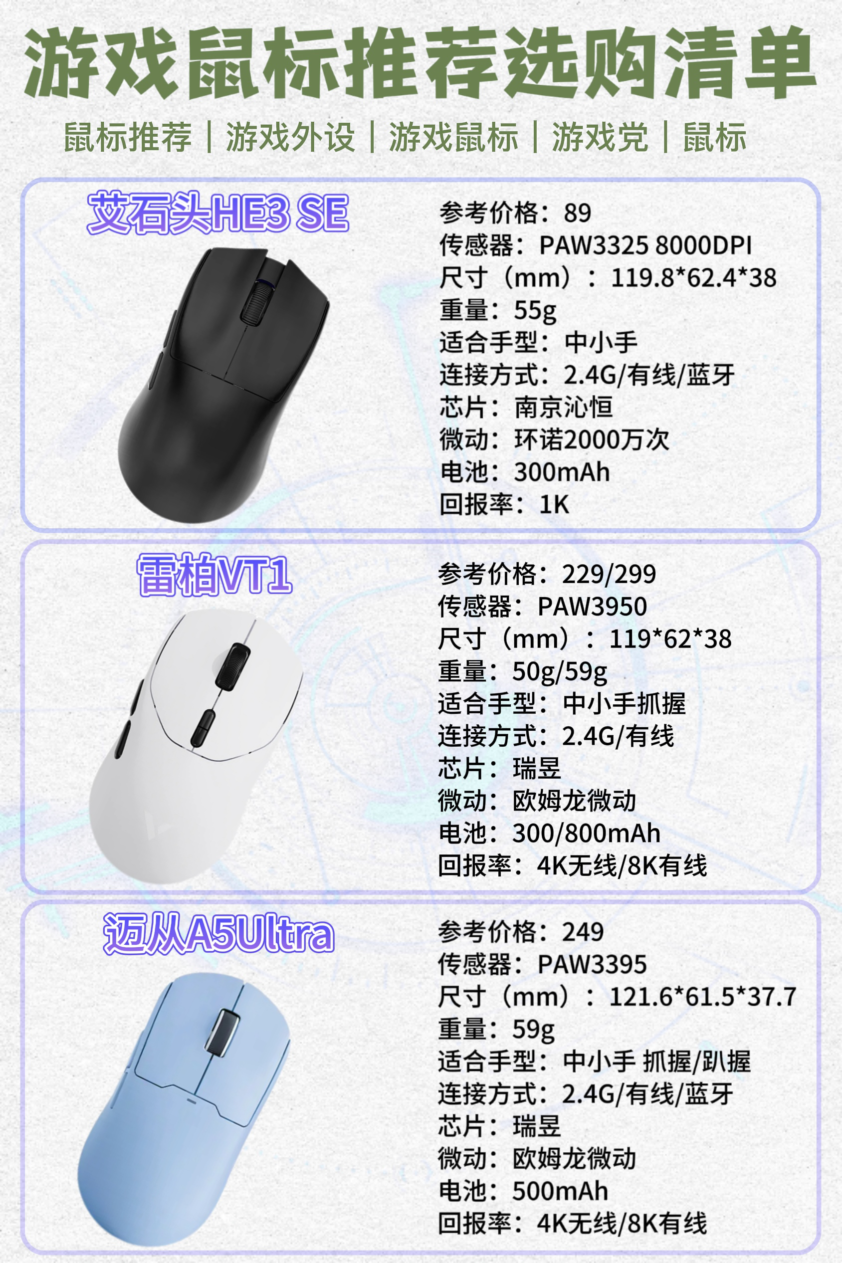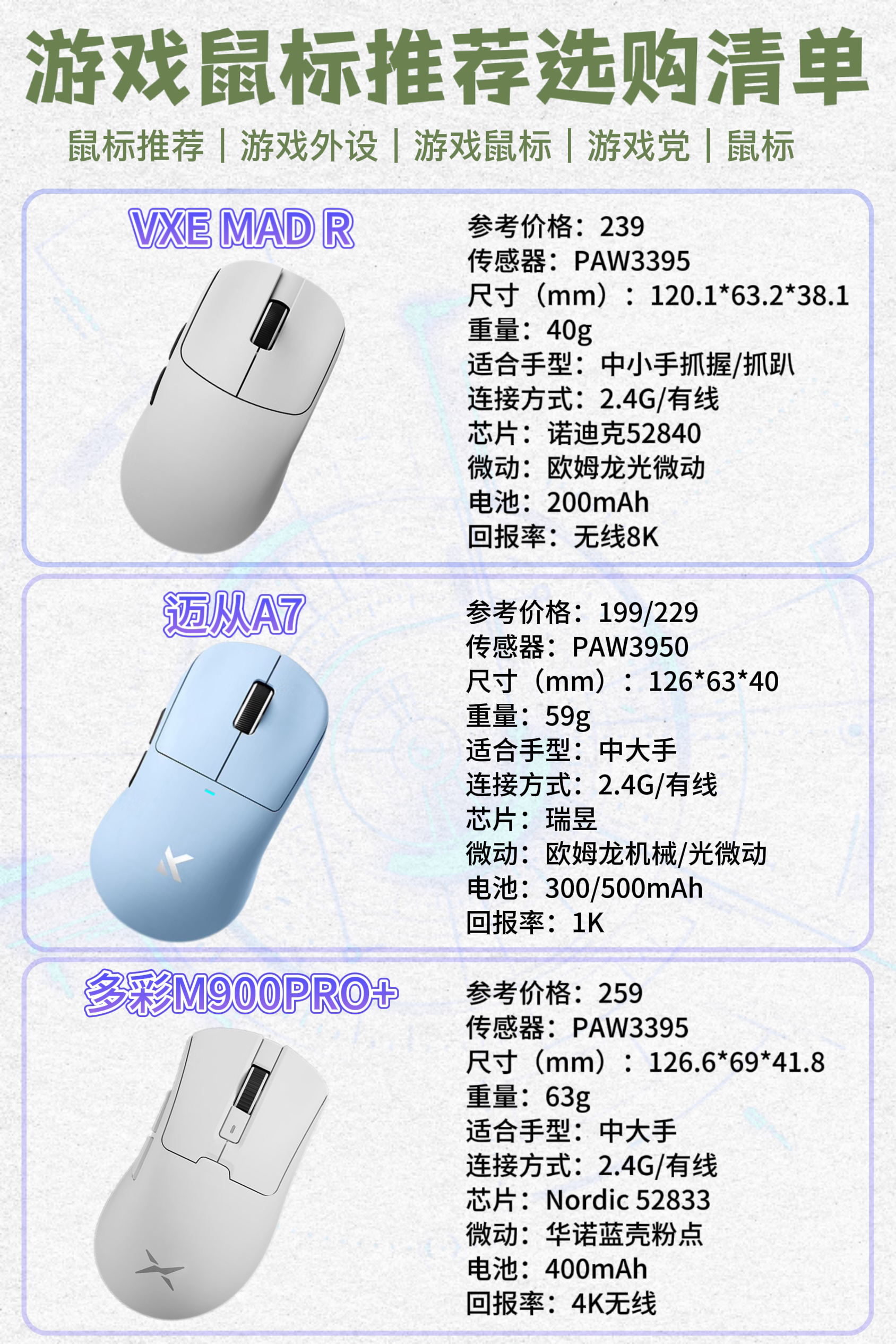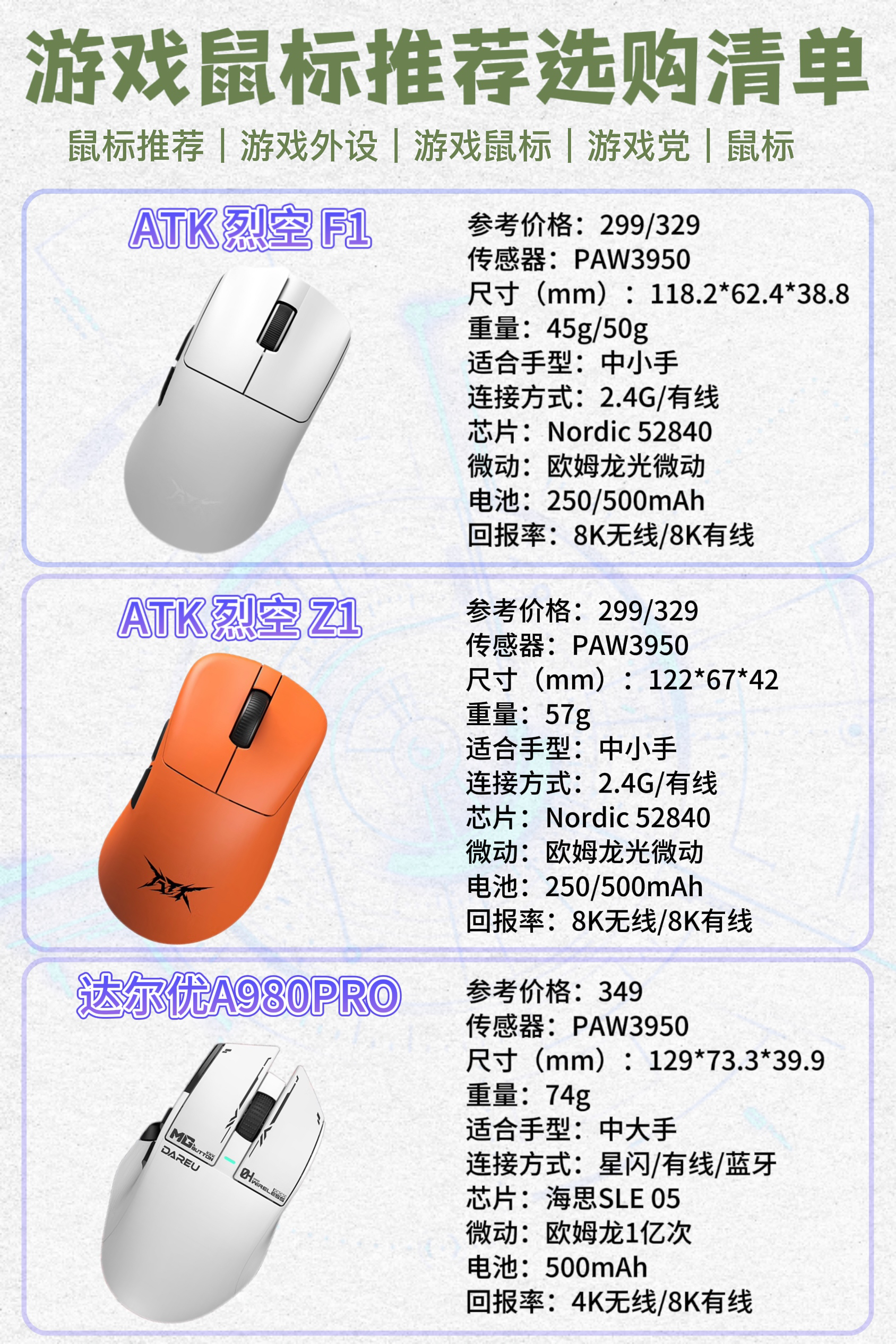 本篇笔记关联了Dareu/达尔优 A980ProMax 三模鼠标 镁合金按键 屏幕显示 回报率 星闪 可充电 彩屏 大手 黑色、ATK 烈空 F1 PRO 双模鼠标 有线+2.4G连接 无孔轻量化 游戏电竞办公 人体工学裂空 白色、Rapoo/雷柏 VT1PRO 双模鼠标 有线+2.4G连接 轻量化设计 原相 可编程 游戏引擎 中小手 白色等商品,为用户提供真实的使用体验和购买参考。