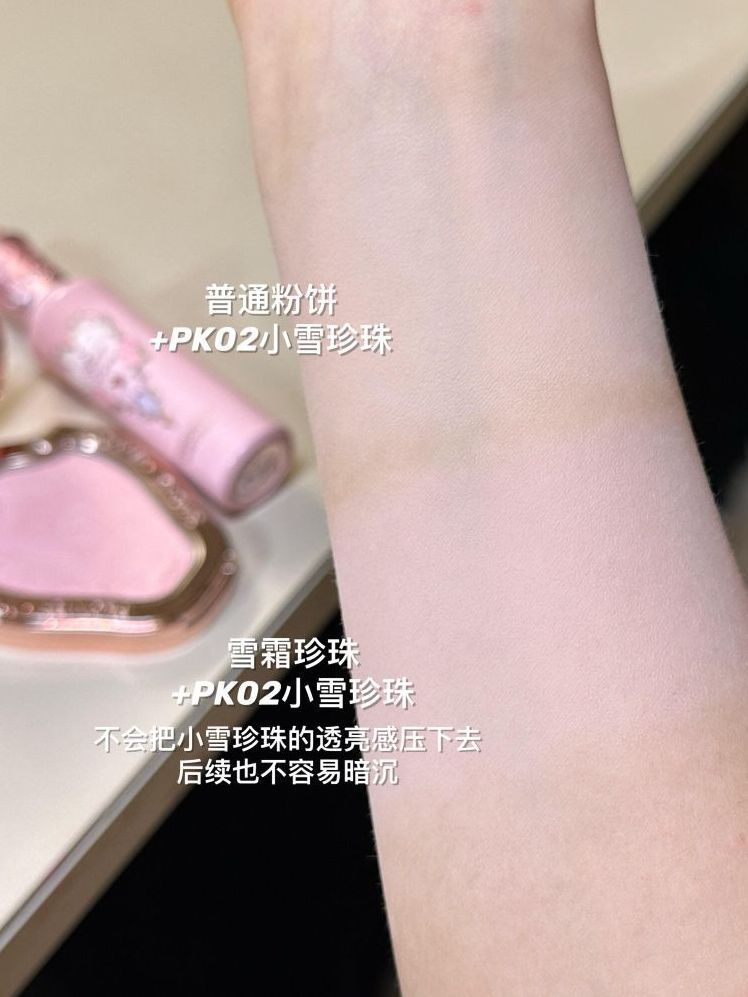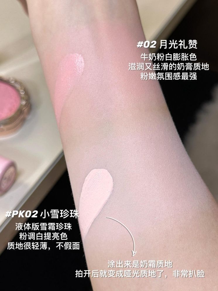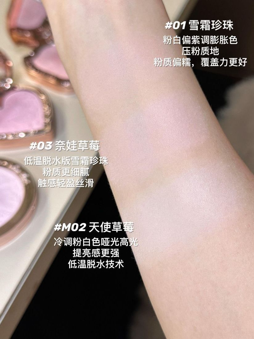 花知晓你是什么膨胀色专业户吗? 出了这么多粉粉嫩嫩的膨胀提亮色! 每个特点都不同!这篇就给大家对比一下! ✨独角兽系列腮红 01雪霜珍珠 粉白偏紫调膨胀色玉粉质地 粉质偏糯,覆盖力更好👍 ✨仲夏夜系列提亮遮瑕液 PK02小雪珍珠 液体版雪霜珍珠,粉调白提亮色💡 涂抹出来是奶霜质地, 拍开后变为扒脸的哑光质地, 非常轻薄 ✨奈娃小铺系列腮红 03奈娃草莓 低温脱水版雪霜珍珠粉质更细腻 触感轻盈...