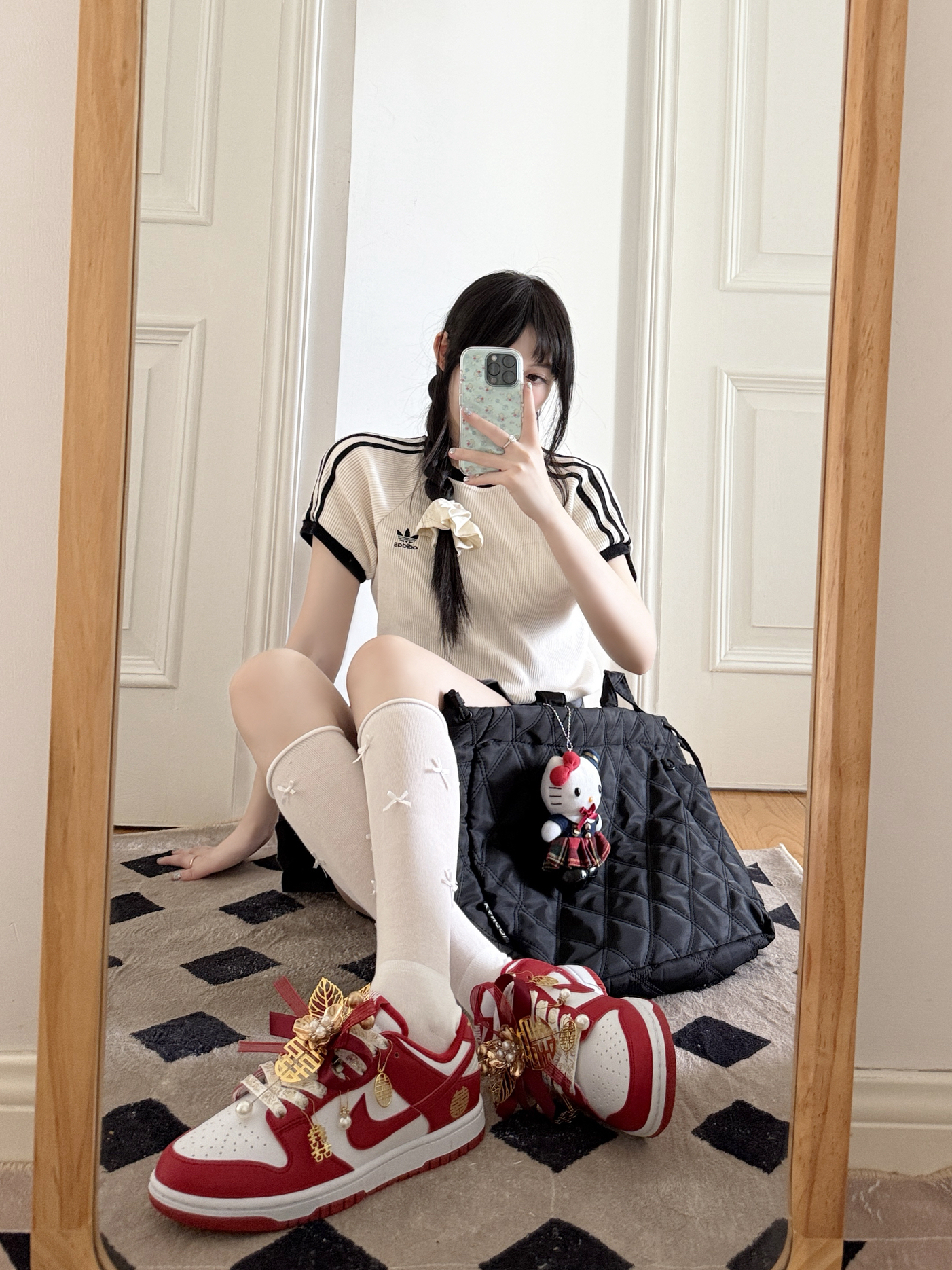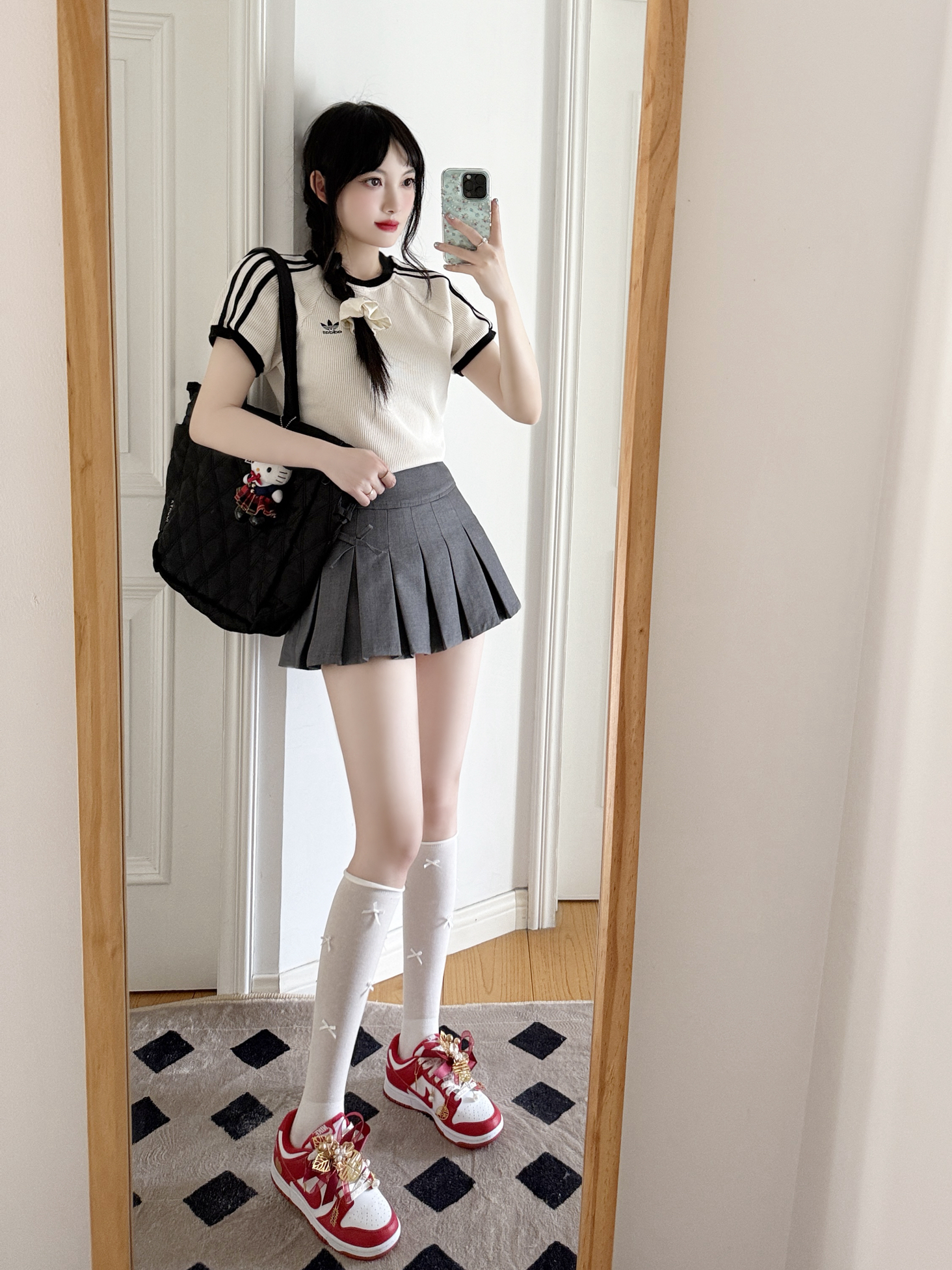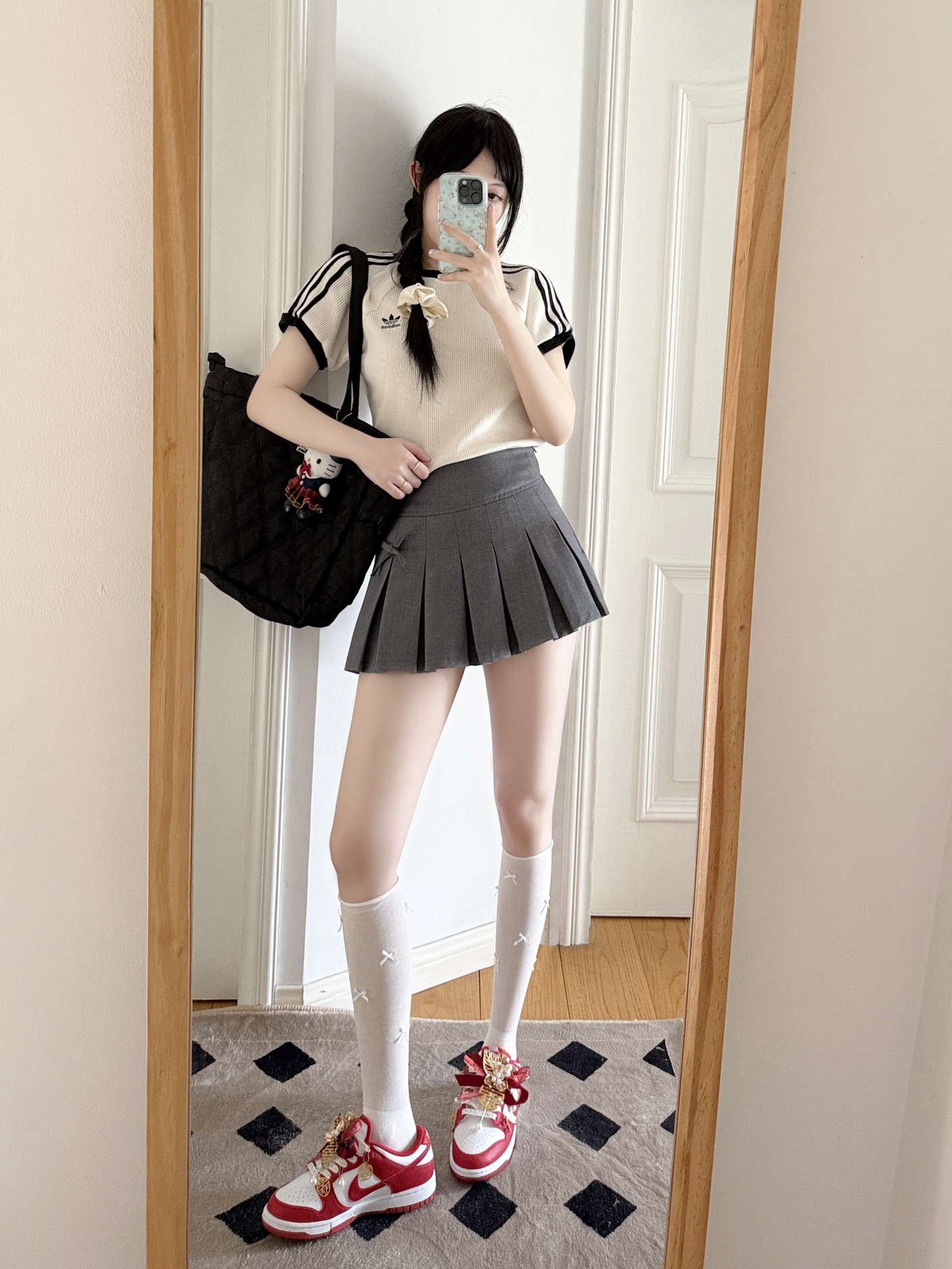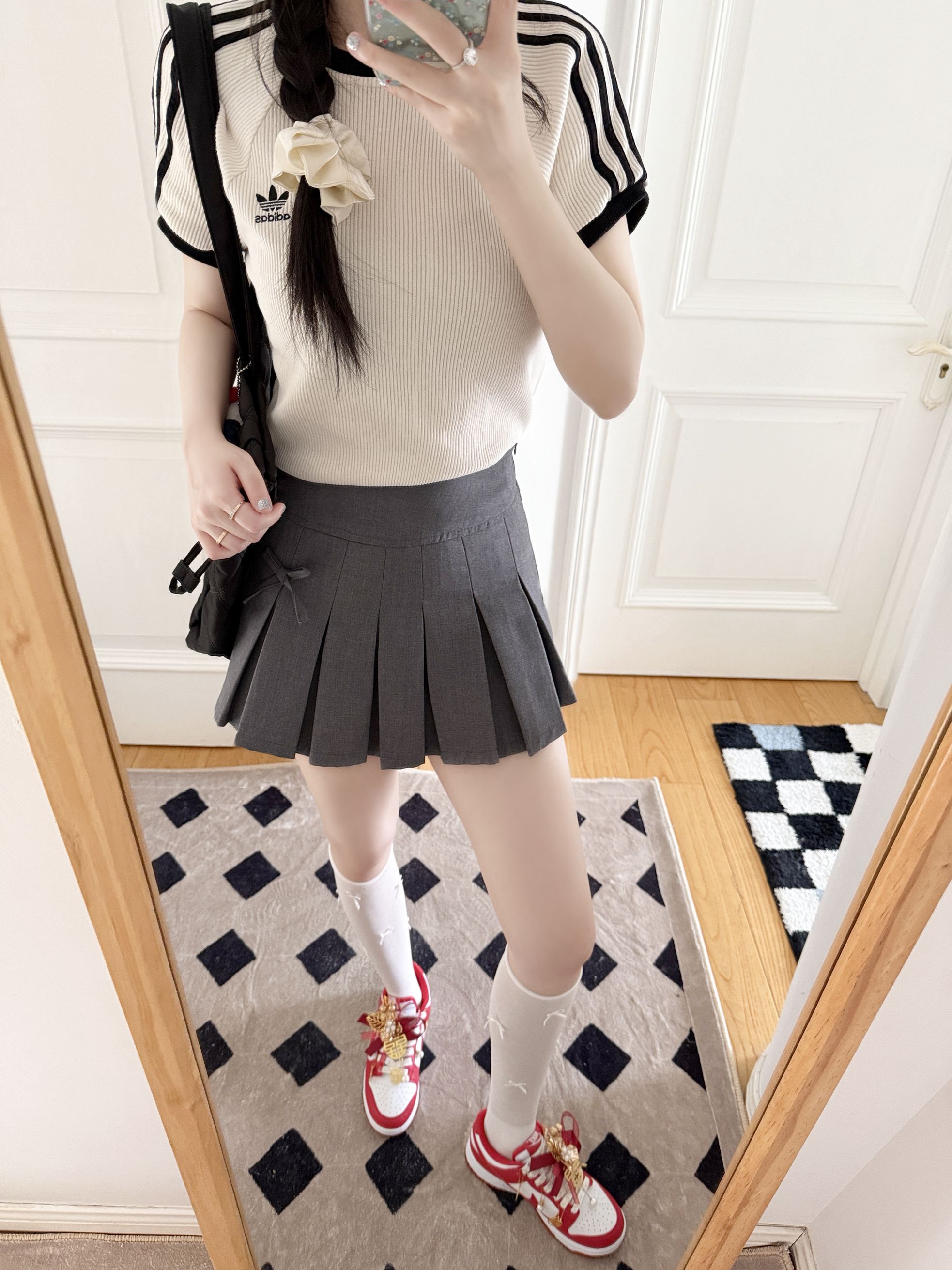 今日份的adidas girl穿搭来啦❕ 美式复古T恤🎧➕灰色百褶裙📖 搭配这双定制款的nike婚鞋👟 如果搭配敬酒的秀禾服会很美吧❤️🔥
