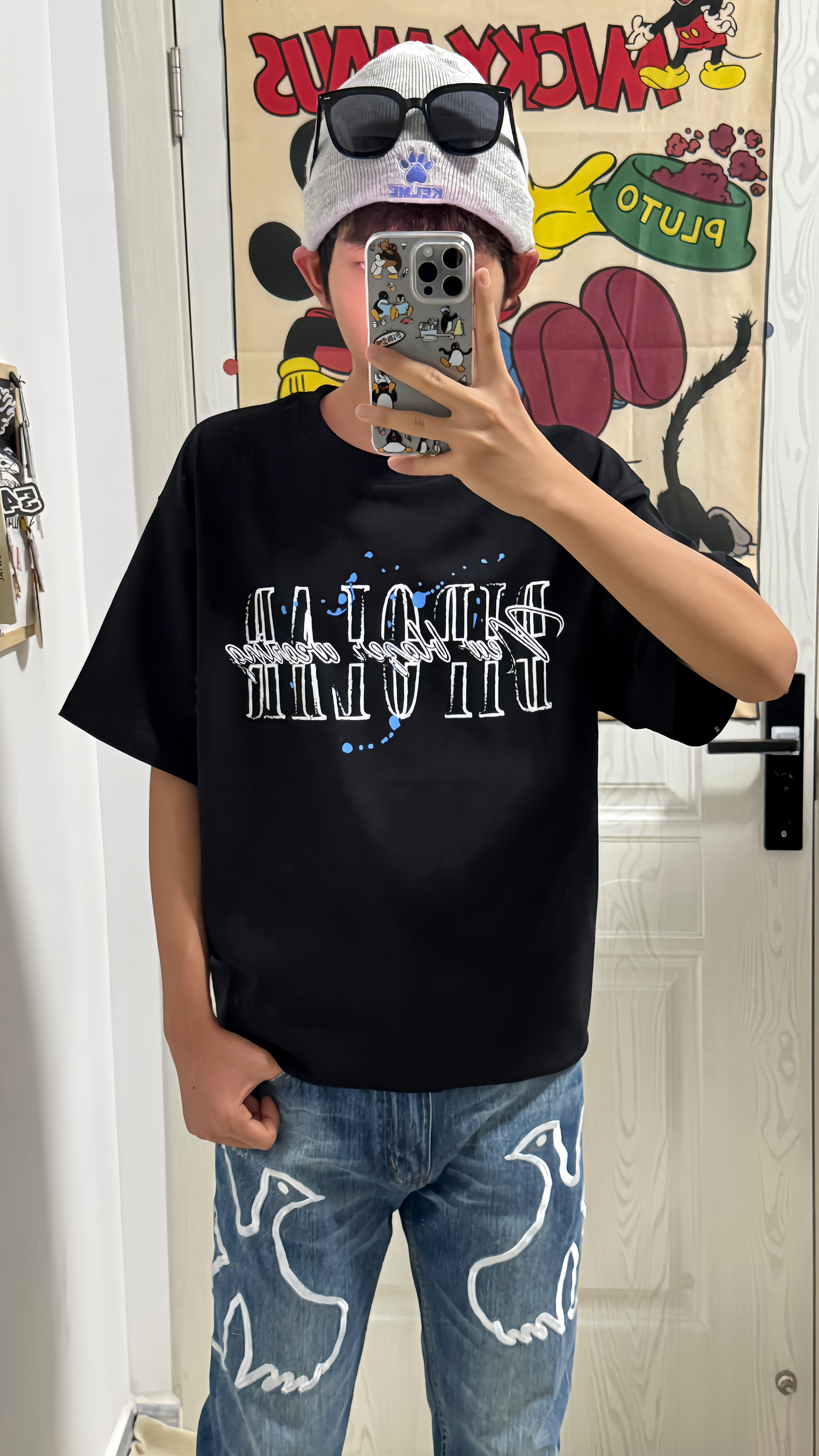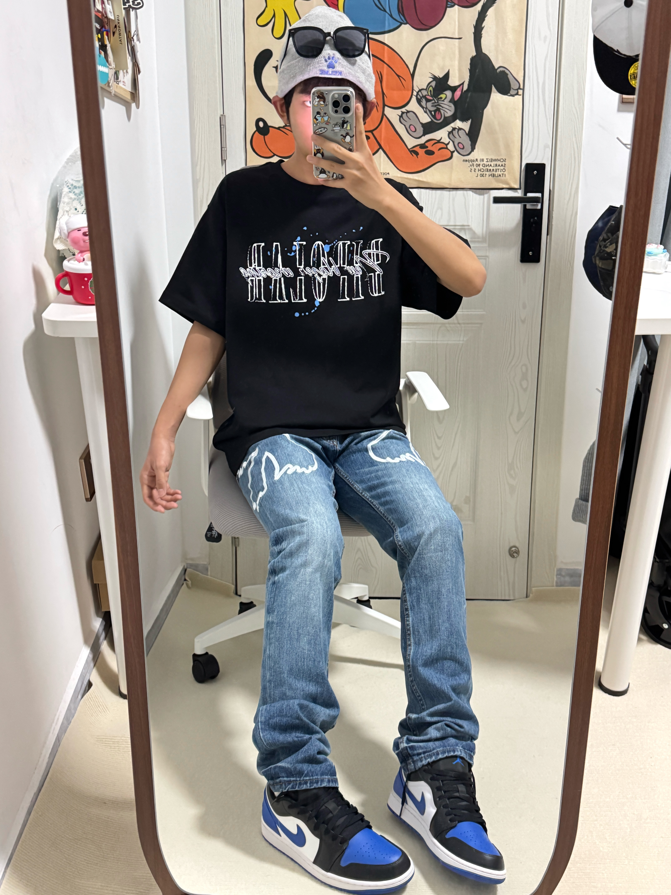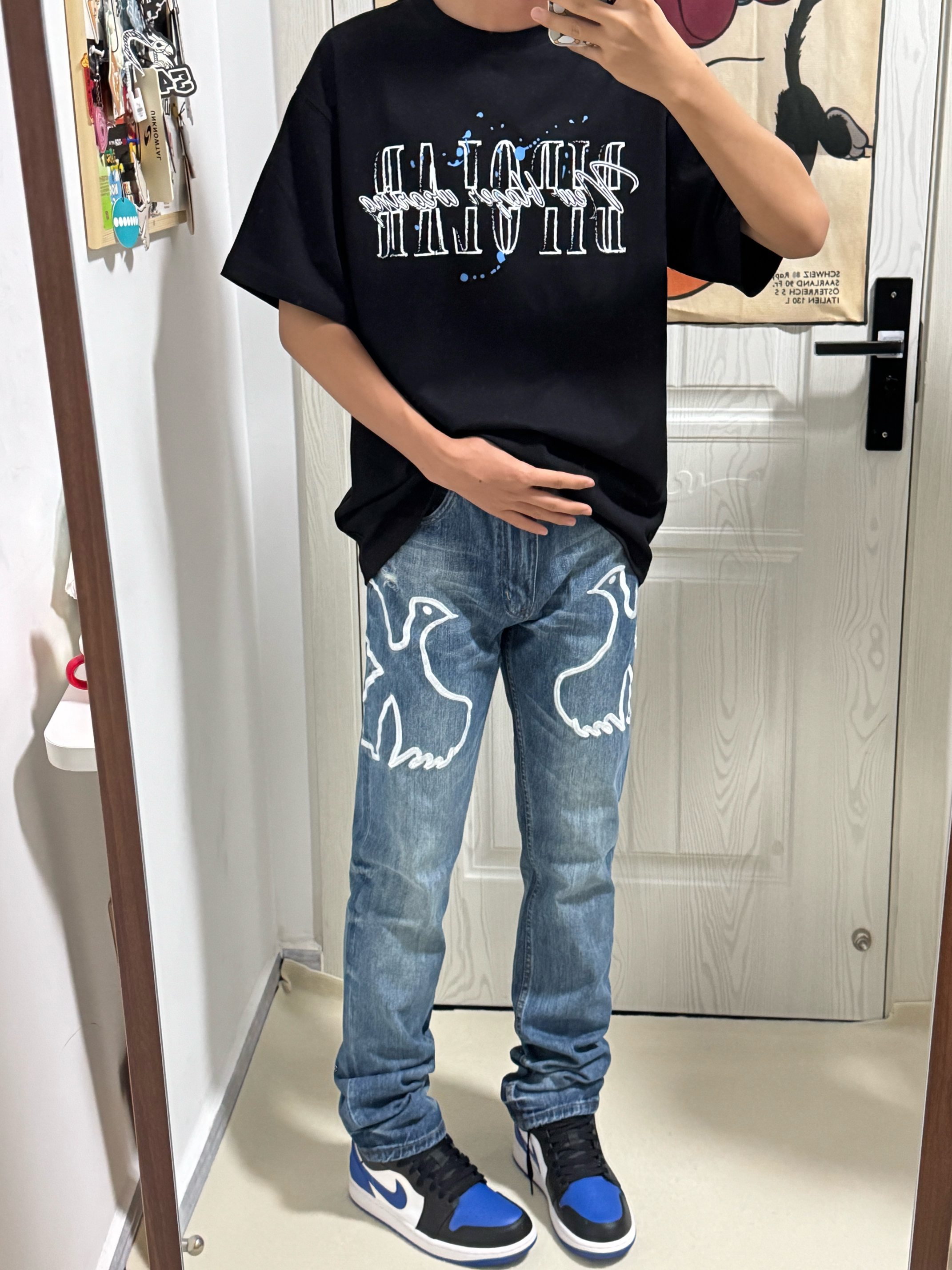 黑色🖤泼墨印花T恤➕浅蓝色鸽子🕊️牛仔裤 搭配AJ1蓝白🔵篮球板鞋