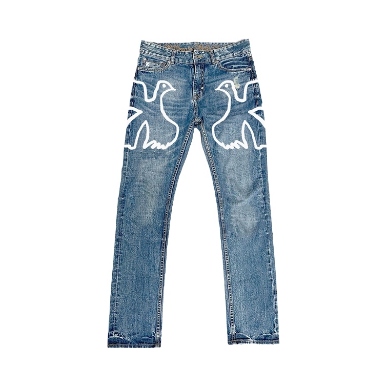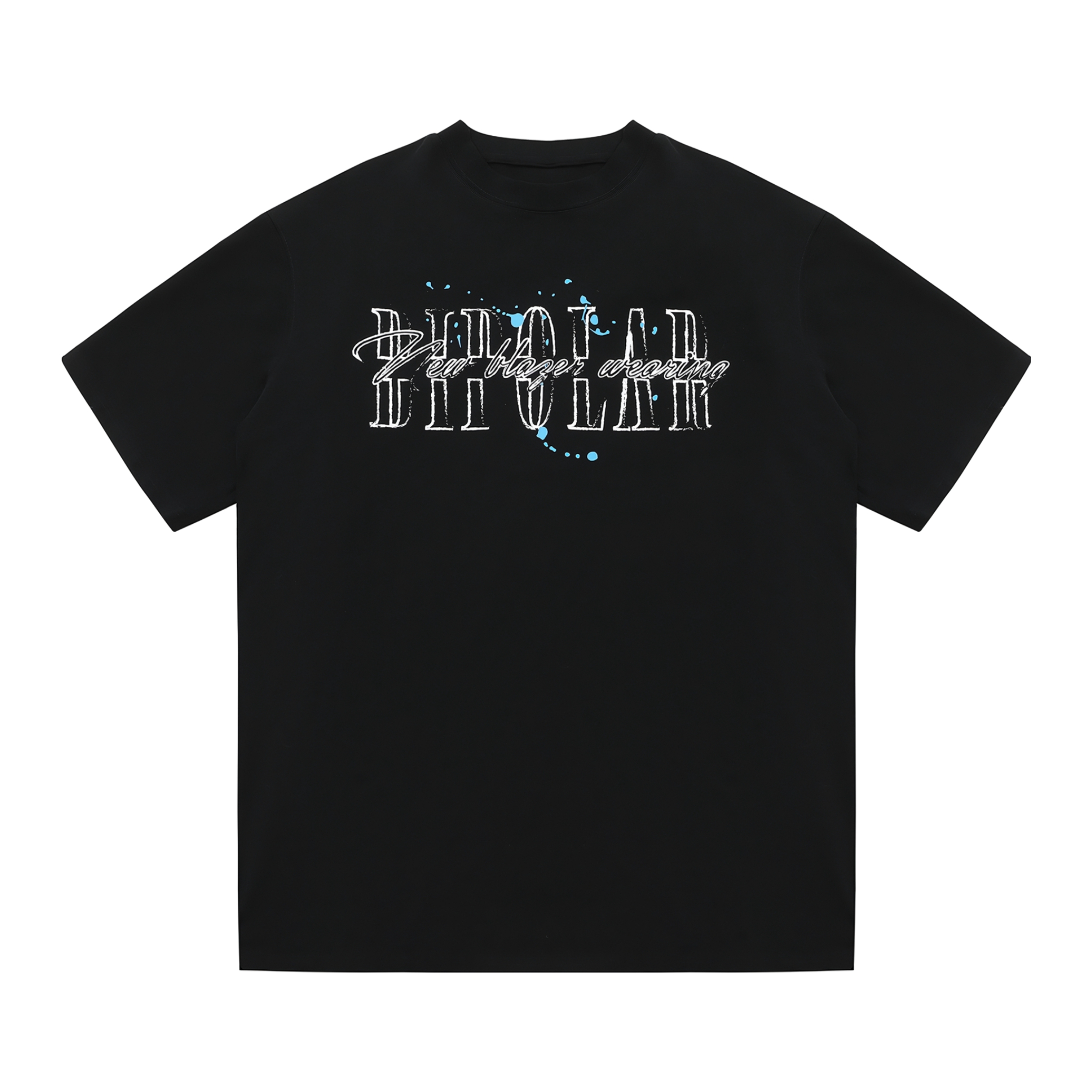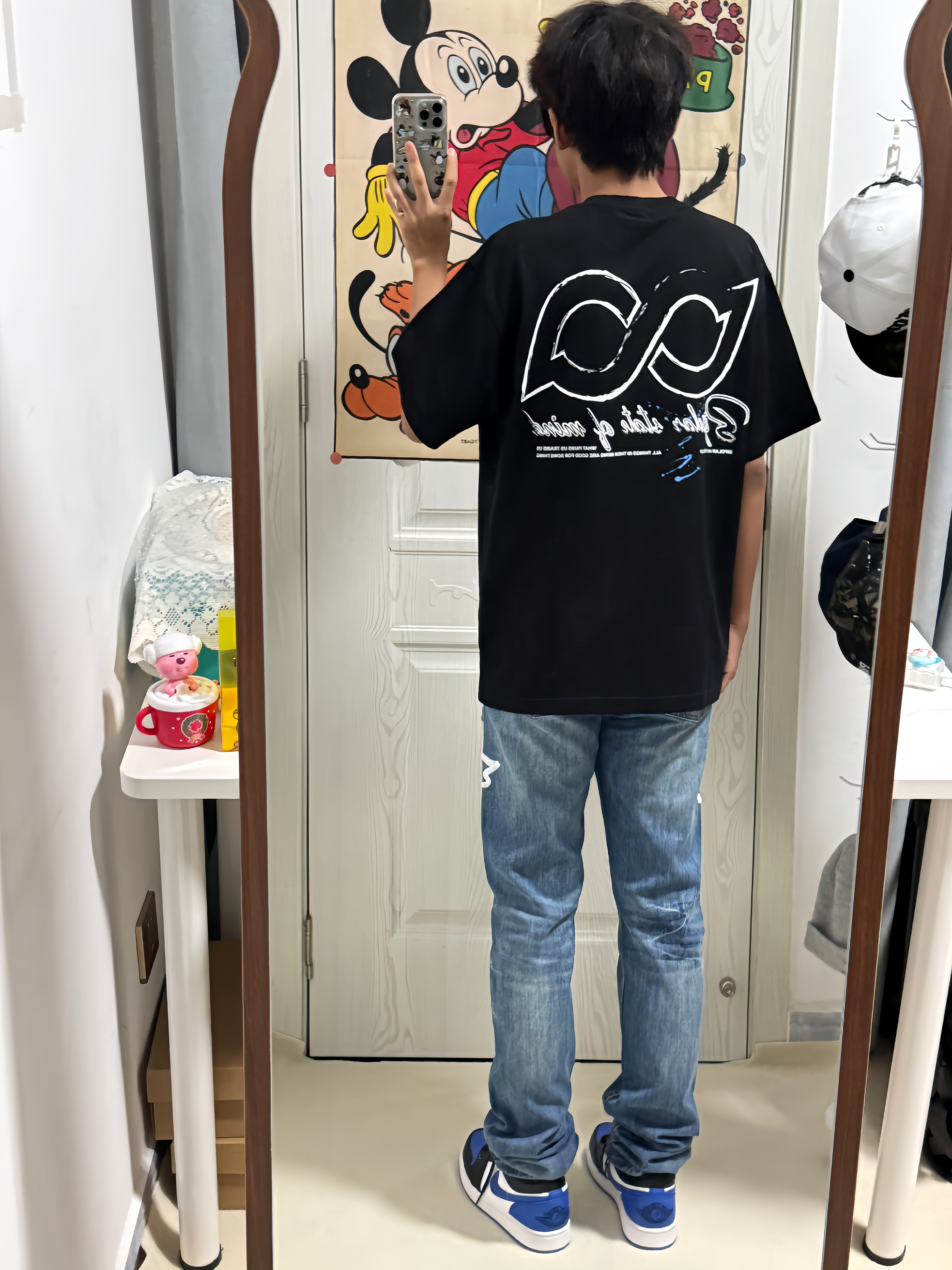 黑色🖤泼墨印花T恤➕浅蓝色鸽子🕊️牛仔裤 搭配AJ1蓝白🔵篮球板鞋