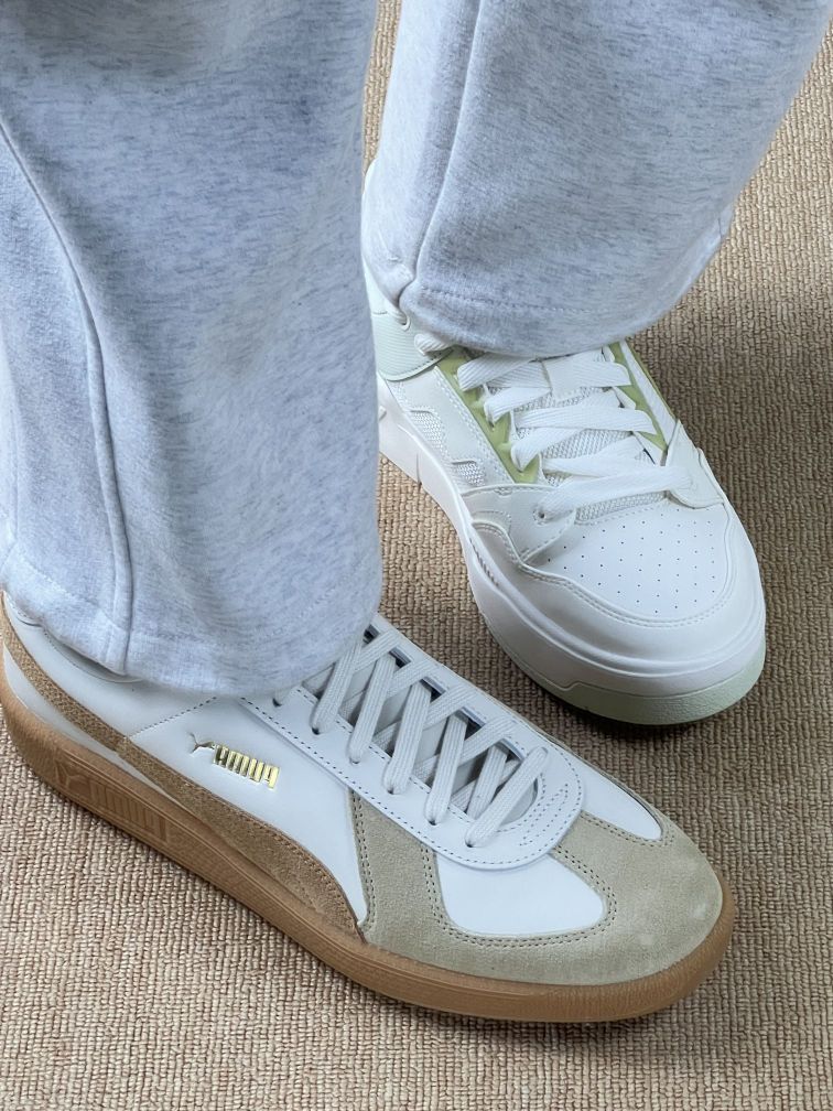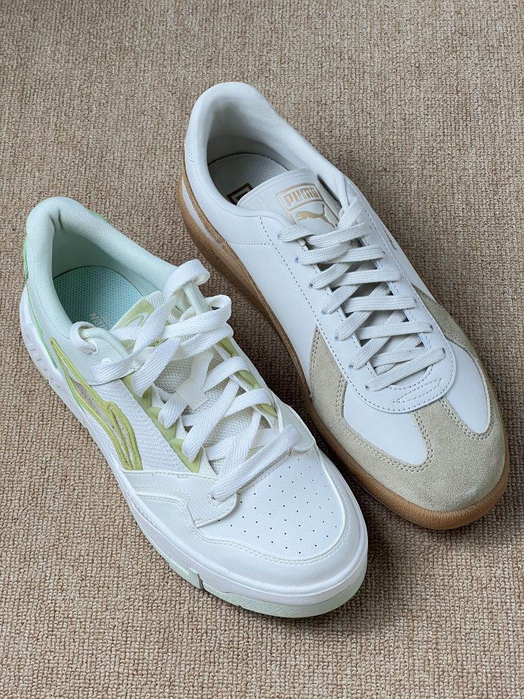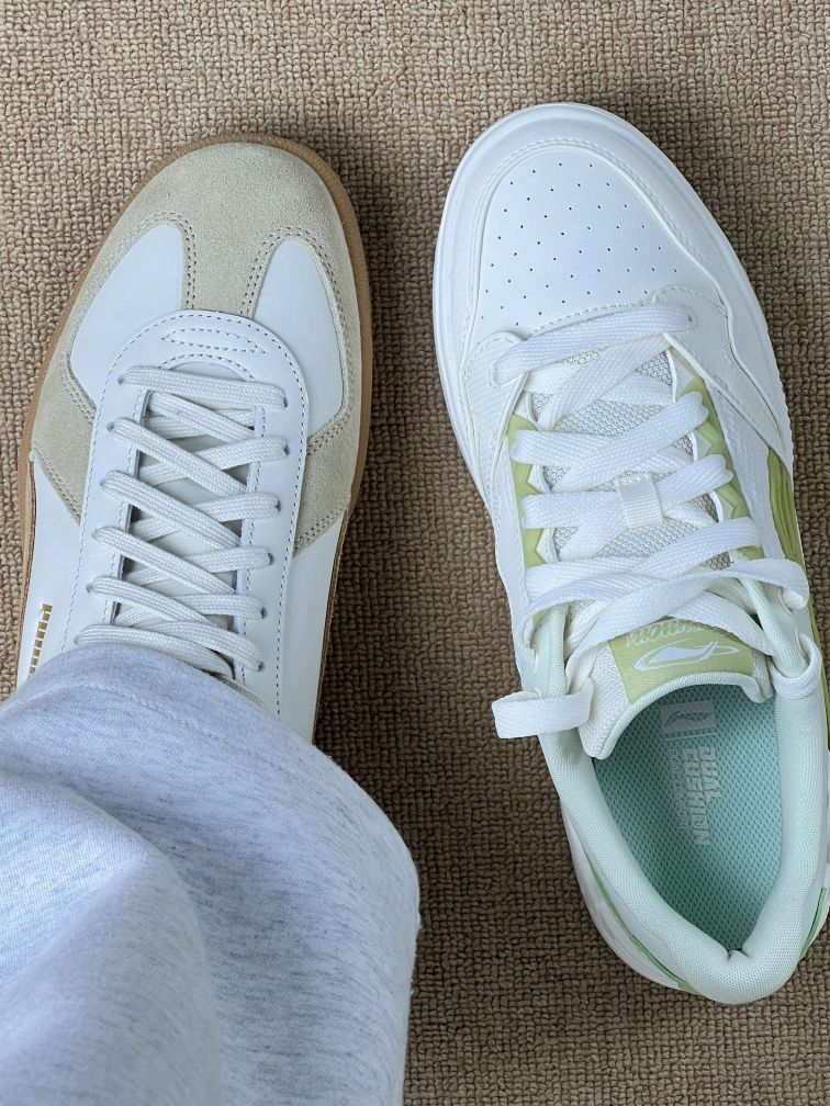 材质对比 PUMA Army Trainer雪白色采用皮革+绒面革拼接鞋面,质感挺括有光泽,生胶大底纹路清晰,耐磨抗造但略微偏重。李宁COMMON 80s米白绿则是合成革+牛剖层皮革组合,鞋面更轻盈,橡胶+EVA混合大底弹性不错,但边缘车缝线略粗糙。 上脚感受 PUMA的德训鞋型贴地感强,中底偏软但支撑性足,走久了脚掌不会酸,但鞋头空间略窄,宽脚需选大半码。李宁的DUAL CUSHION双层缓冲...