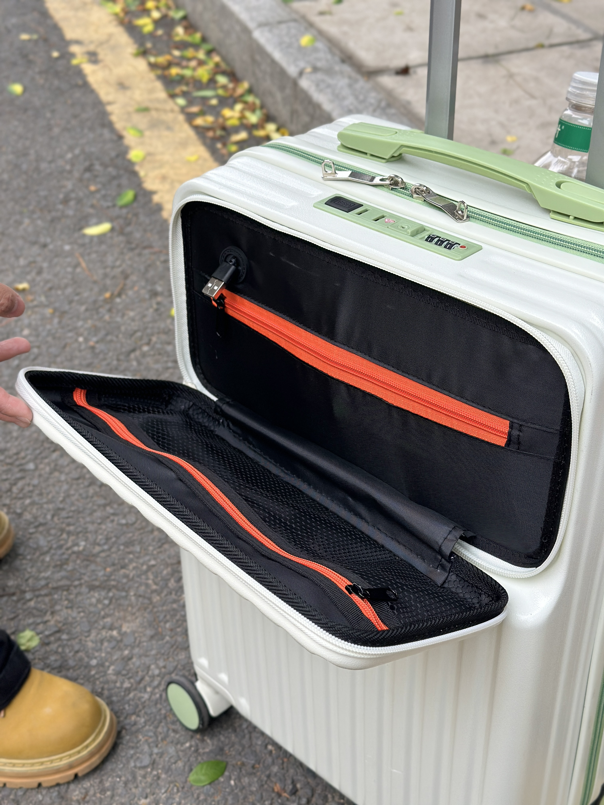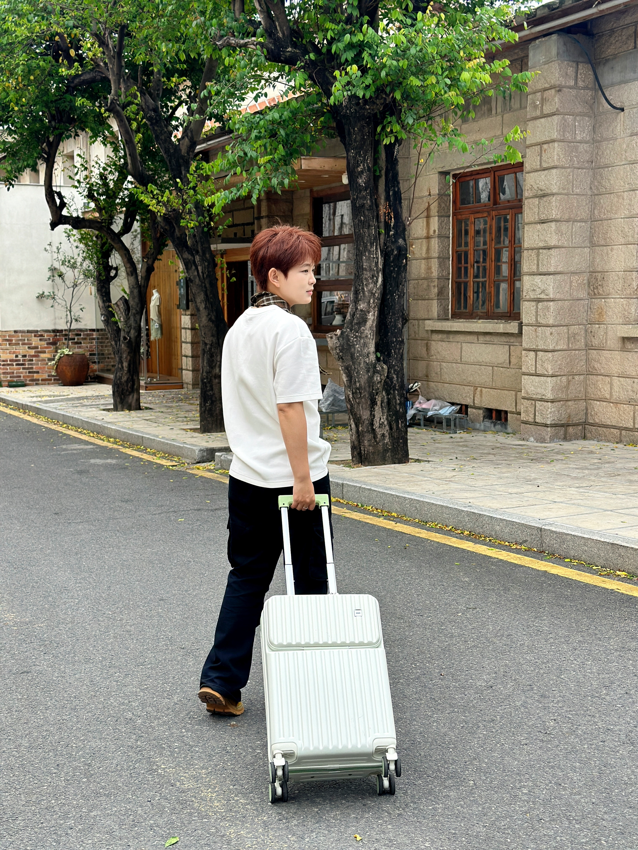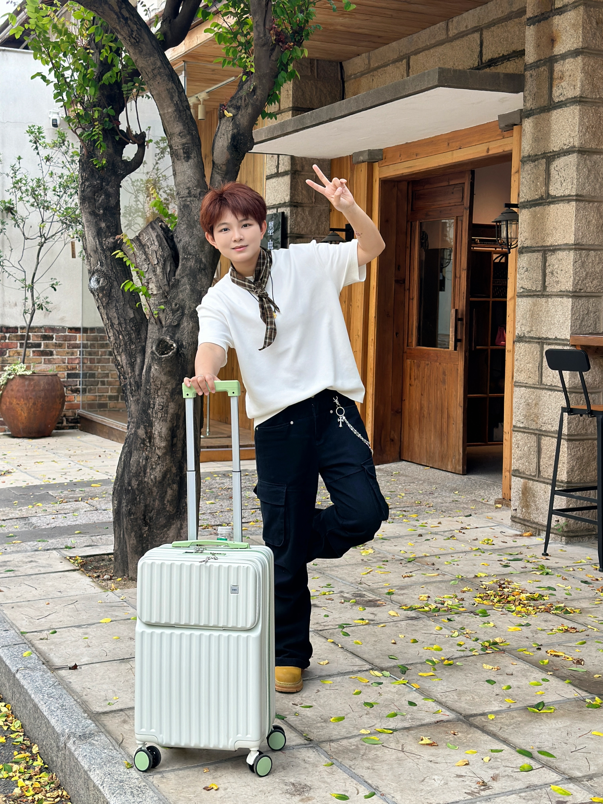 宝子们🥰 分享一下我最近出门超爱的一套穿搭和新宠行李箱! 咱就是说,这件白色T恤搭配黑色工装裤,简约又不失潮流感,脖子上再系个格子小围巾,直接氛围感拉满✨ 脚上蹬的这双黄色鞋子,也是点睛之笔,超吸睛! 重点来啦!这个白色行李箱我真的爱惨了😍 清新的绿色拉链和把手,设计感十足。它还有专门放水杯的地方,超级贴心~打开里面分区合理,能把东西规整得明明白白。轮子顺滑,拉着一点不费劲。有了它,出门旅行都...