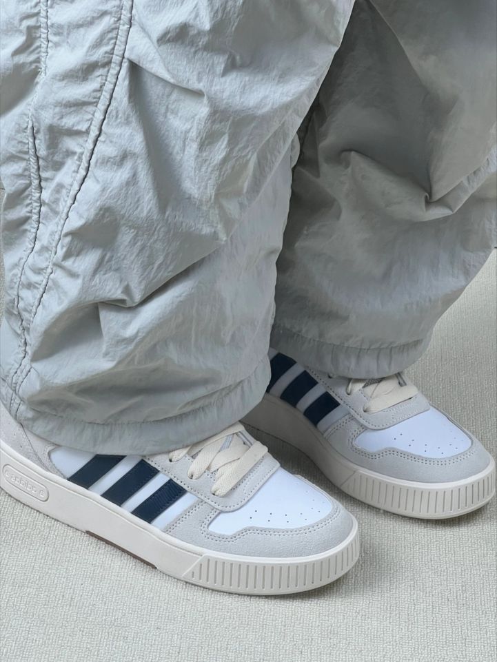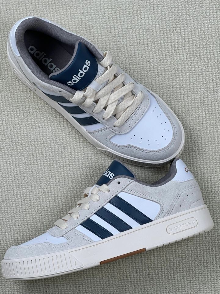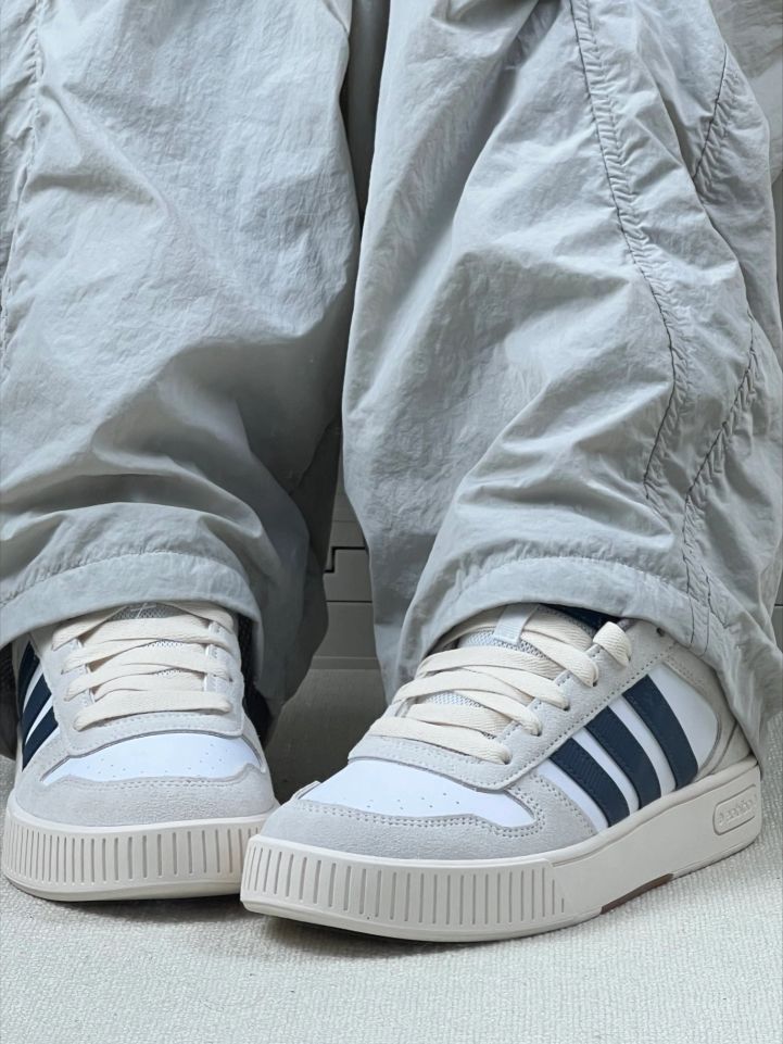 灰白色鞋面配上深蓝三条纹,经典样式,简单大方,不张扬,日常瞅着特顺眼👍👍不管啥风格都能搭,不容易出错😚😚 鞋面是合成革和织物拼的,合成革那块耐磨,平时不小心踢到碰到也没啥大问题;织物部分透气,夏天穿不会捂脚😂😂就是合成革部分弯折多了可能会有折痕🤔🤔鞋底橡胶的,抓地稳,走路跑步都踏实😊😊 我穿着它上班、逛街、运动都没问题😎😎穿上后,包裹感挺好,走路时鞋底有点弹性,不累脚😎😎不过刚开始穿的时候,鞋...