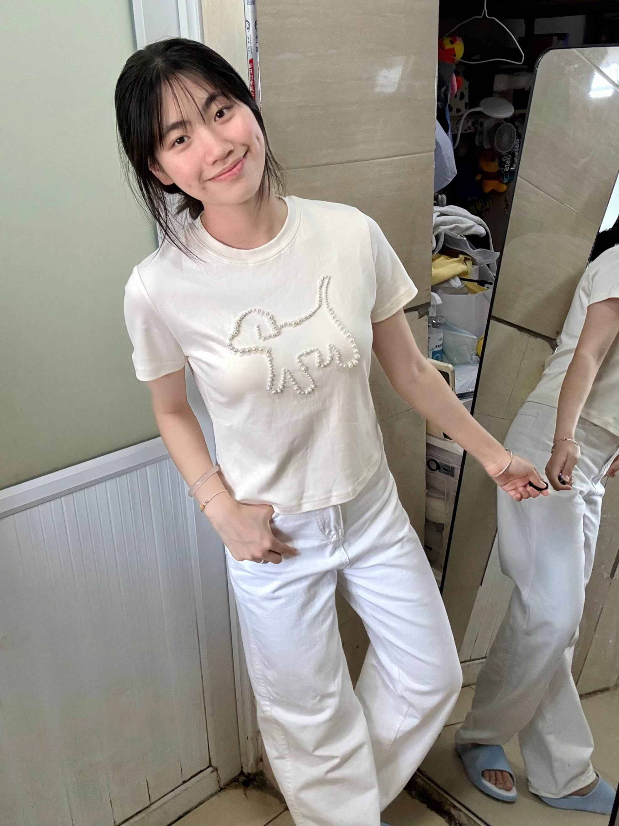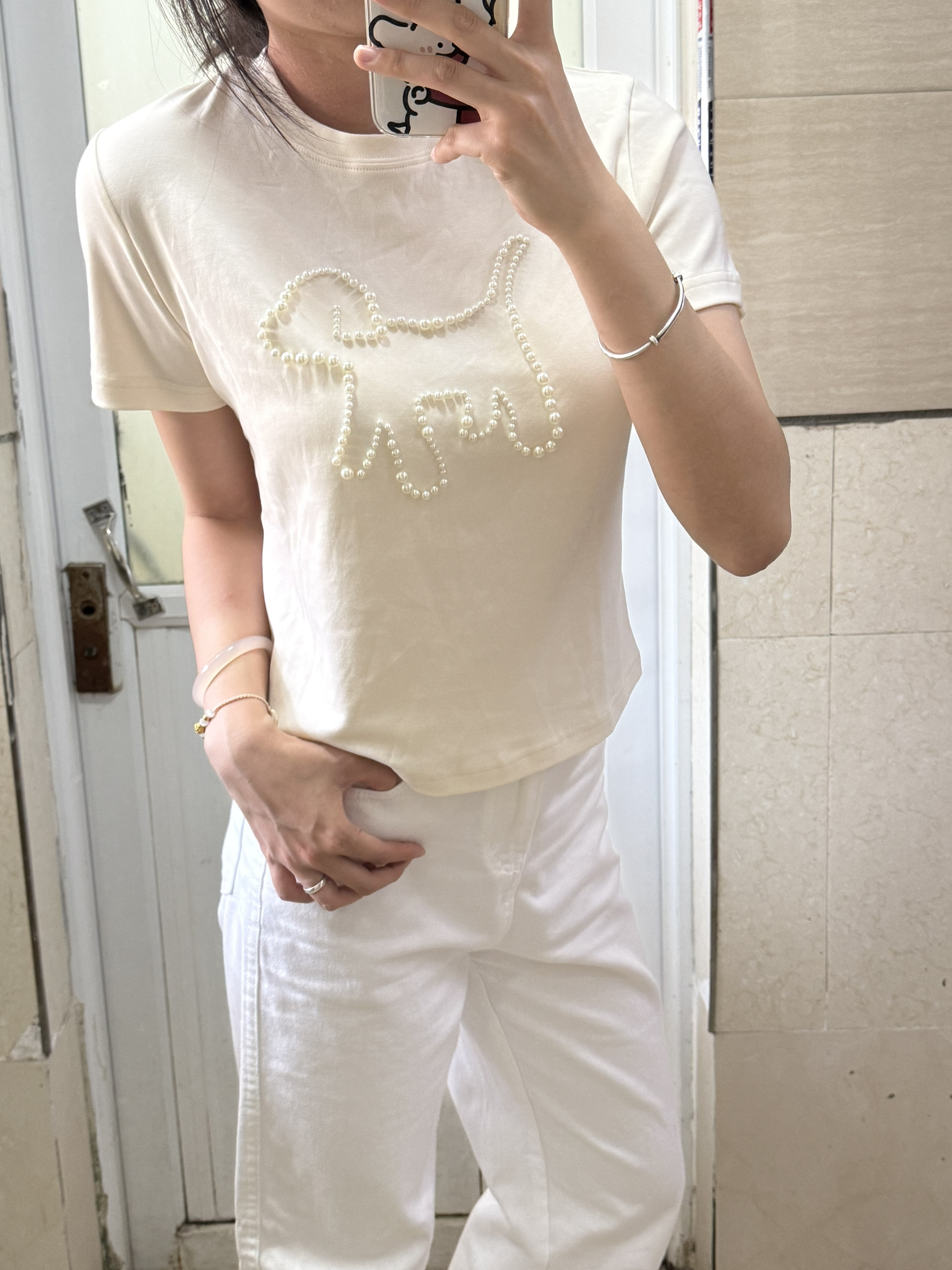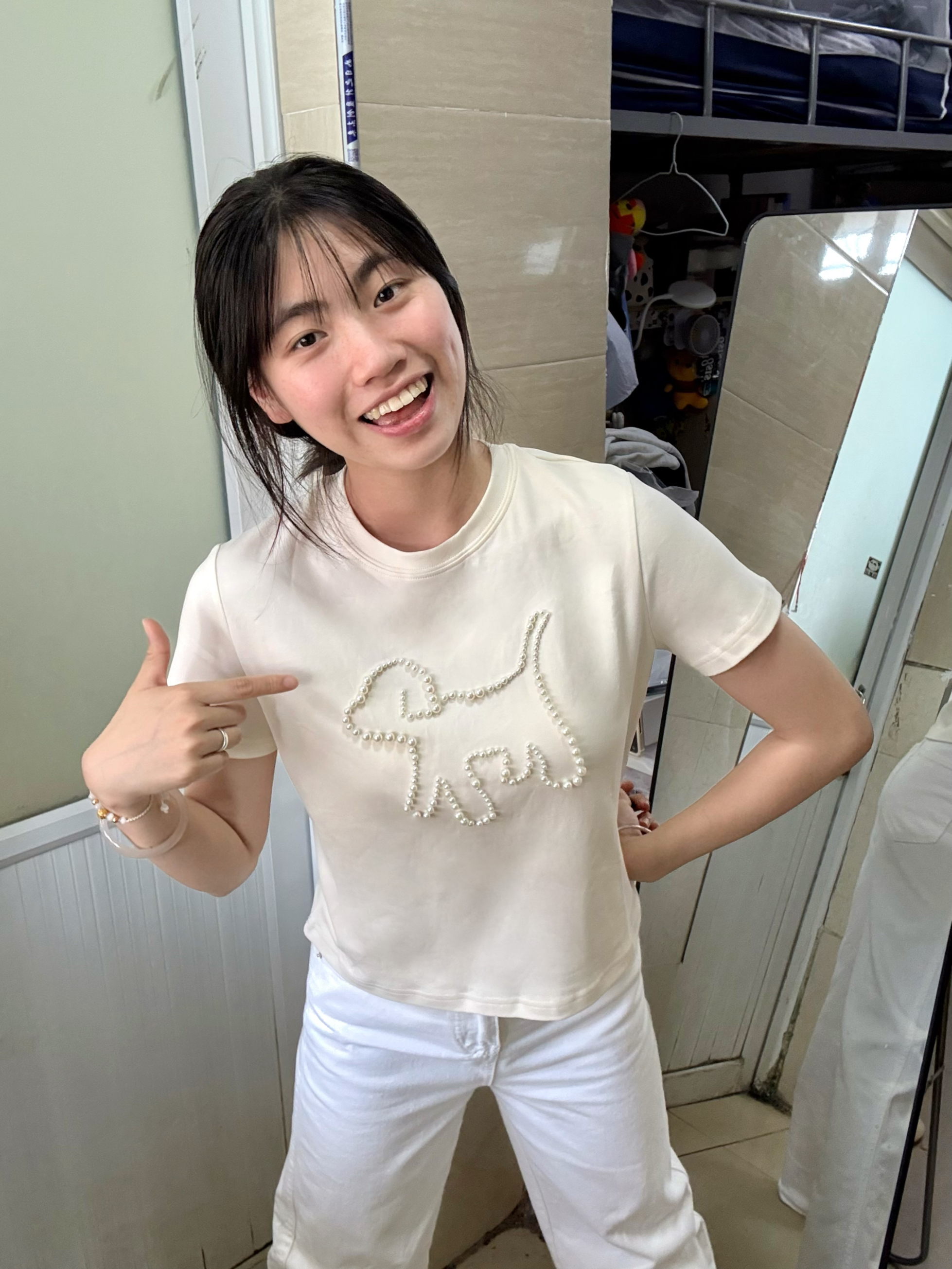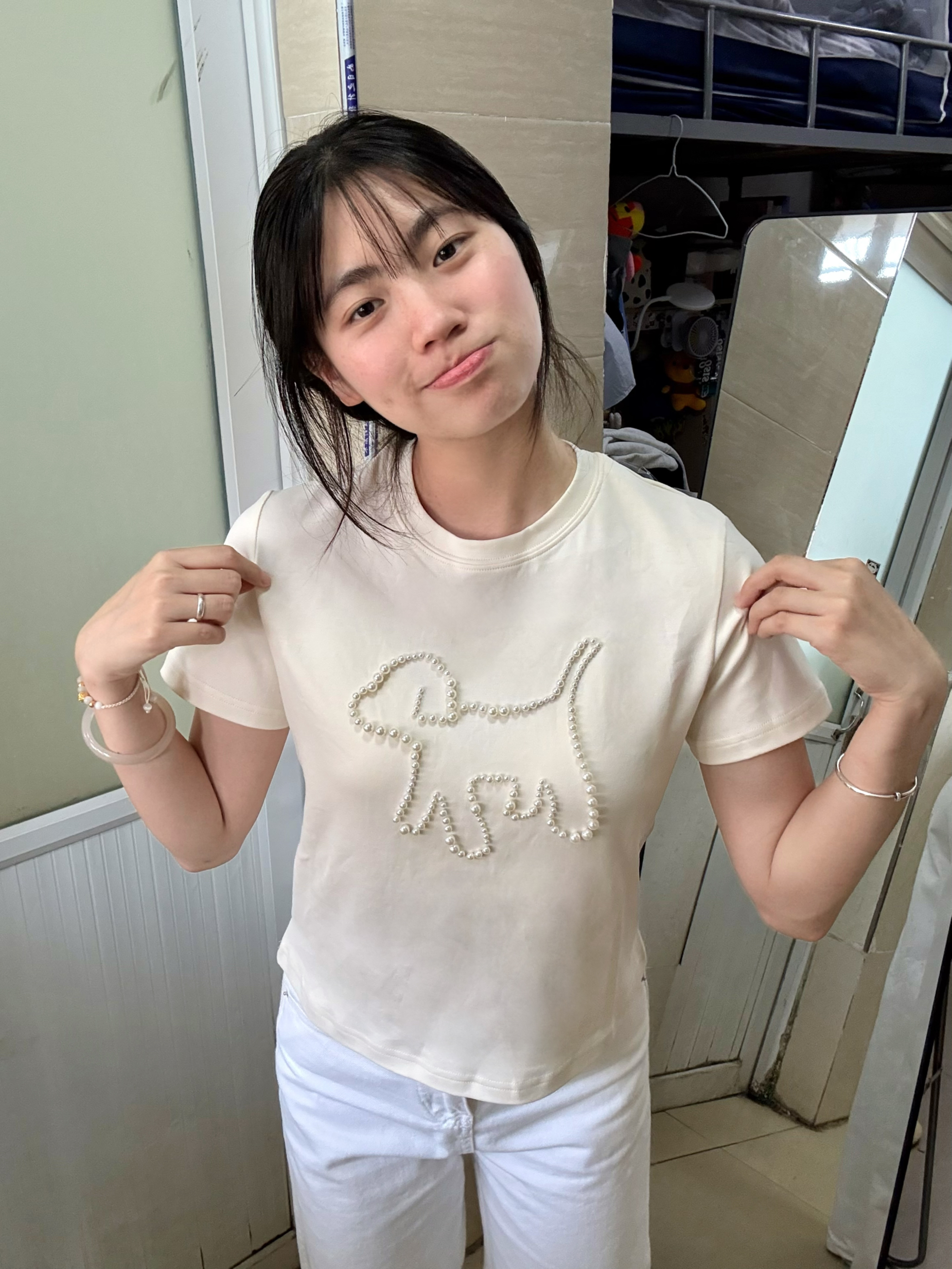 166 102穿的是M码 用珍珠围出小狗的形状 简直不要太萌了呀!!!而且是短款的 很显腿长呢 喜欢的宝宝可以参考一下哦