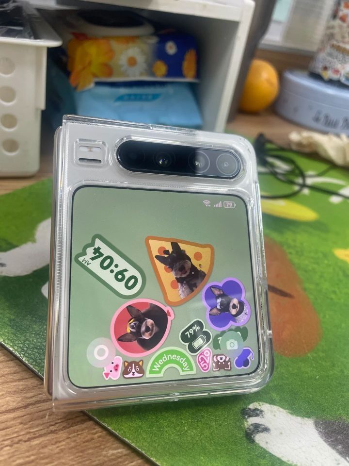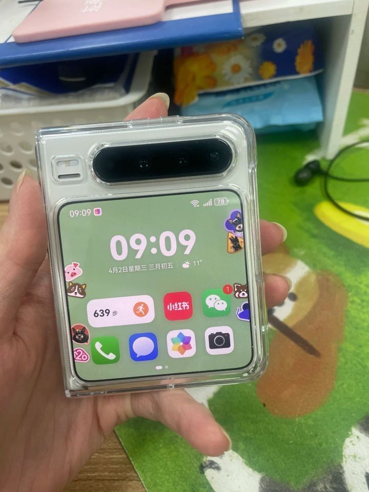 😍😙😙终于收到了!!外观真的很独特,折叠起来机身小巧 一只手完全掌控,展开后16:10的阔型屏幕比例优势很明显。重点!外屏的主题超级可爱!!还有强大的自拍功能 !