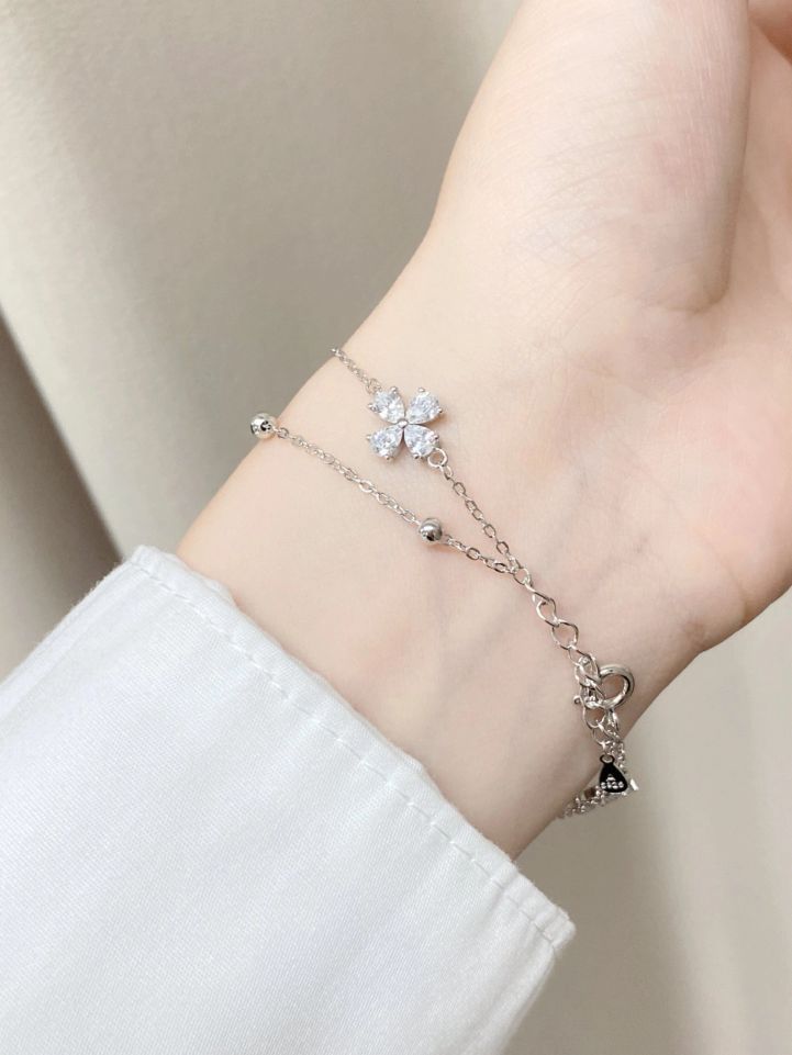 🌈谁能拒绝这么浪漫的四叶草手链! 🌈中国黄金这款双层S925银手链真的美到心巴上~四叶草吊坠小巧精致,双层链条叠戴层次感拉满,阳光下blingbling的超吸睛✨ 纯银材质完全不用担心过敏,戴着洗澡都没问题。 🌈闺蜜生日果断又下单一条,这么高颜值的手链必须和姐妹一起戴! (图源网络侵删)