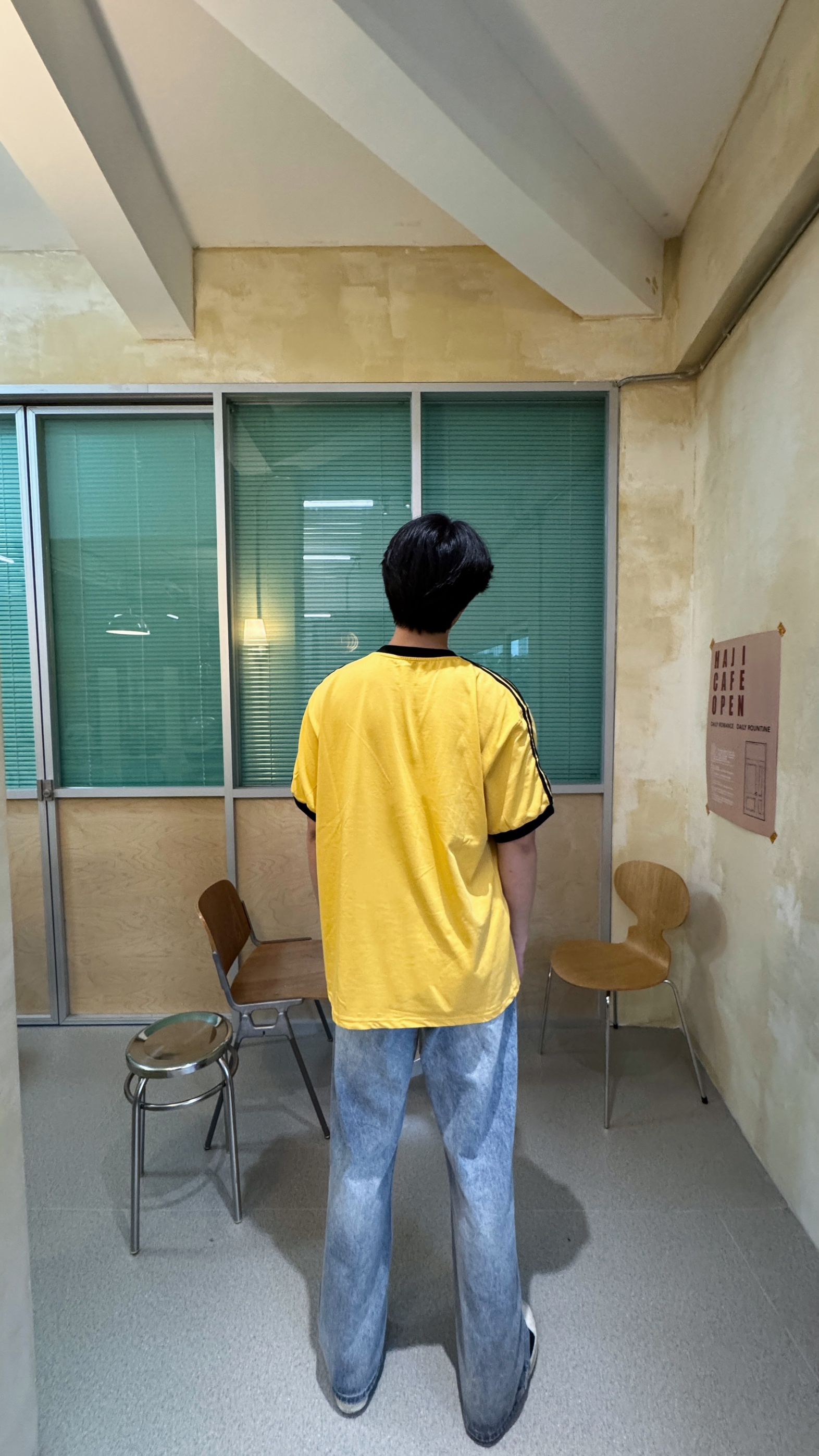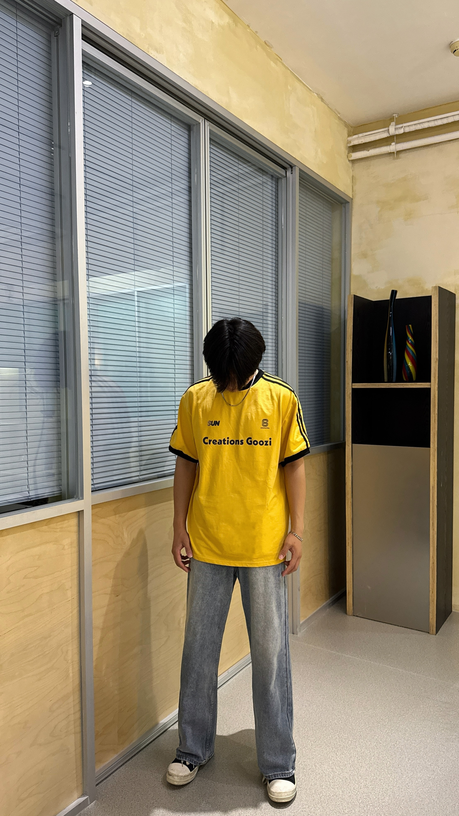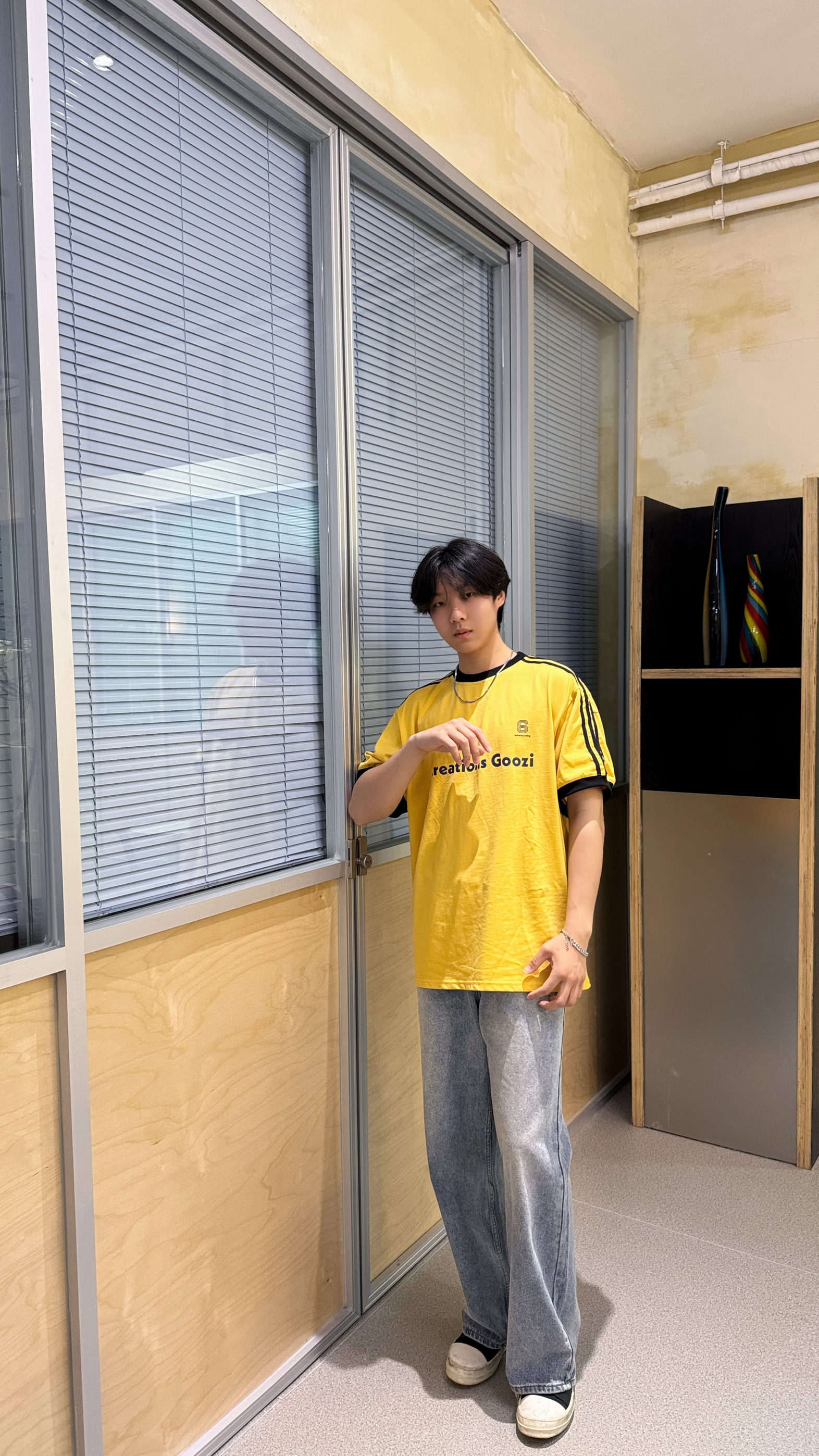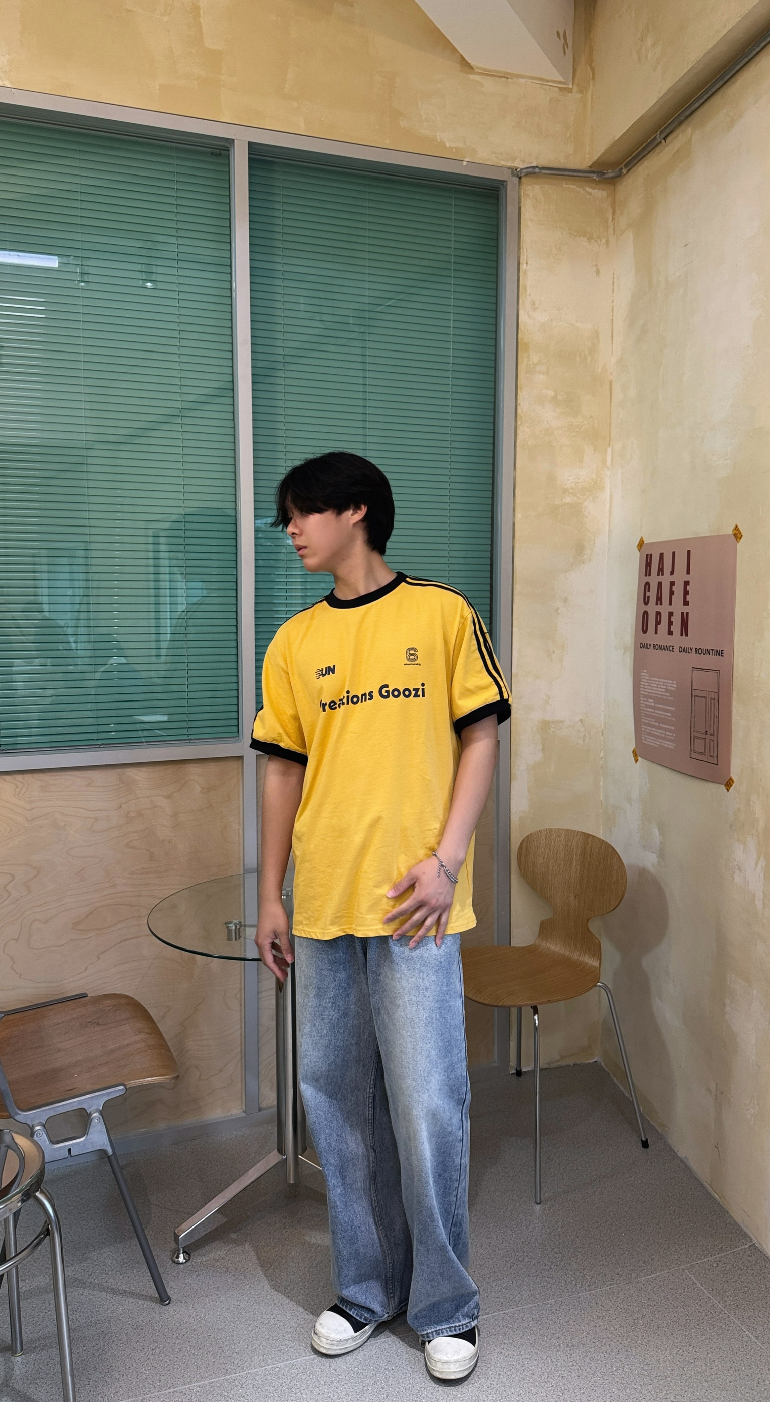 今日份穿搭超亮眼!亮黄色短袖活力满满,撞色领口与袖口设计,细节感拉满,胸前字母印花更添潮流态度。搭配宽松浅蓝色牛仔裤,随性又自在,妥妥的松弛感。脚上的黑白休闲鞋简约百搭,整体造型在休闲中透着时尚,无论是漫步街头还是打卡咖啡店,都能轻松拿捏氛围感。