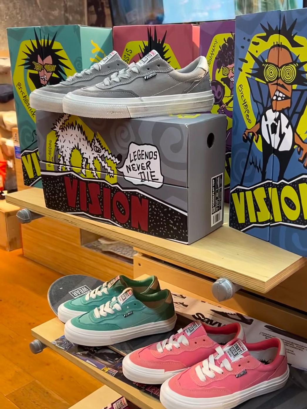 Vision这次的新款PSYCHO FAMILY 🛹 配色真的惊艳!一眼看中了紫色哈哈哈哈 好适合春天啊 很亮色是真的喜欢 细节很多耶 每次的鞋盒都好帅啊! 哈哈哈 客厅都摆了好多个!真的喜欢