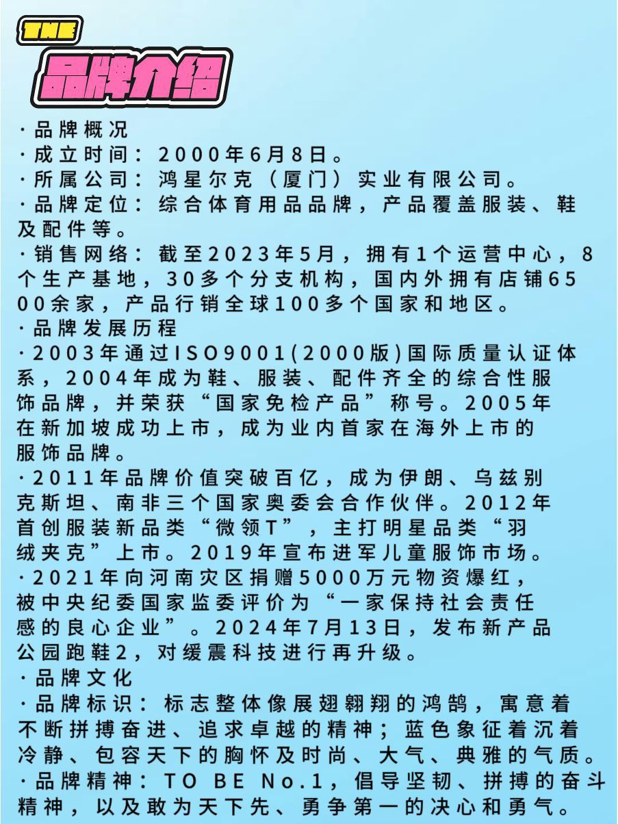 - 品牌概述:鸿星尔克(ERKE)是2000年6月8日成立的中国民营运动服饰品牌,所属公司是鸿星尔克(厦门)实业有限公司。截至2023年5月,公司拥有1个运营中心,8个生产基地,30多个分支机构,国内外拥有店铺6500余家,产品行销全球100多个国家和地区。 - 品牌文化 - 品牌标识:标志整体像展翅翱翔的鸿鹄,寓意不断拼搏奋进、追求卓越,蓝色象征沉着冷静、包容天下的胸怀及时尚、大气、典雅的气...