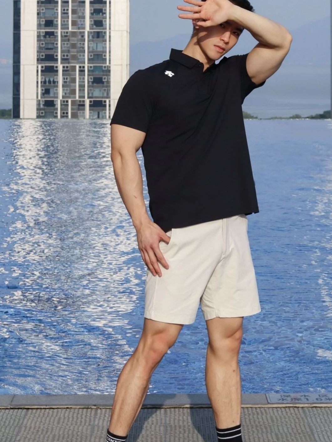 解决夏日炎热的方法,我想泳池会告诉你。 泳池拍照,一定要是比基尼或者泳裤嘛?绝对不是,我想运动男孩的好身材是怎样都可以显露的吧! 所以这是一份不走寻常路的泳池照片 ootd:迪桑特(黑色POLO)休闲干练,凸显身材 图源网络侵删