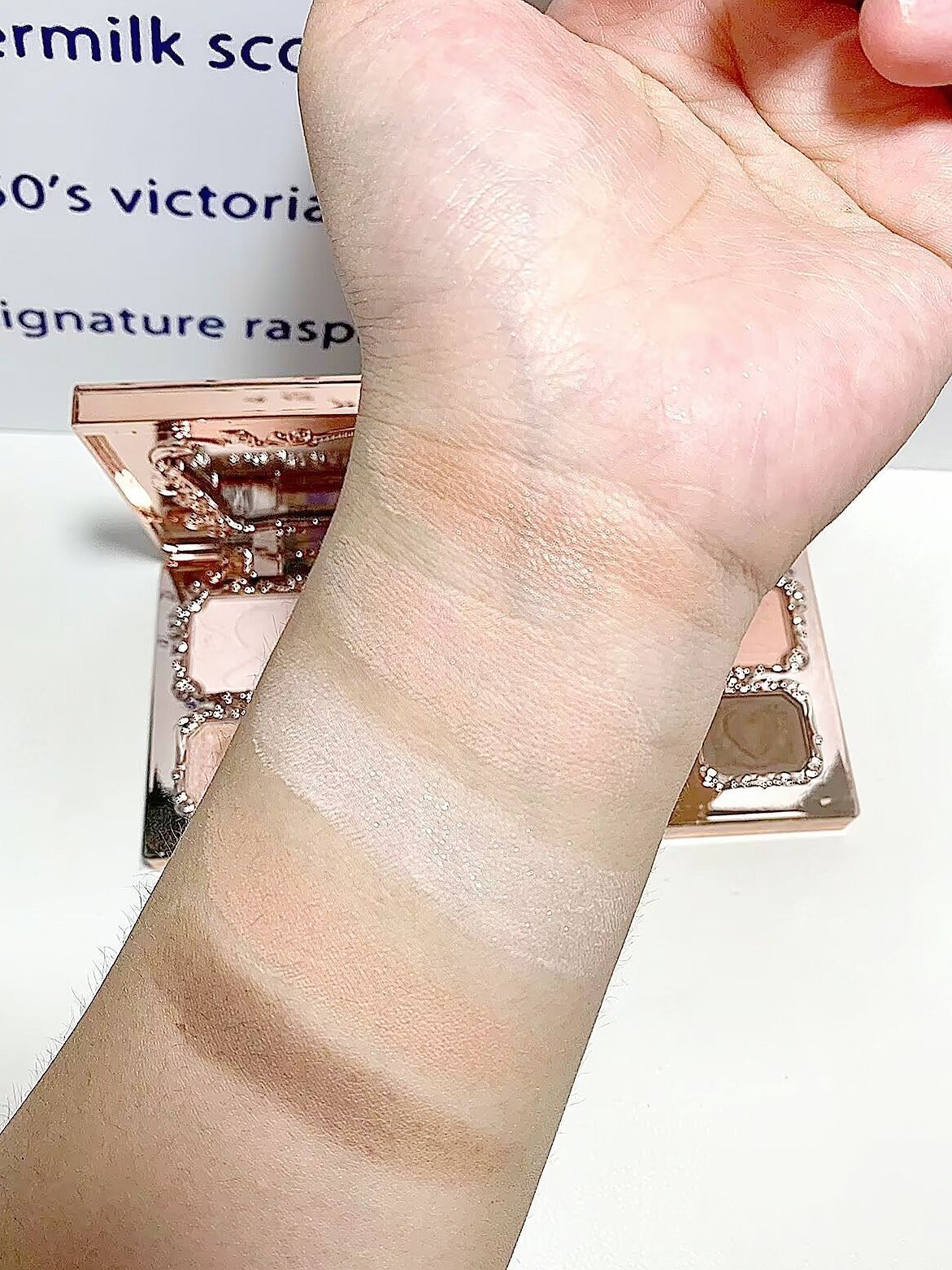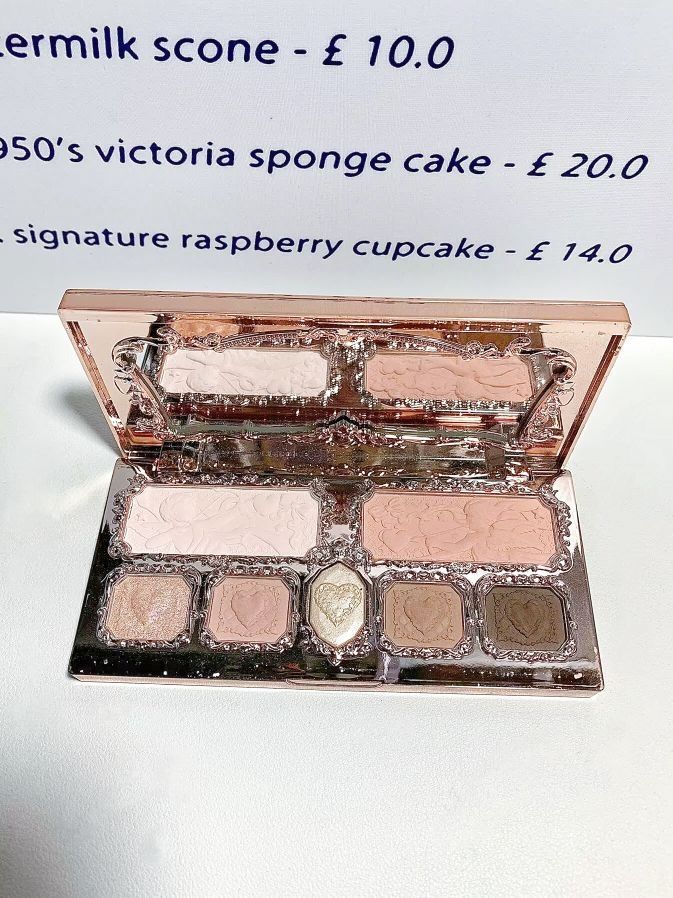 花知晓套盒是最最最划算的! 里面有五个正装 还有一个香薰和镜子👈 当然那肯定也送了三个粉扑滴~ 眼影盘色系是粉棕搭配 日常百搭不出错! 细闪和两片都很细 像银河一样波光粼粼的 提亮也是粉色的涂在泪沟处也不会突兀 液体腮红颜色超级嫩好吗氛围感buf叠加🖕