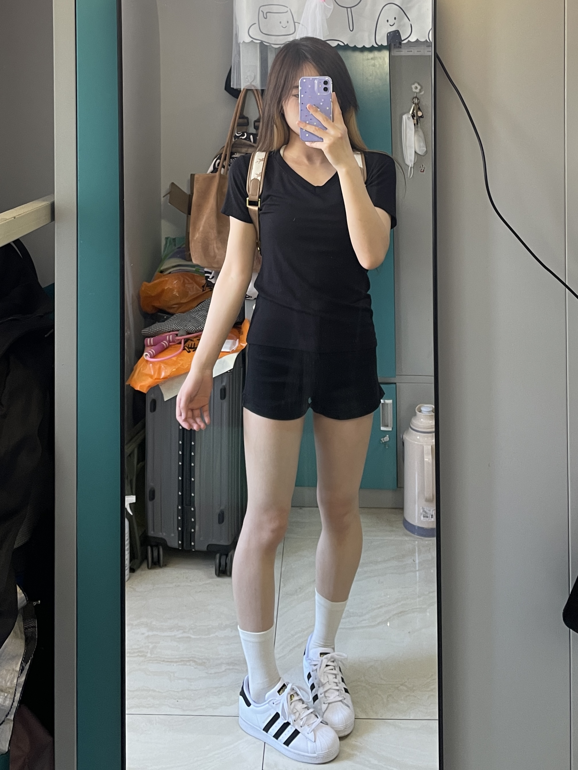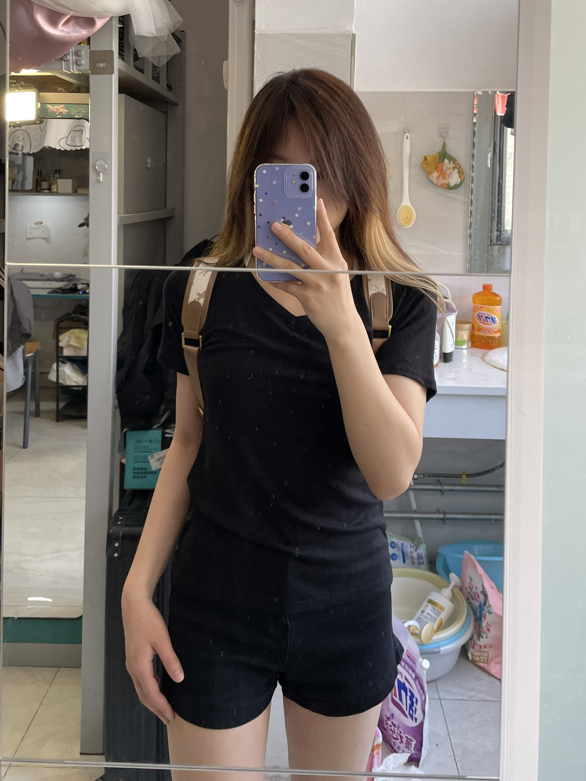 黑色v领短袖拉长视觉比例 好看的同时又很显瘦!加上黑色高腰短裤一整套又甜又酷~背上双肩包又不会显得沉闷!超好看~