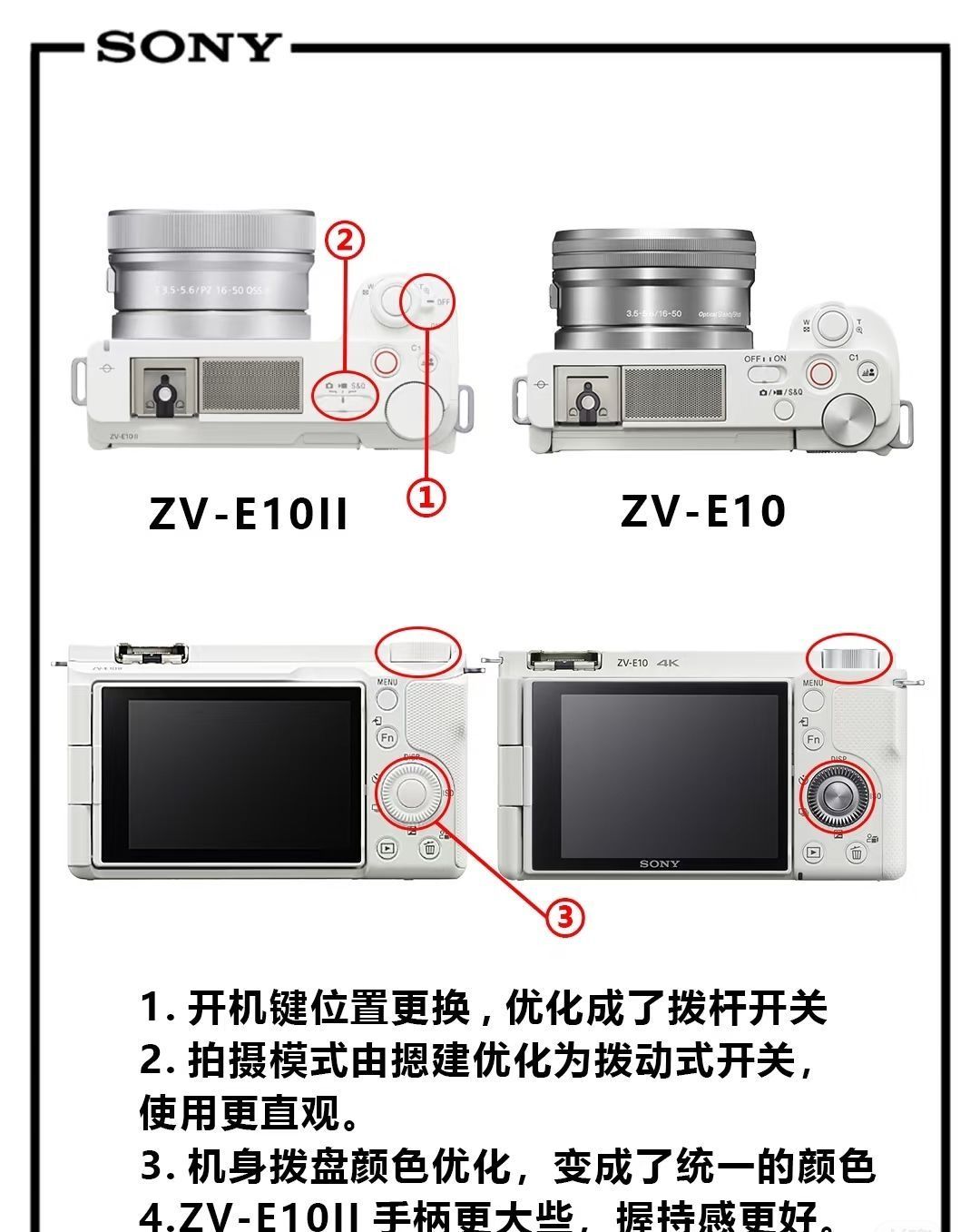 索尼ZV-E10一代 vs 二代全面对比 外观设计 - 一代:经典黑色机身,设计简约,重量382克,握持感普通,无防滑纹理。 - 二代:新增银色、粉色、白色等配色,重量降至约343克,手柄优化并添加防滑纹理,握持更稳固。 图像传感器 - 一代:2420万像素APS - C画幅CMOS传感器 。 - 二代:2600万像素APS - C画幅Exmor R CMOS影像传感器,支持像素合并技术,...