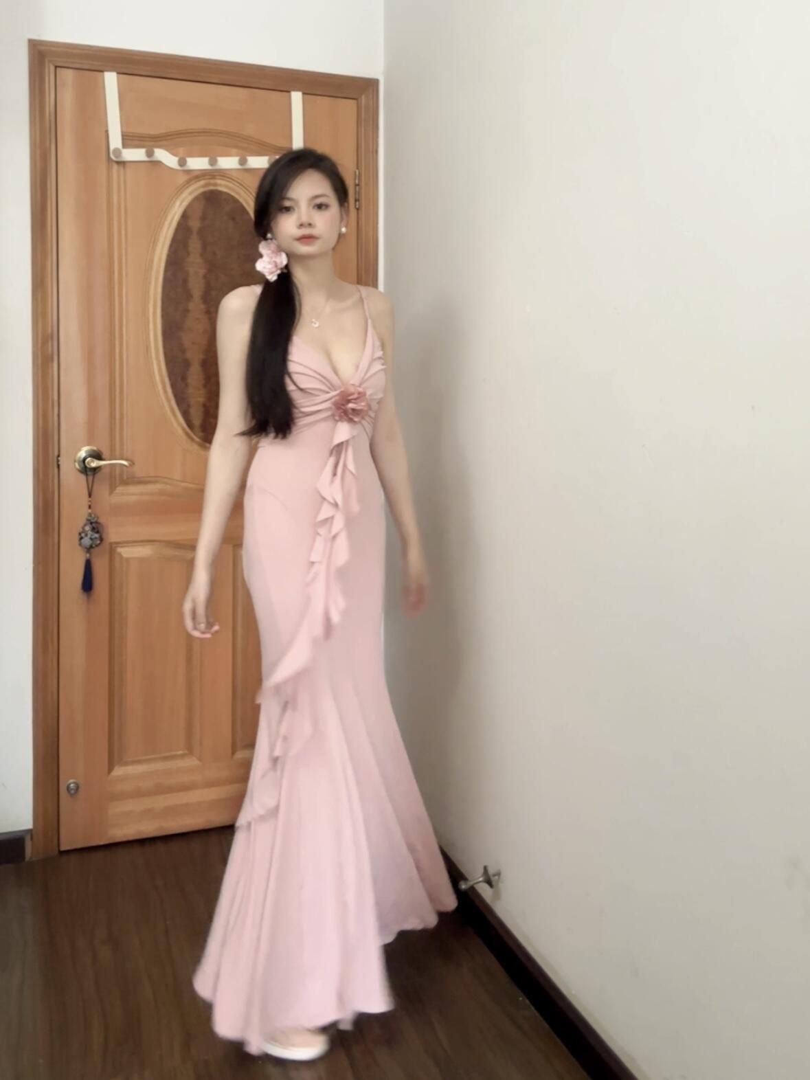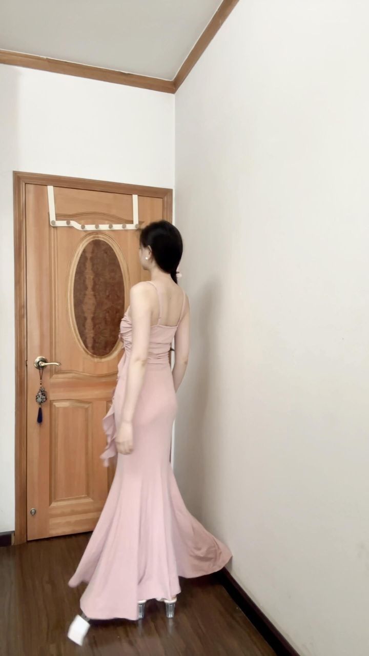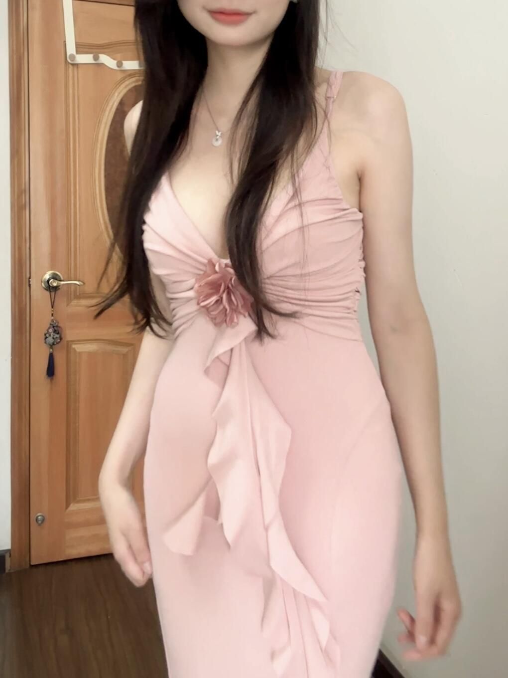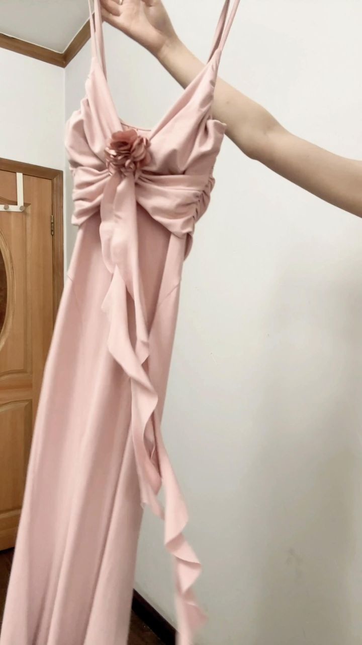 高妹直接冲!!S码裙长128~ 终于找到这种到脚脖子的裙子啦,这是我165/92斤穿上的效果,有一丢丢长,必须穿高跟鞋👠 颜色:是柔粉色系,显得很温柔不会显黑 面料柔软贴身,垂感很强!中间那个花朵是两条长长的飘带,按照自己喜欢的方式别上去就可以,肩带是可以调节的 这种贴身的裙子最关心的就是透不透和露不露尴尬线的问题,不透的哈,我试穿的时候穿的深色内内,穿无痕的那种就看不出来啦