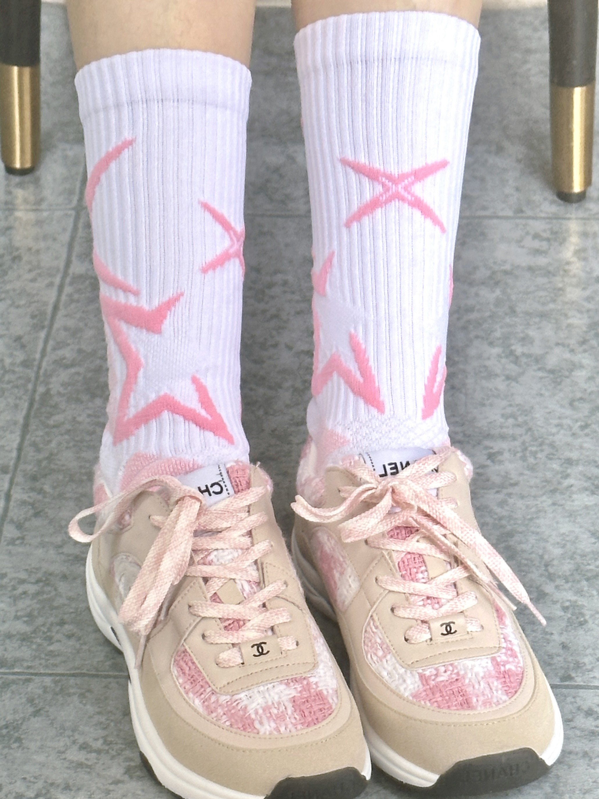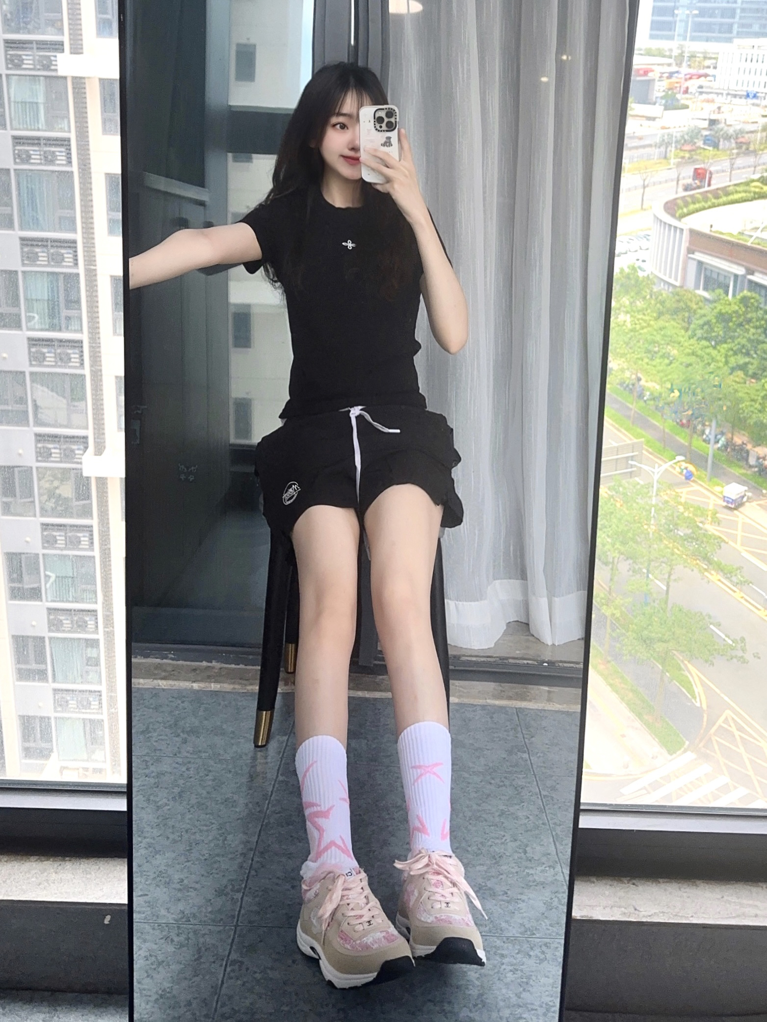 黑色t恤搭黑色运动短裤 穿上星光系列篮球袜🧦 粉白配色好甜美啊! 搭配小香风的运动板鞋 运动女孩的日常ootd罢了