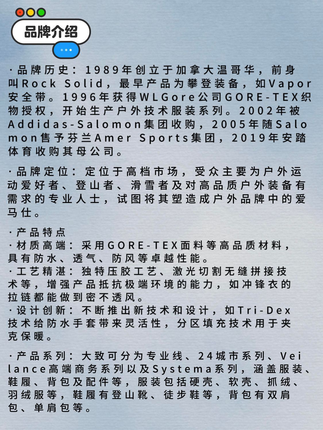 品牌历史 - 由登山爱好者Dave Lane和Jeremy Guard创立,前身叫Rock Solid,最早产品为使用热压合技术设计和生产的Vapor安全带。 - 1994年,研发Bora系列背包,该背包以Vapor安全带的热塑成型工艺为基础。 - 1996年,获得WLGore公司GORE - TEX织物授权,开始生产户外技术服装系列。 - 2002年被Addidas - Salomon集...