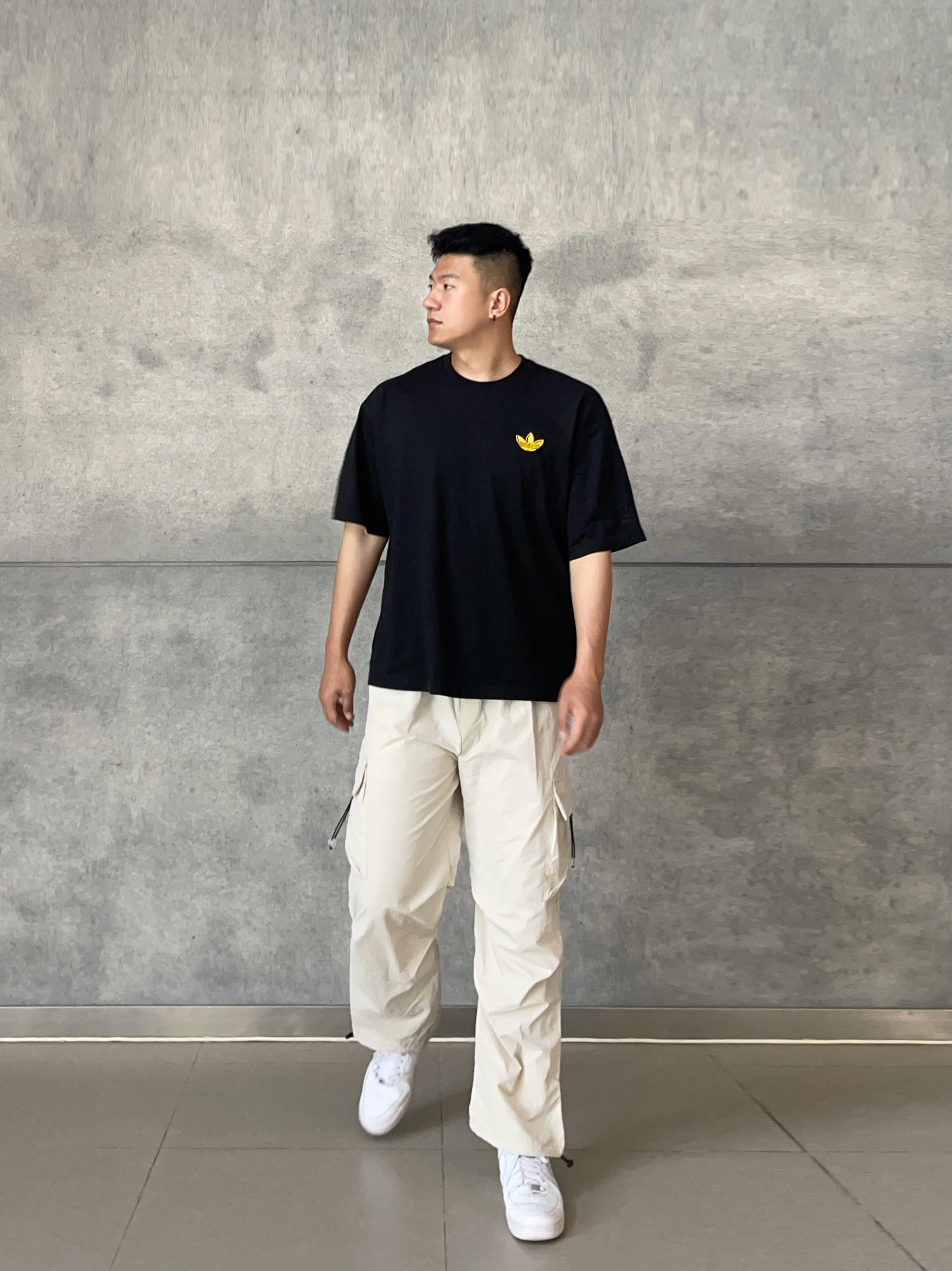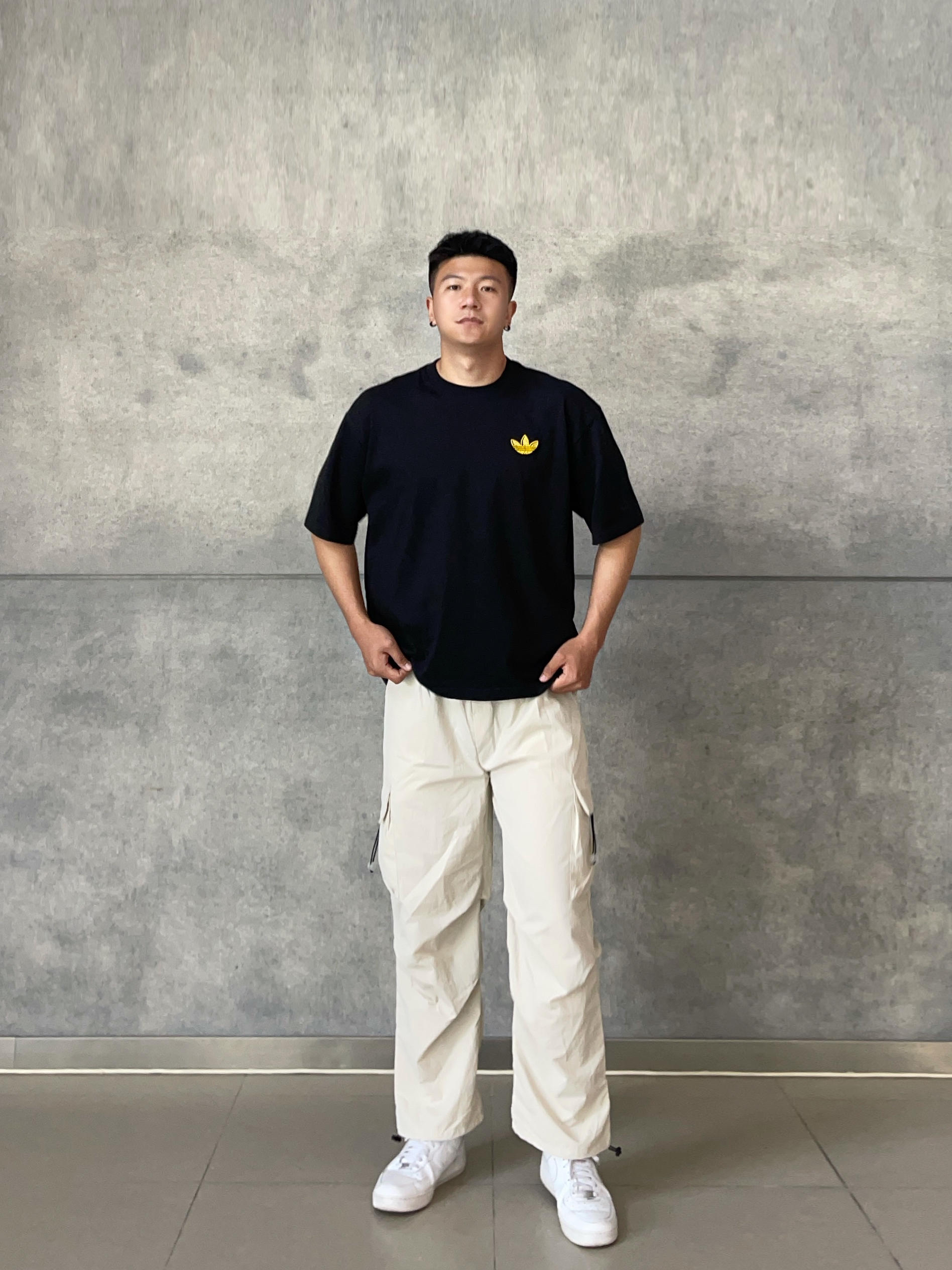 夏天粗腿男生的清爽显瘦穿搭公式来咯👏 👕→三叶草黑T + 👖→冰丝伞兵裤 + 👟→空军小白鞋 👦🏻:188 | 85 👖:XXL 这条冰丝工装裤简直是梨形身材天菜💨 ✅立体剪裁+垂感版型 粗腿有效变瘦直腿 ✅多口袋+防水速干 走路轻快不粘腿 ✅轻薄防风 上身效果很清凉🫧通勤出游一套搞定👌🏻