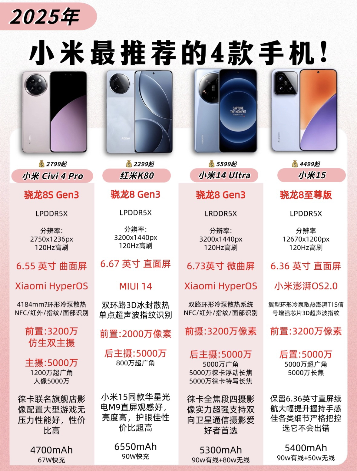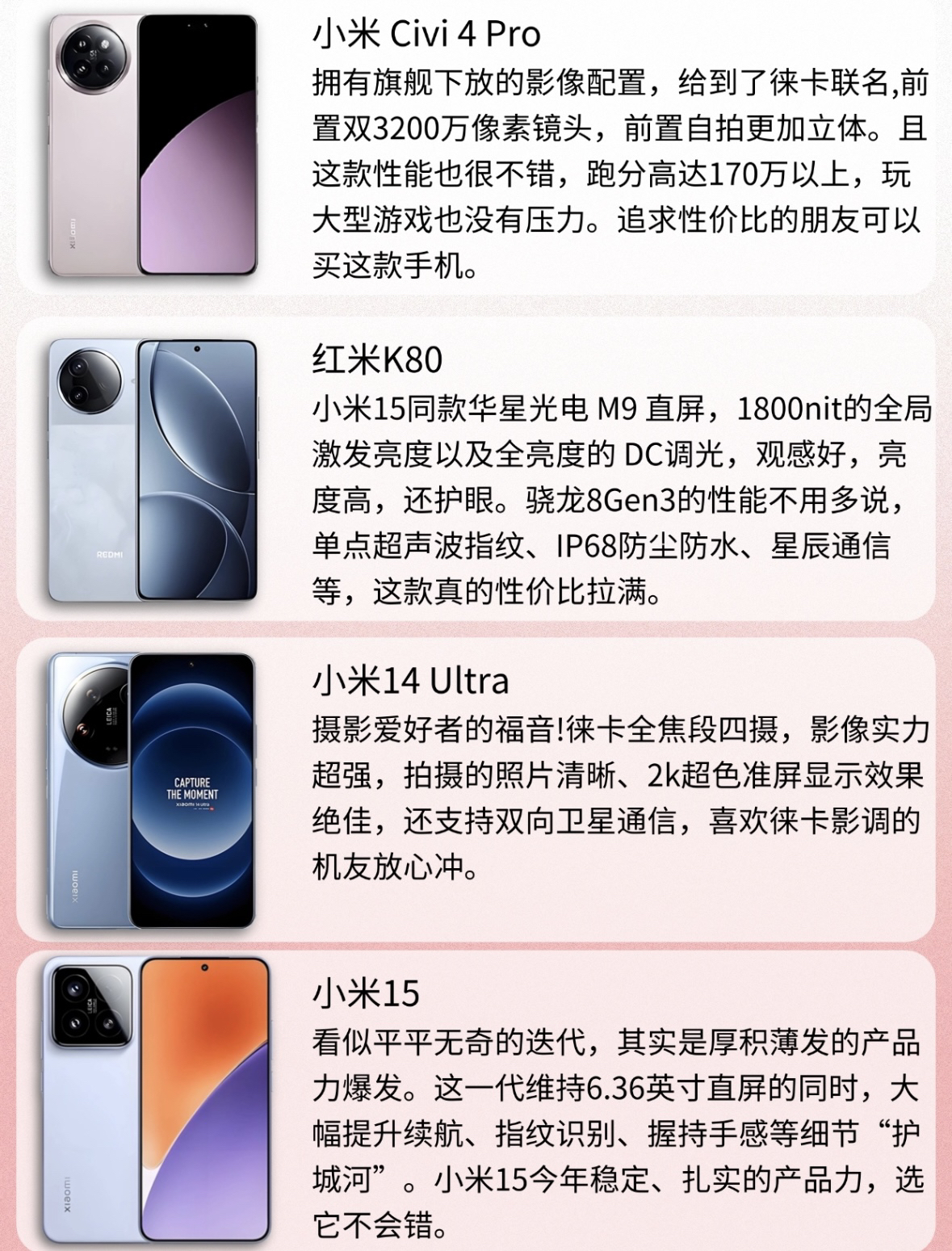 吐血整理!2025年这4款小米手机闭眼入!! #今日份数码分享 宝子们,今天来给大家推荐四款超棒的小米手机,品质和性能双双在线,数码控们速速集合! ♥小米Civi 4 Pro 菌参考价:2799元(12+256GB)这款手机简直是自拍神器!搭载了旗舰下放的影像配置,还是徕卡联名。前置双3200万像素镜头,自拍立体又好看。性能也很能打,跑分170万+,大型游戏随便玩,性价比超高,入手不亏! 红米K8...