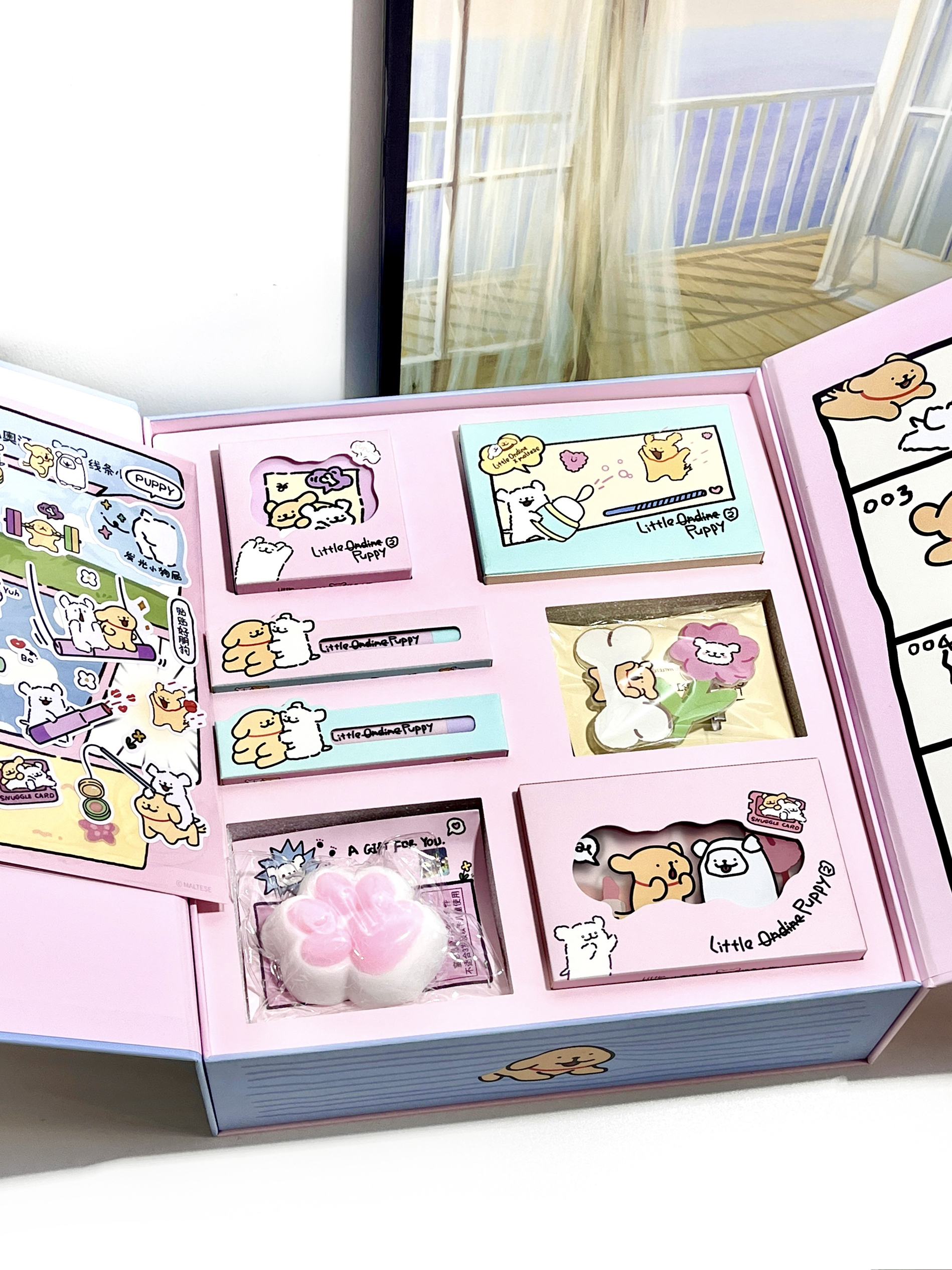 小奥汀X线条小狗礼盒好好看啊 由里到外一整个被它萌住了~ 满满的一大盒 还送了好多周边 有双拼高光膏+唇蜜+7色多用盘 我感觉色号还都挺日常百搭的 唇蜜敲击显白 高光提亮也自然 多用盘的粉质细腻 新手也能驾驭 可可爱爱的彩妆礼盒谁能拒绝得了!