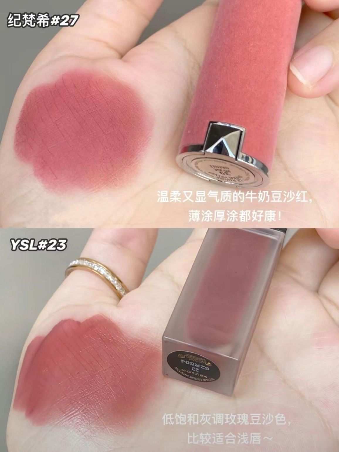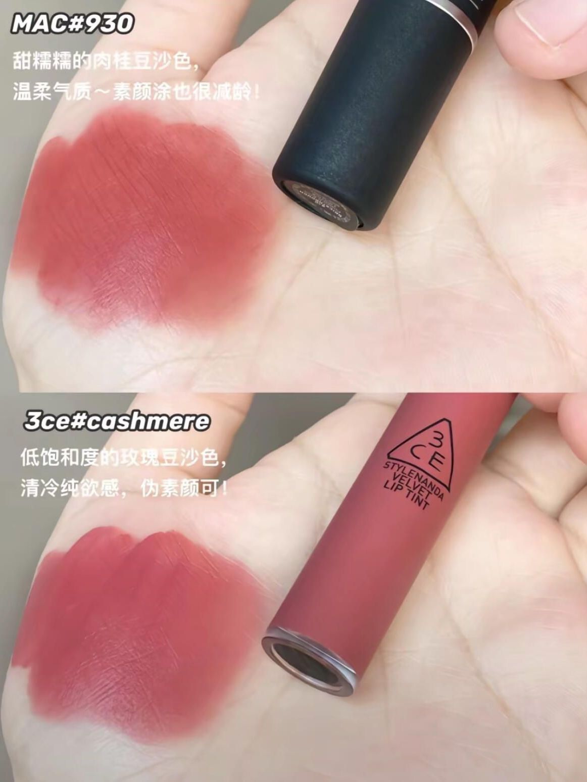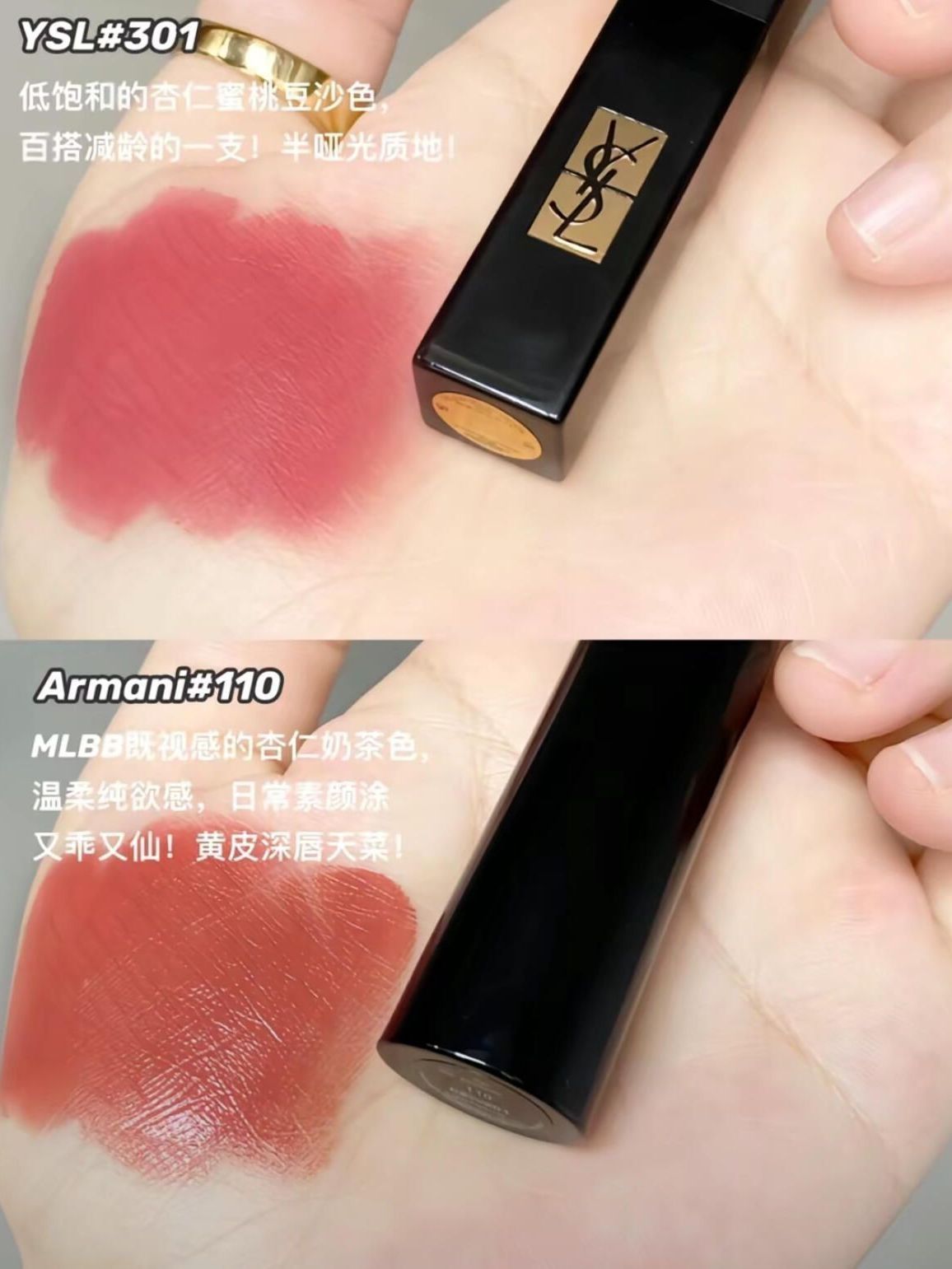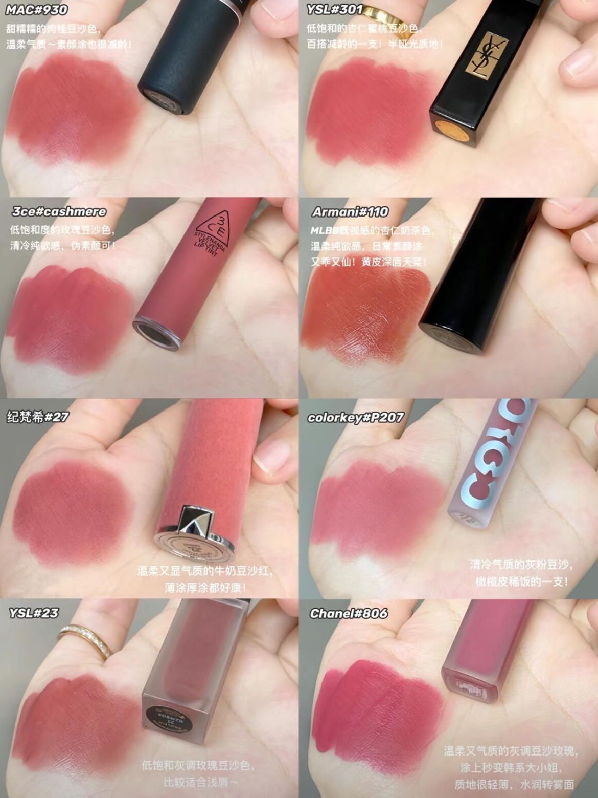 Mac 930 甜糯糯的肉桂豆沙色, 温柔气质~素颜涂也很减龄! 3ce cashmere 低饱和度的玫瑰豆沙色, 清冷纯欲感,伪素颜可! Ysl 301 低饱和的杏仁蜜桃豆沙色, 百搭减龄的一支!半哑光质地! Armani 110 MLBB既视感的杏仁奶茶色, 温柔纯欲感,日常素颜涂 又乖又仙!黄皮深唇天菜! 纪梵希27 温柔又显气质的牛奶豆沙红, 薄涂厚涂都好康! Ysl 23 低饱和灰调玫瑰...