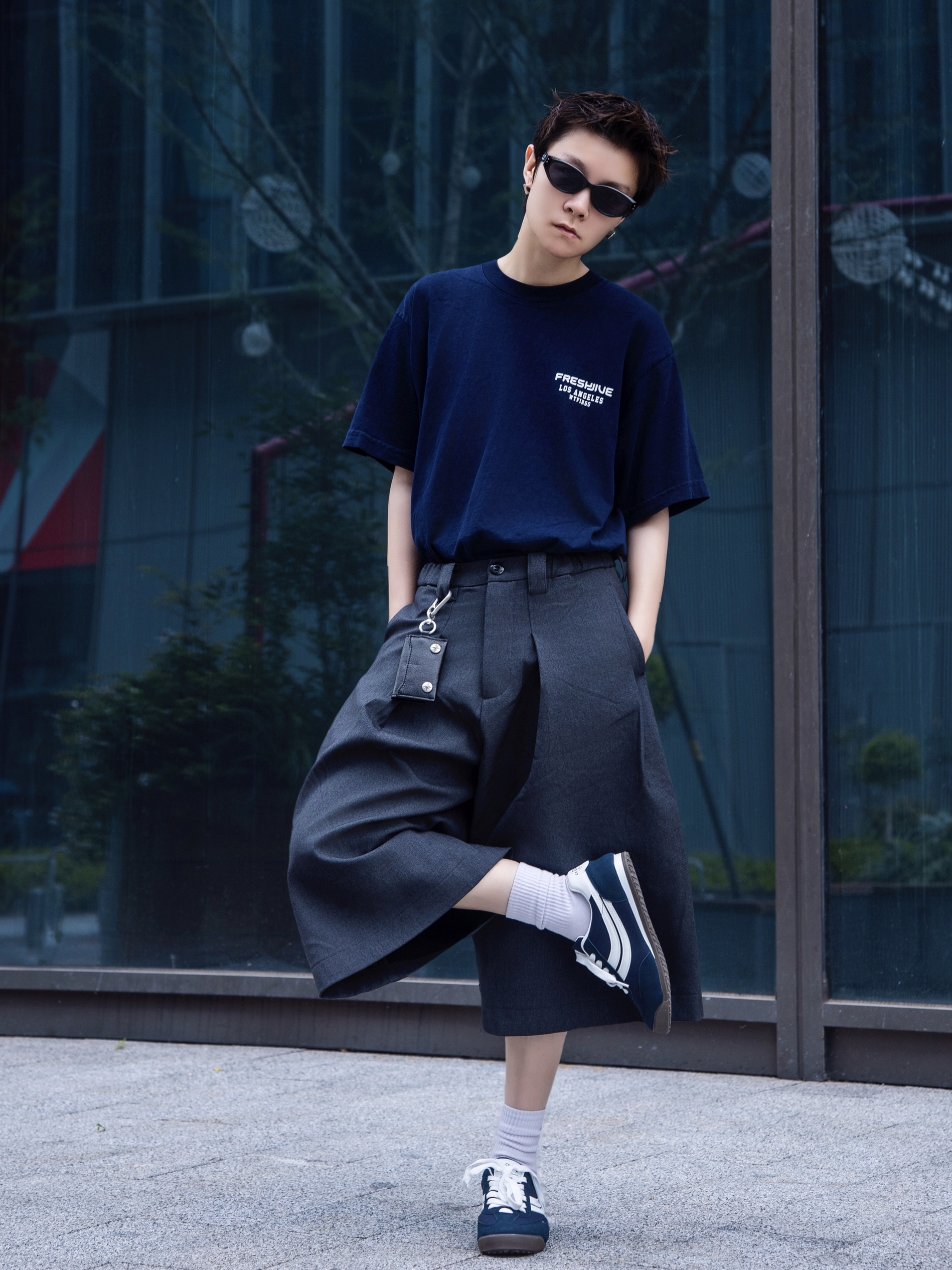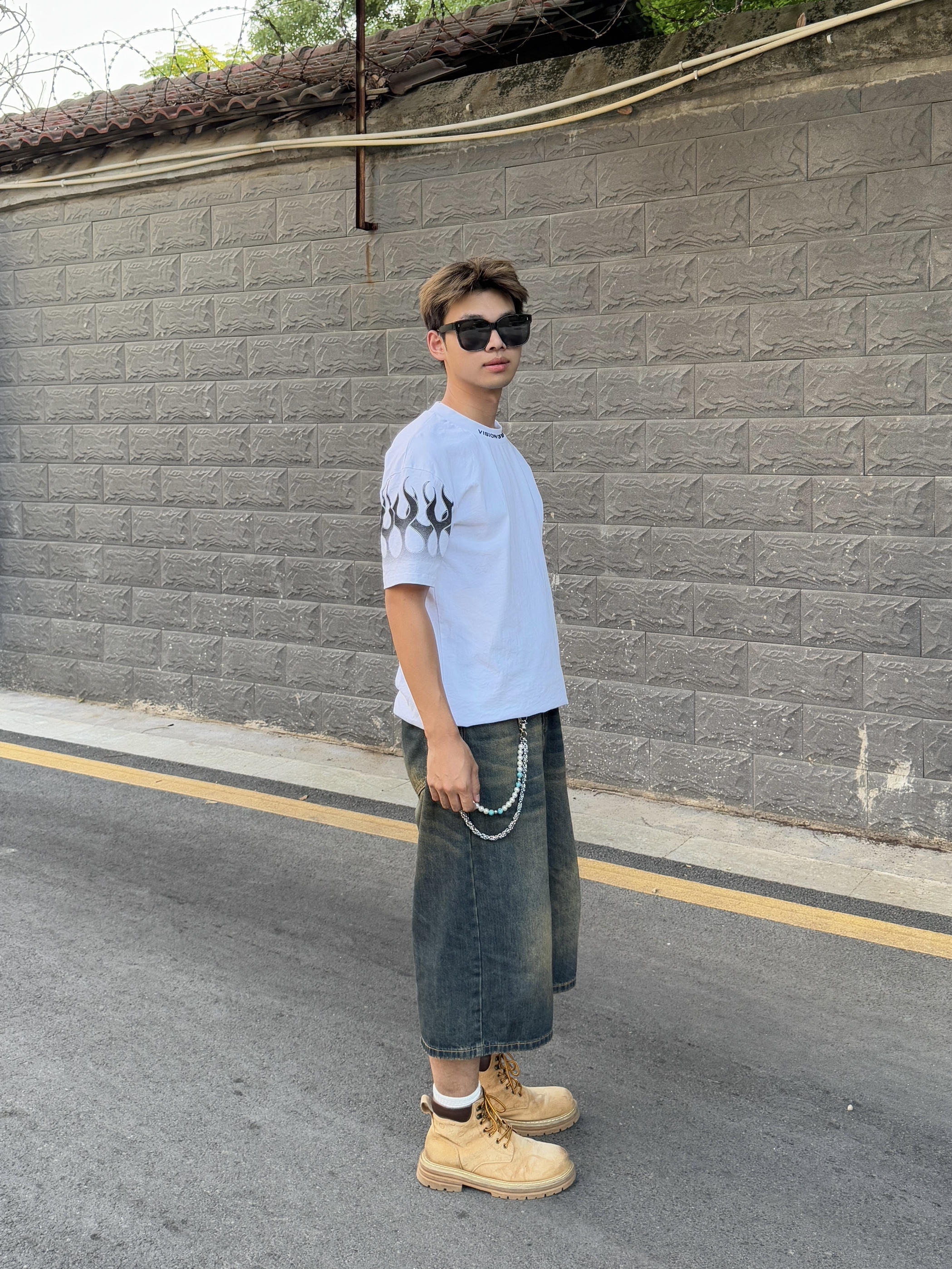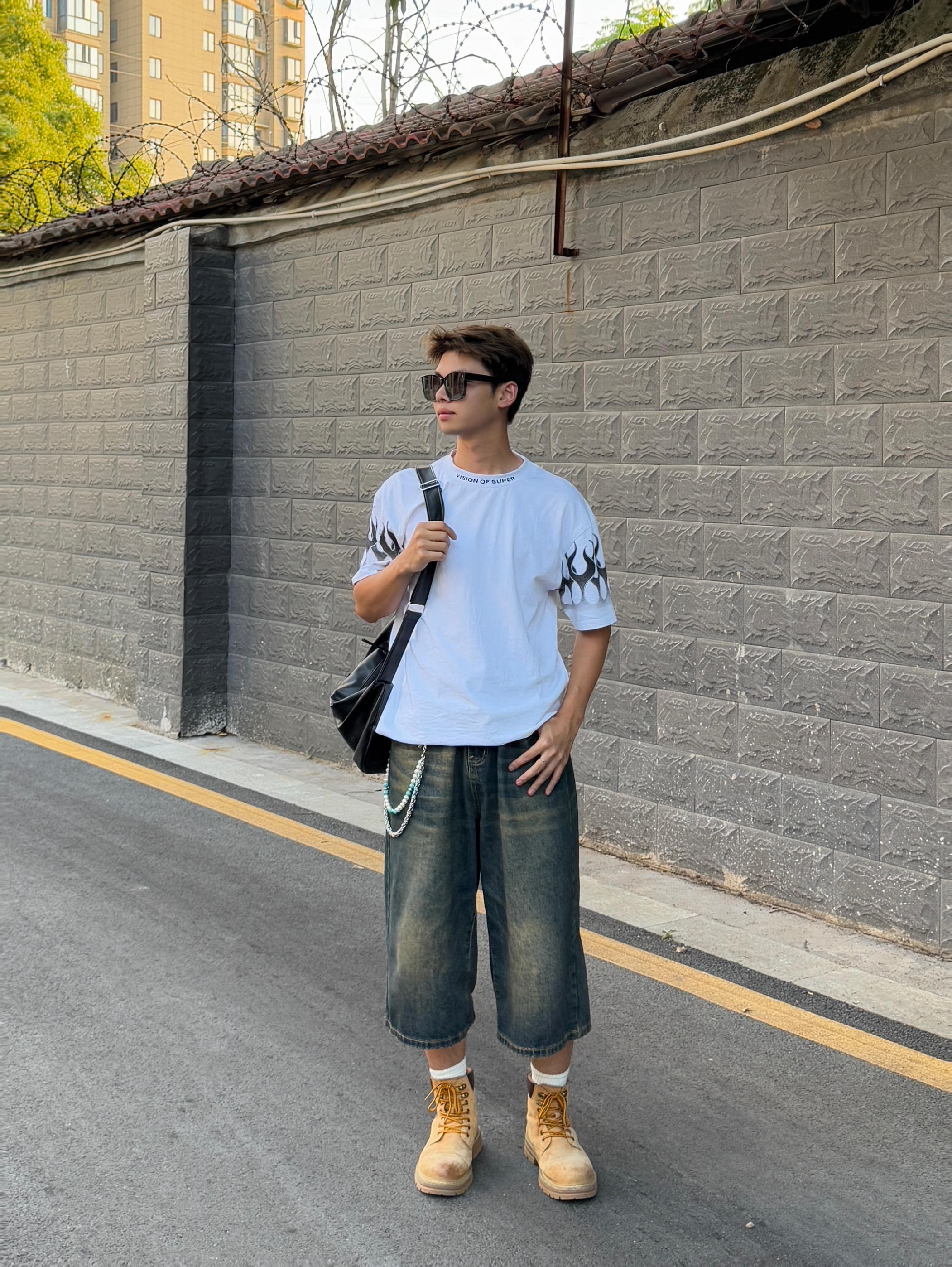 舒适有个性才是我的穿搭理念 火焰袖口T恤上身凸显个性 搭配一条七分裤协调又时尚