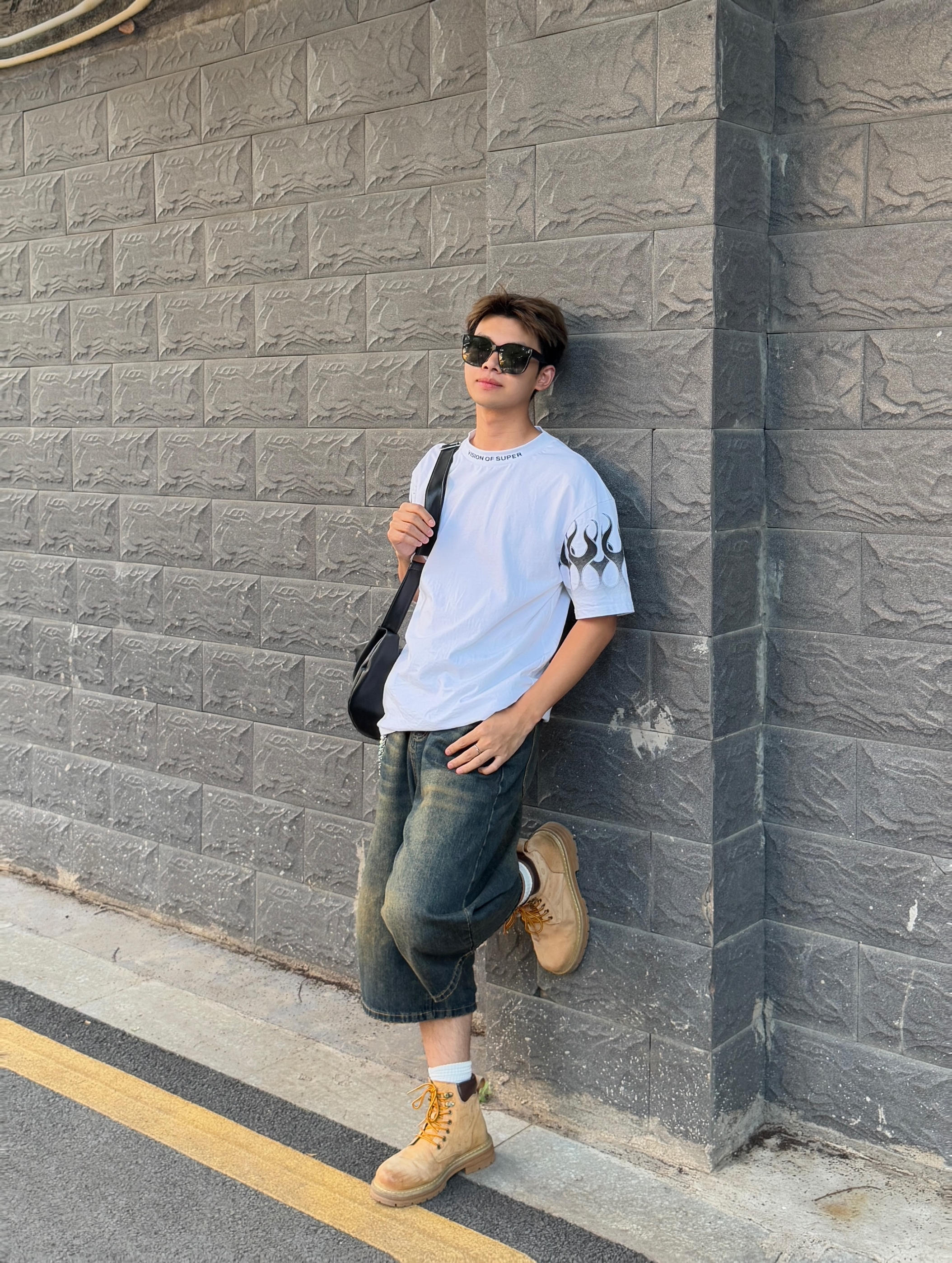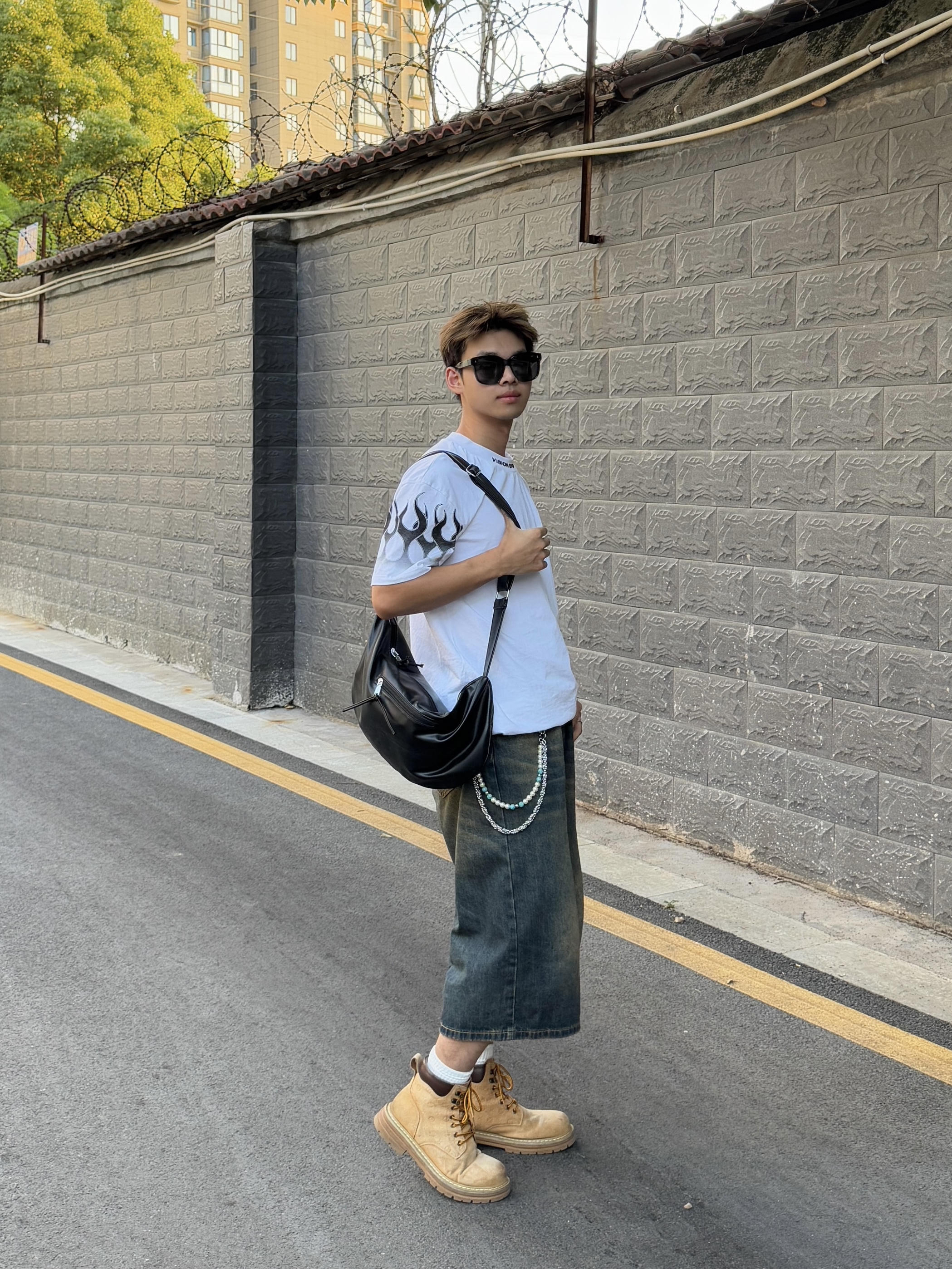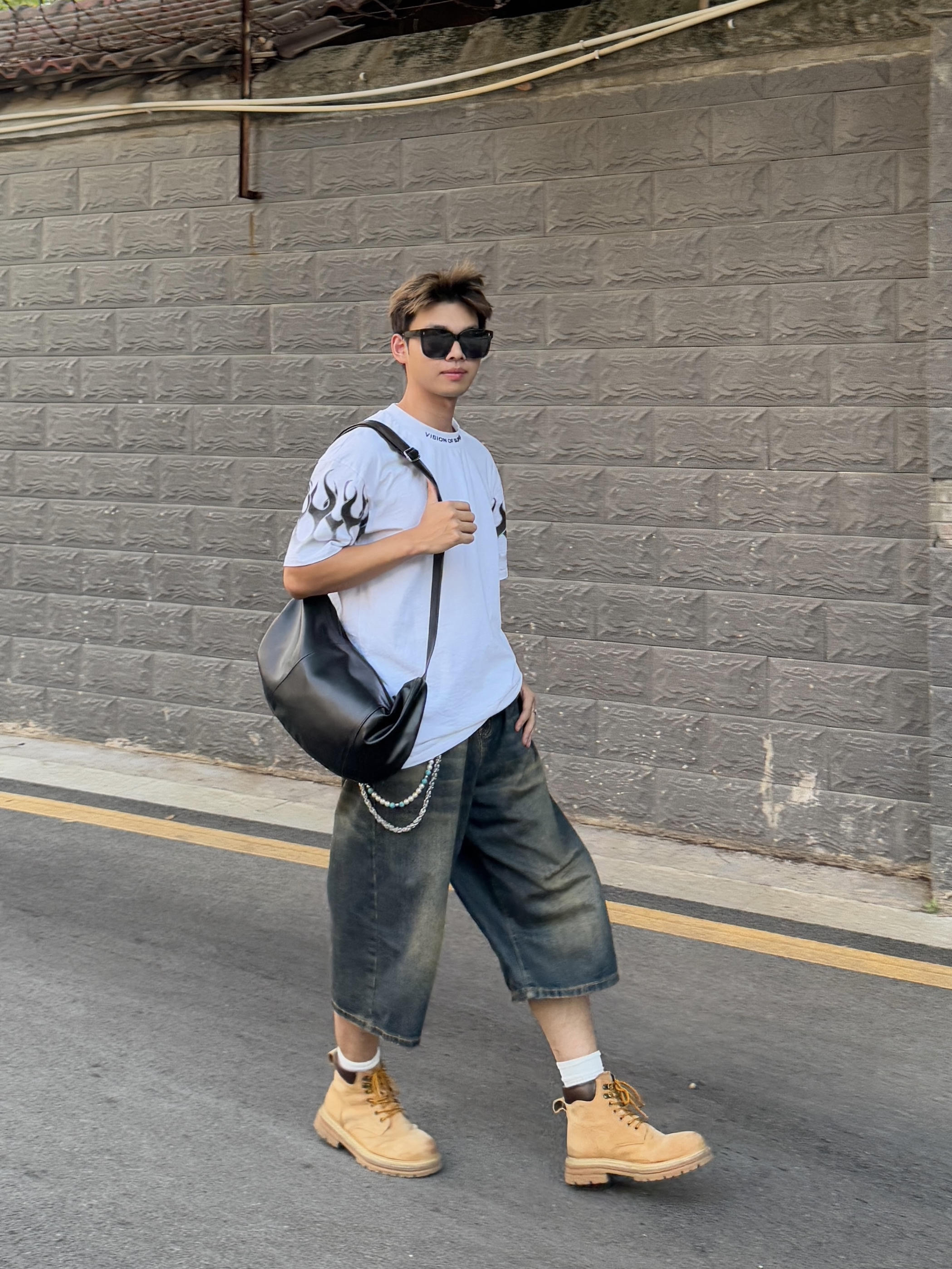舒适有个性才是我的穿搭理念 火焰袖口T恤上身凸显个性 搭配一条七分裤协调又时尚