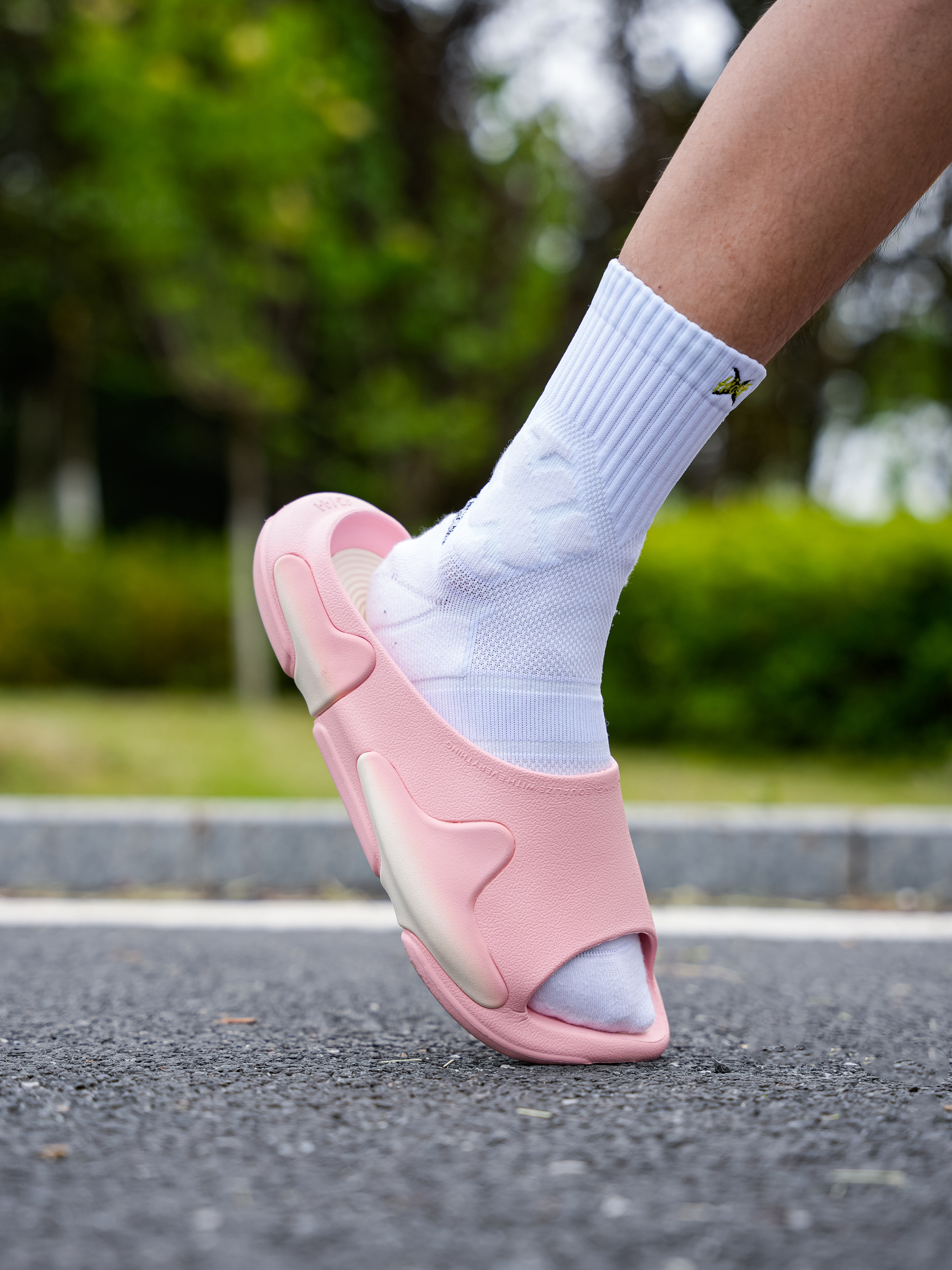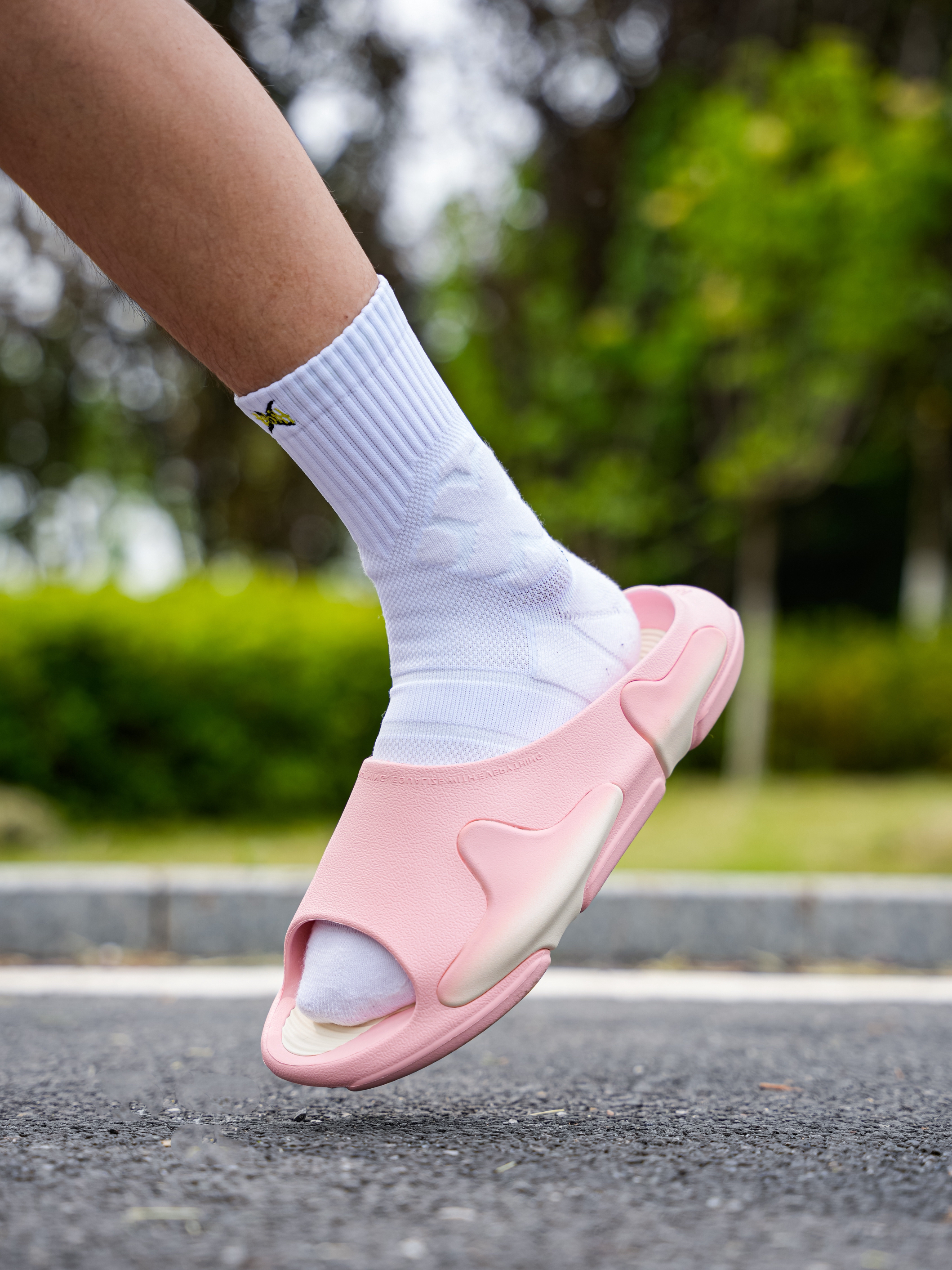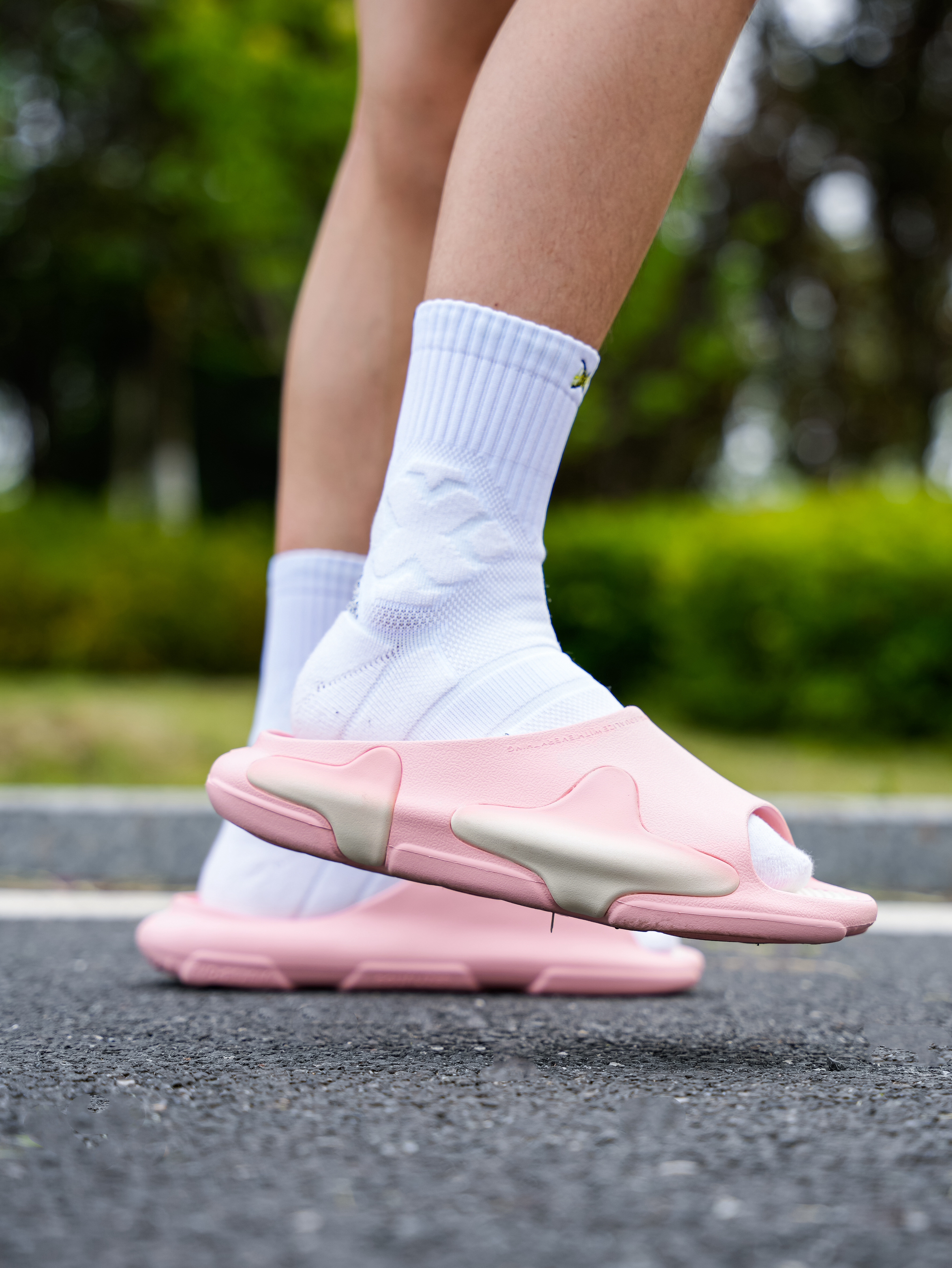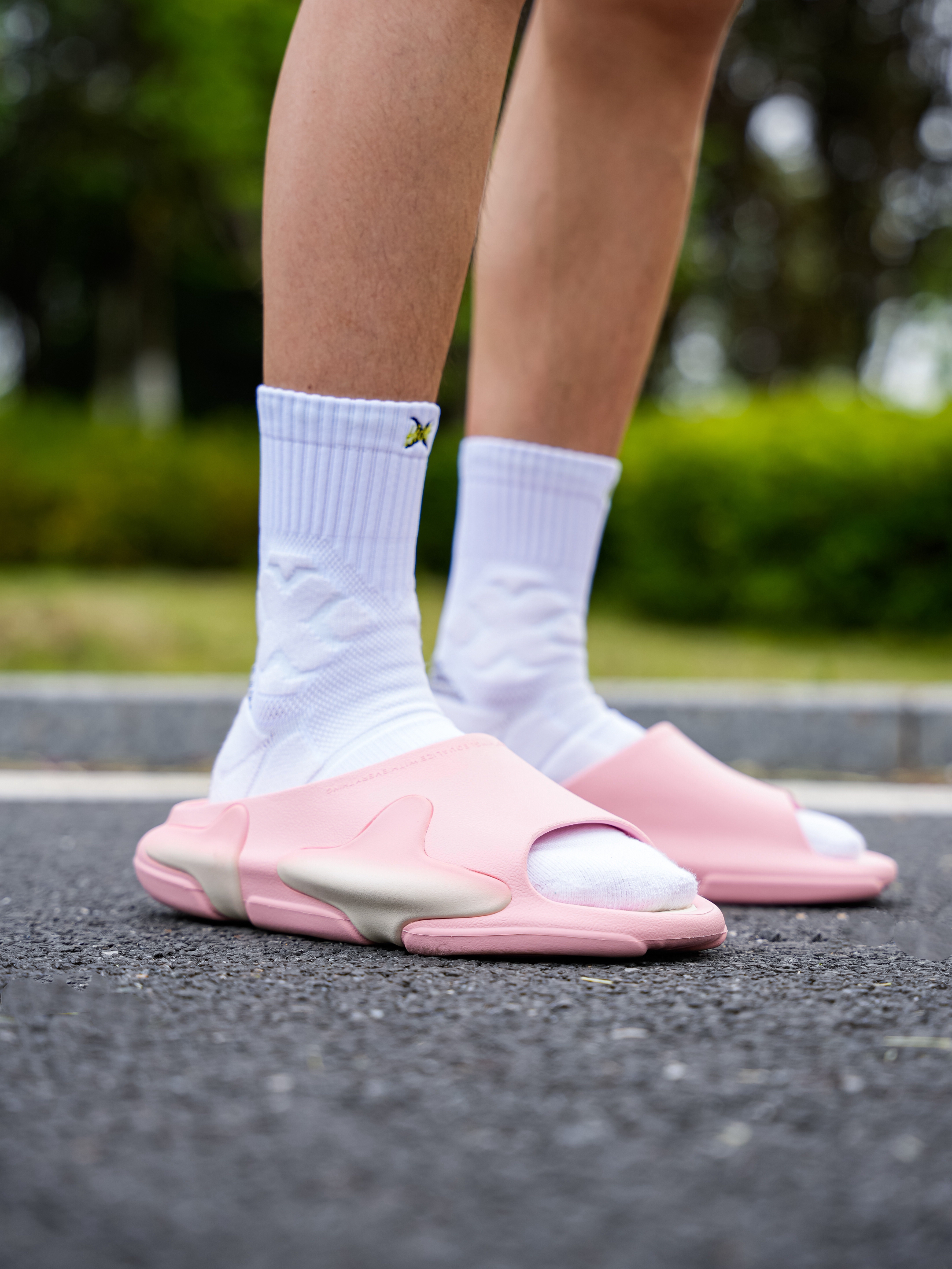 粉色的拖鞋我还是第一次穿,好像叫草莓奶油 仔细一看确实有点像!配色好看同时脚感也挺舒服,不是特别软那种,尺码可以正常选择,但我感觉这双粉色男生真的会穿出门嘛!