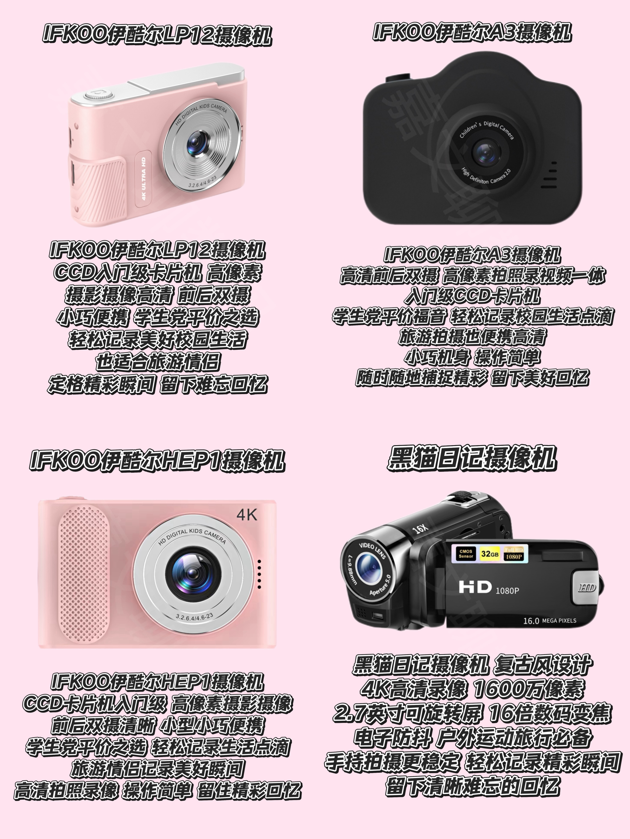 本篇笔记关联了STAR/远极星 D90 数码摄像机 电子防抖 全高清画质 录像 专业级 便携 黑色 、IFKOO/伊酷尔 LP12 数码相机 前后双摄 高清拍照 小巧 高像素 入门级 粉色、IFKOO/伊酷尔 A3 数码相机 前后双摄 多种滤镜 高像素 录视频 入门级 平价 高清录像 校园记录生活 黑色等商品,为用户提供真实的使用体验和购买参考。