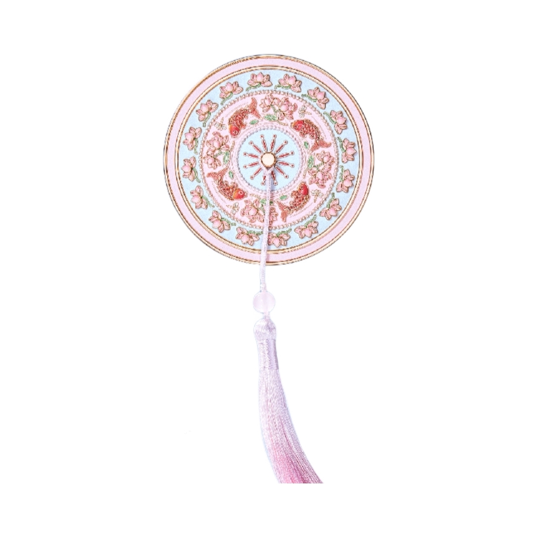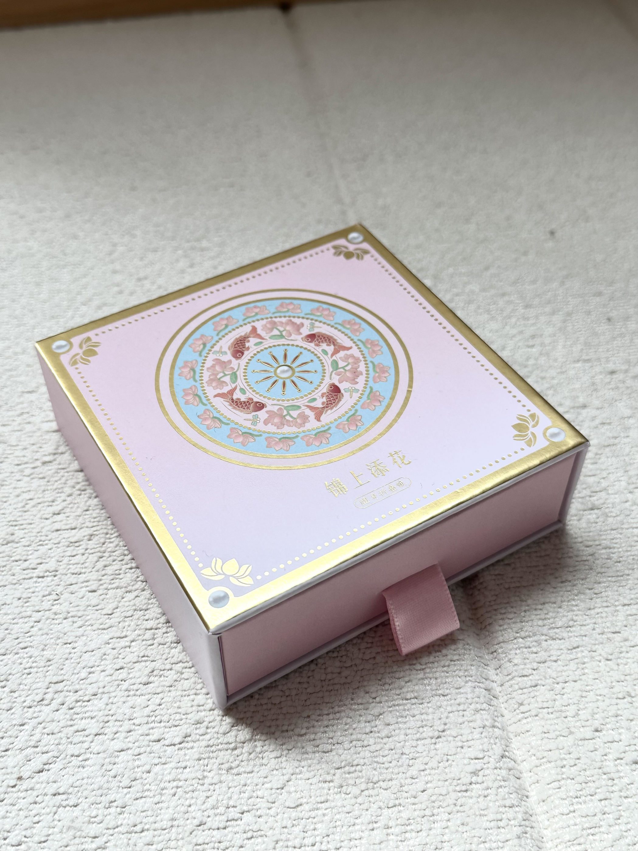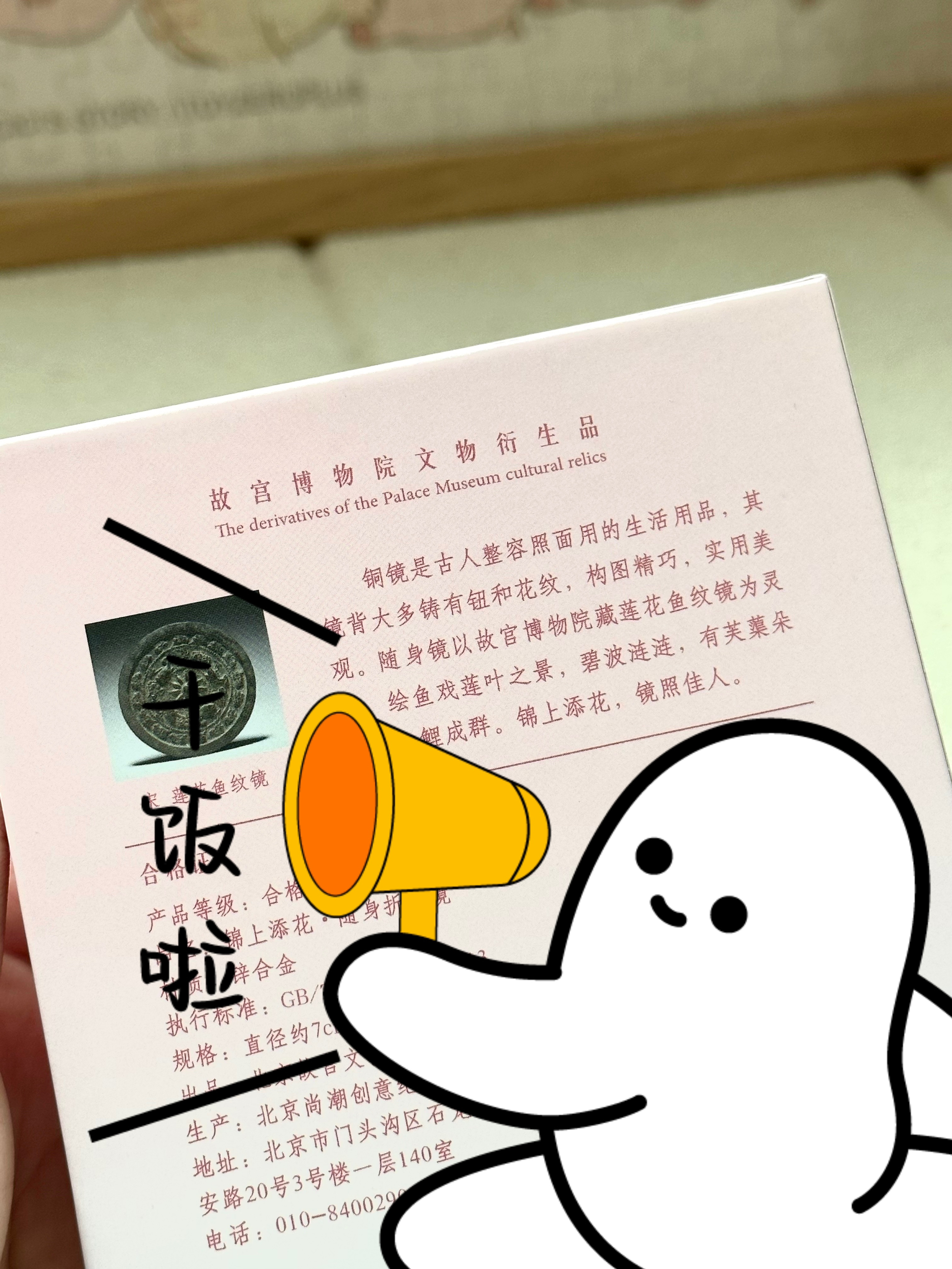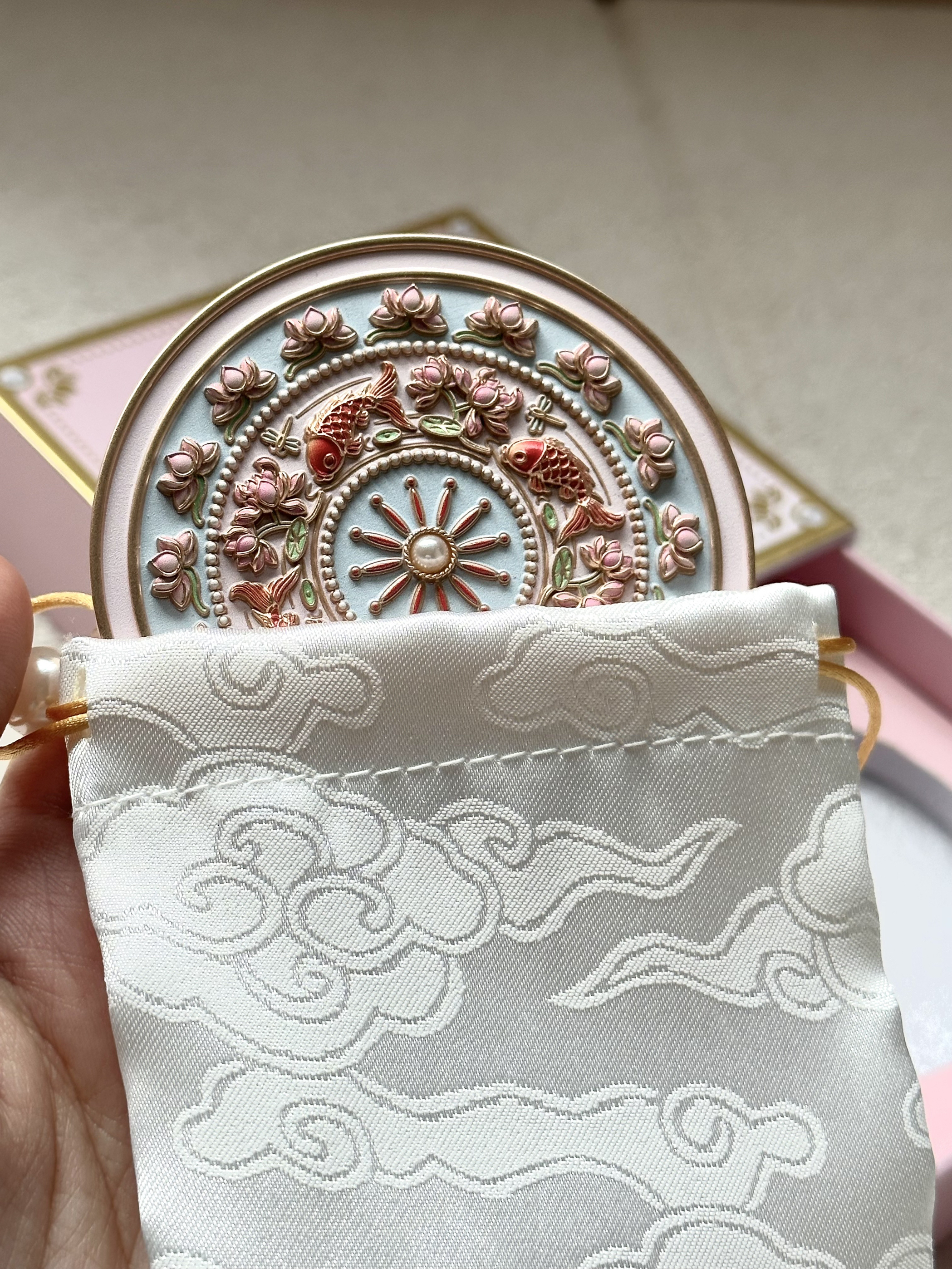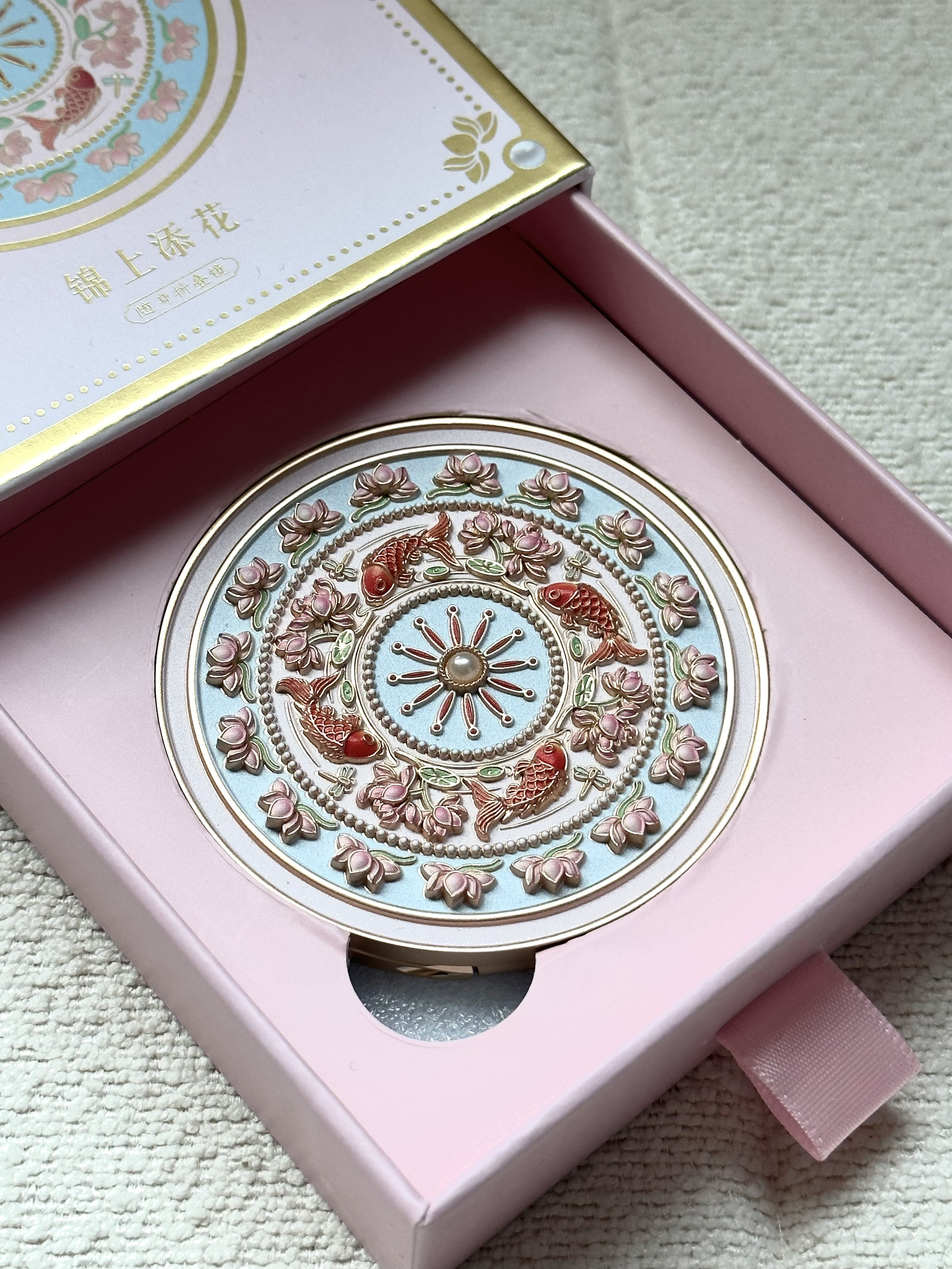 第一次接触这种文创的东西 居然可以做得这么美!这么有质感! 这么有种古典美的感觉呢 这种嫩粉也很高级✌︎' ֊' 雕刻也很细致! 真的作为送礼也很高档! 不会觉得只送一块镜子 只会觉得是艺术品 哈哈哈哈 包装盒后面还有参照文物说明 又学到了新知识👍🏻