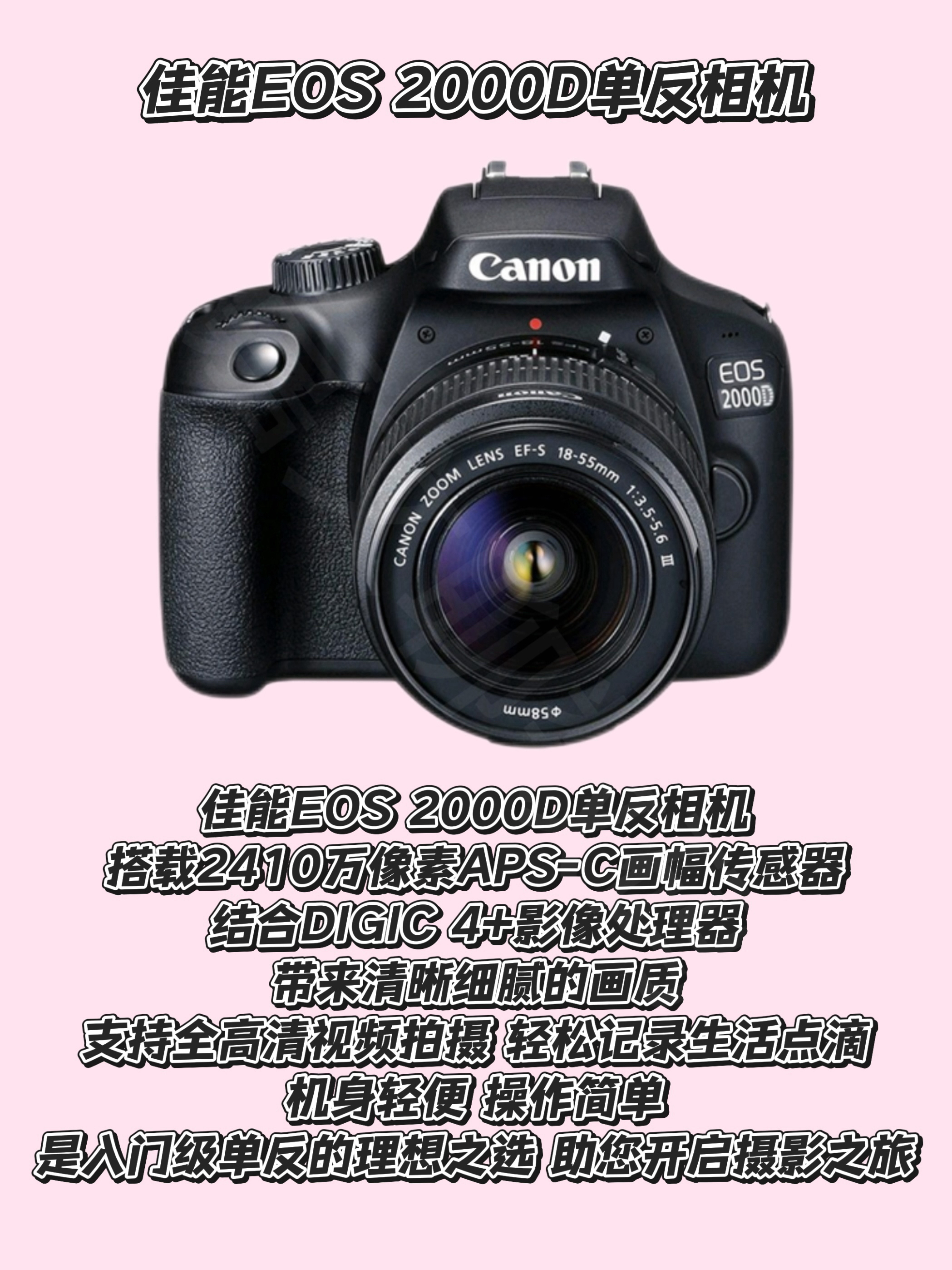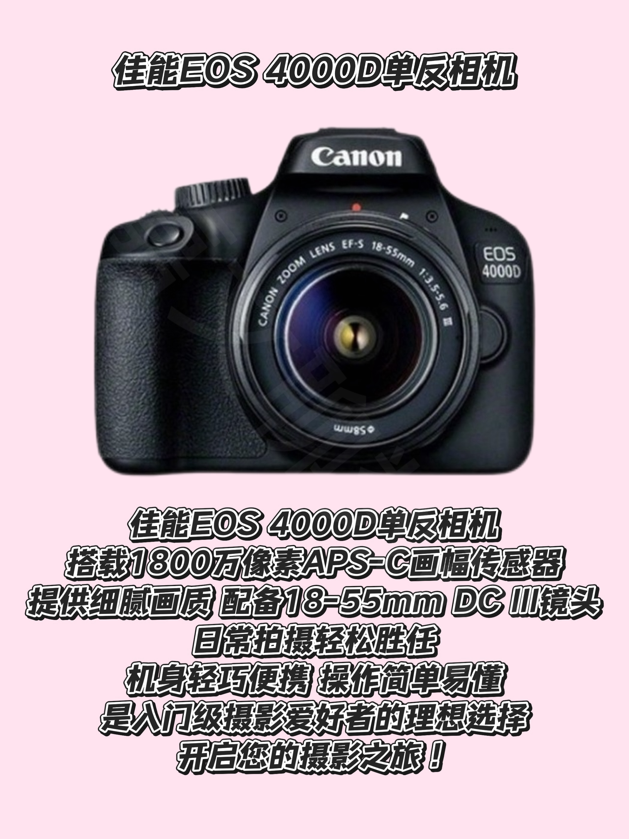 本篇笔记关联了Canon/佳能 EOS 4000D 单反相机 入门级 旅游 黑色、Canon/佳能 EOS 2000D 单反相机 短视频 旅游 高清数码 机身+18-55mm IS II镜头、Canon/佳能 EOS R100 微单相机 入门级 半画幅 小巧轻便 4K视频 旅游照相机 轻量 黑色单机-RF-S18-45 STM套机等商品,为用户提供真实的使用体验和购买参考。
