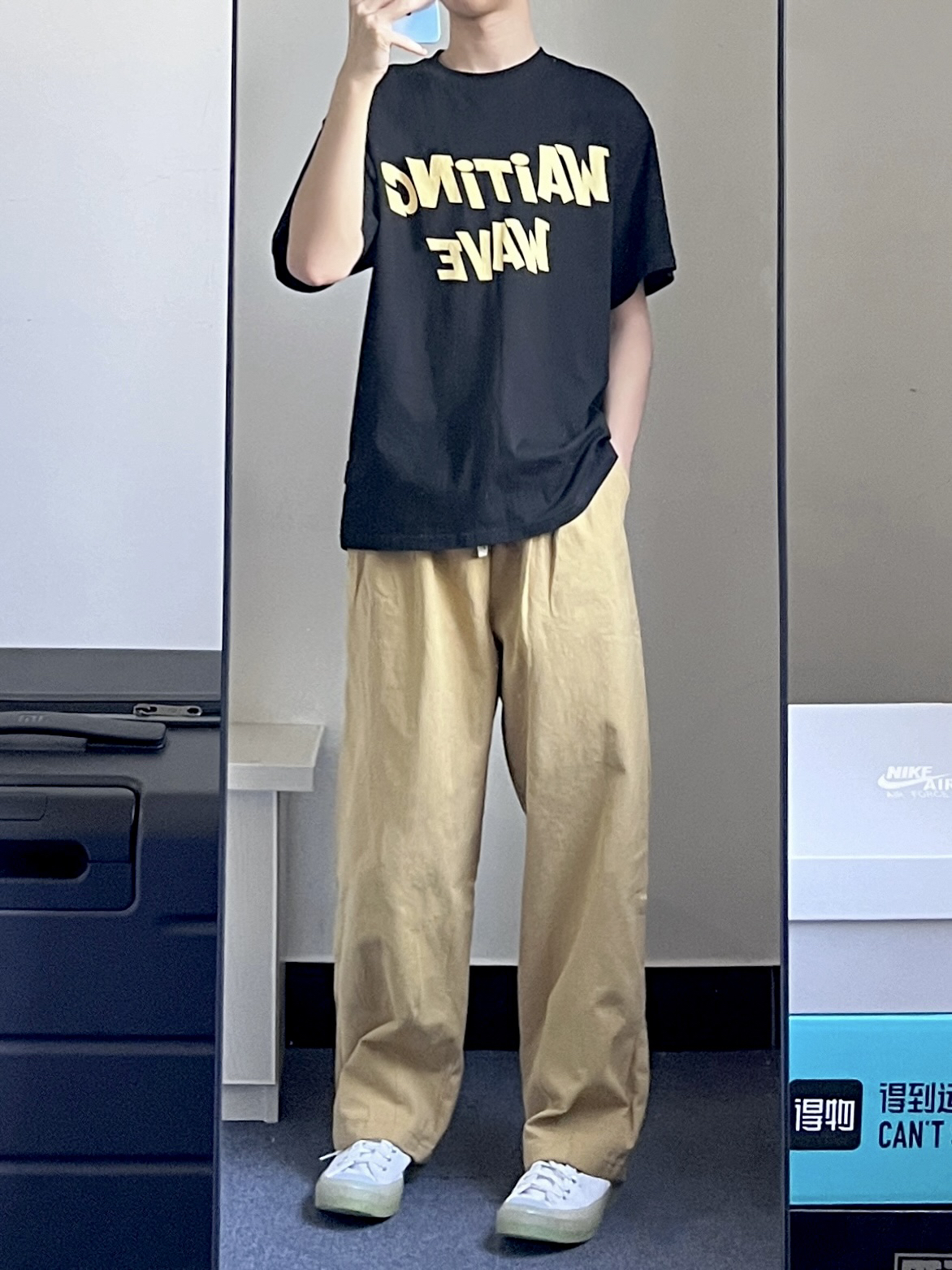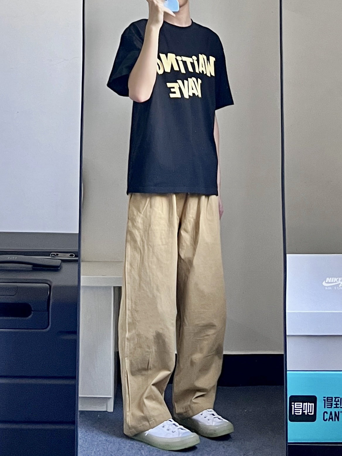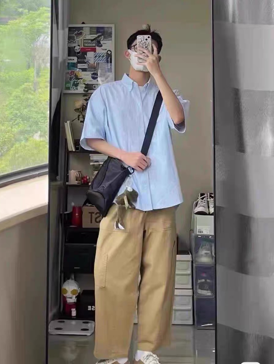 今天穿这条卡其色的裤子👖 搭配的是匡威果冻底白色高帮帆布鞋🙋 夏天这一身宽松舒适又好看🌟