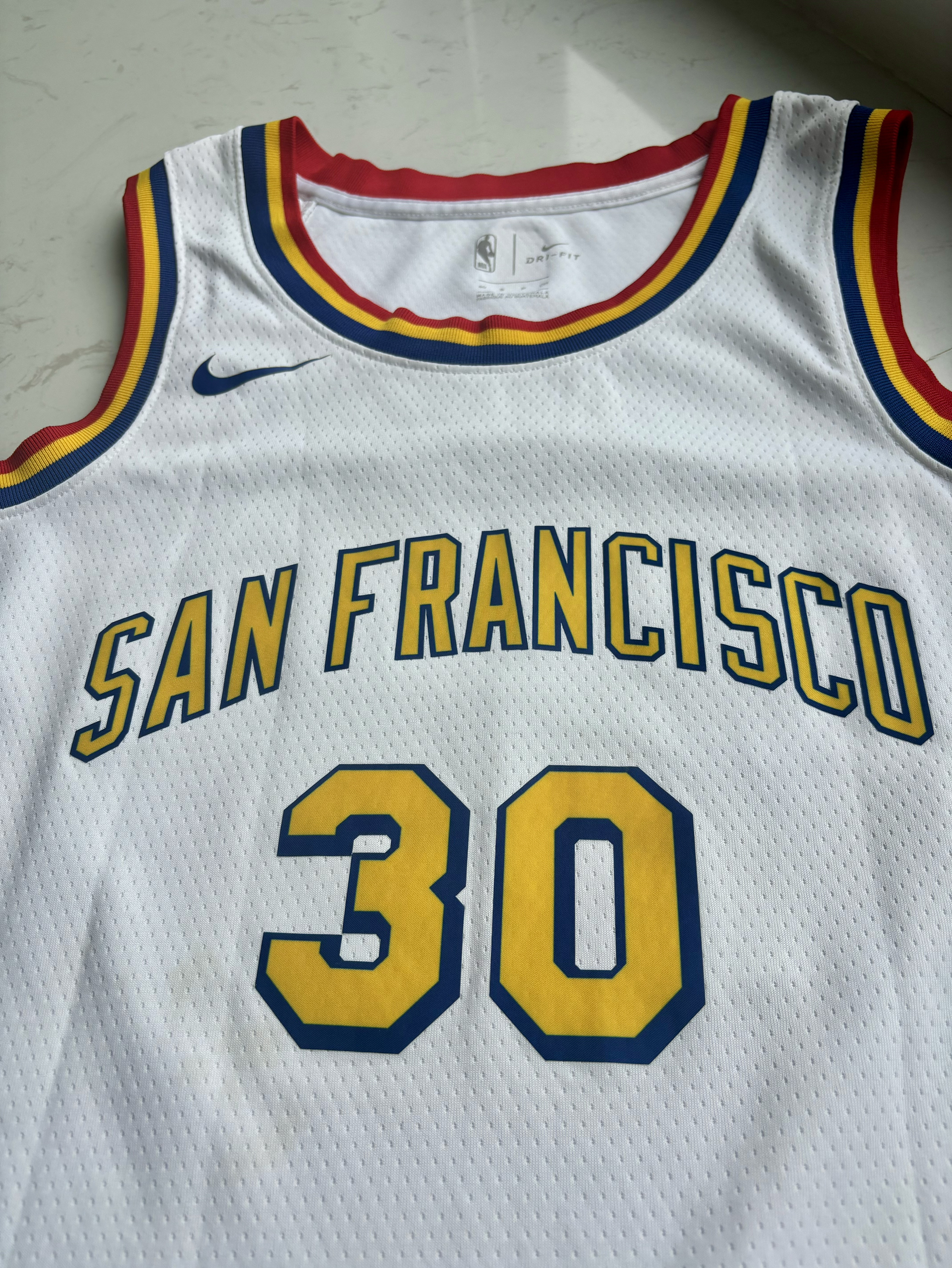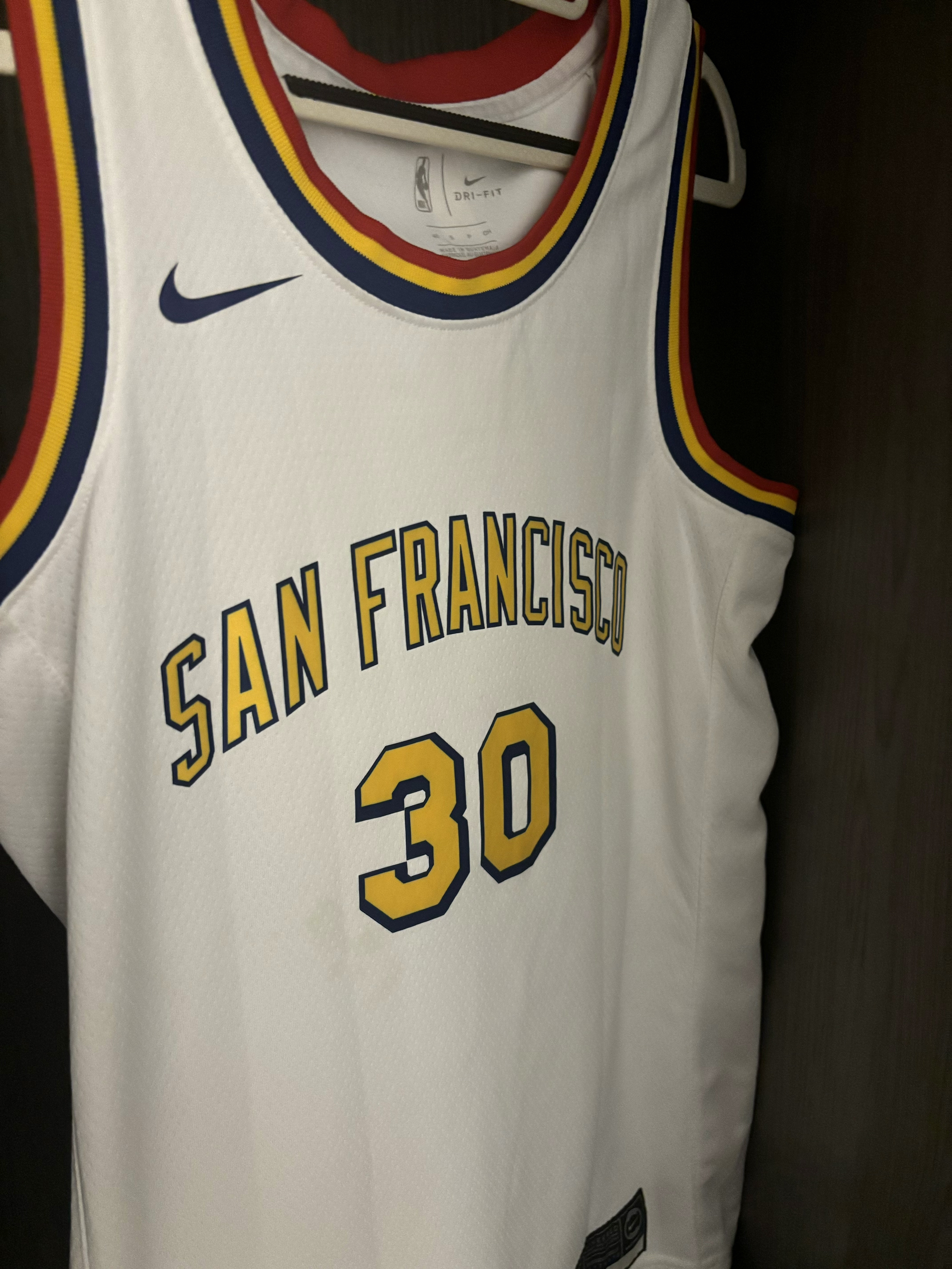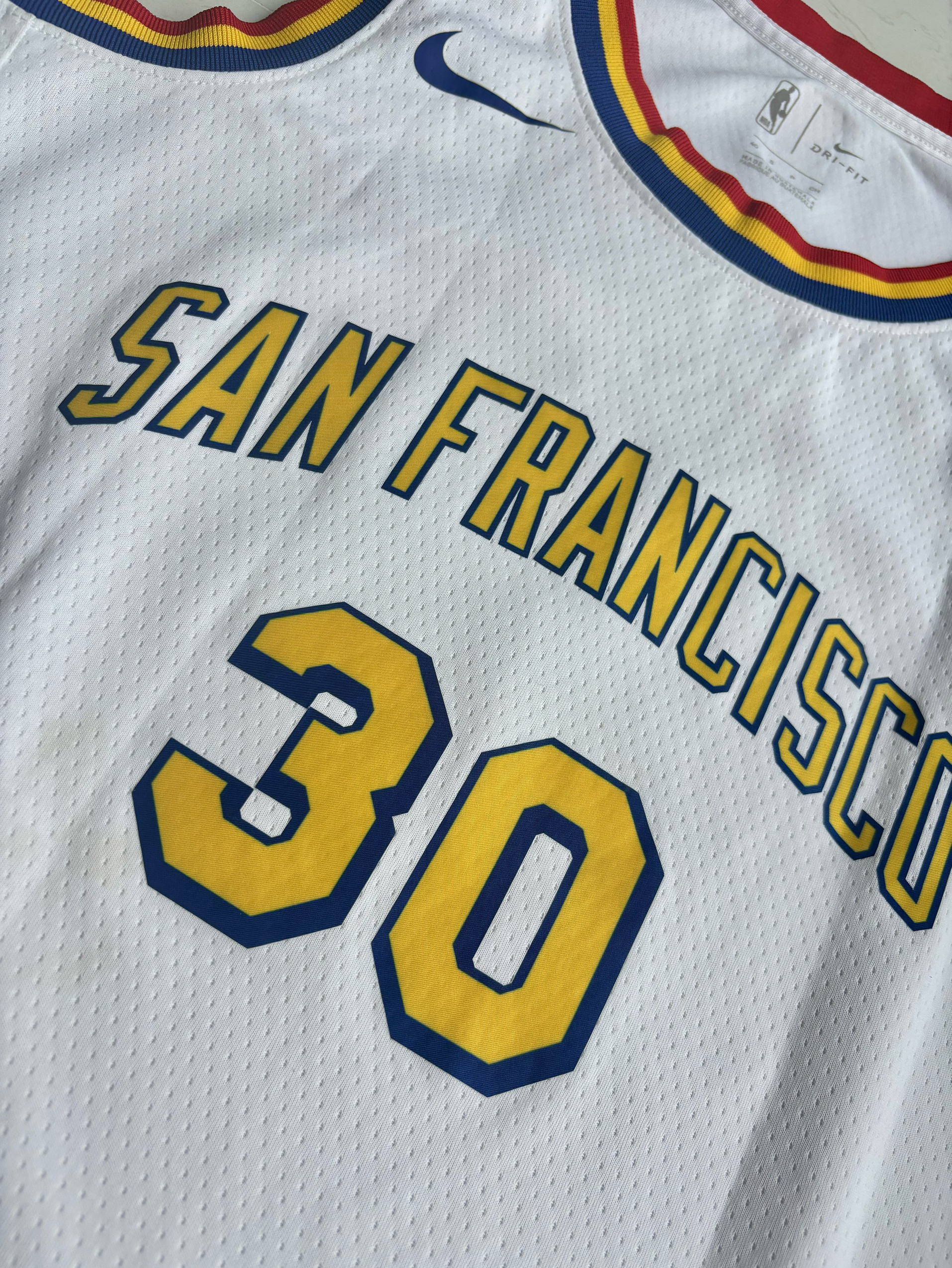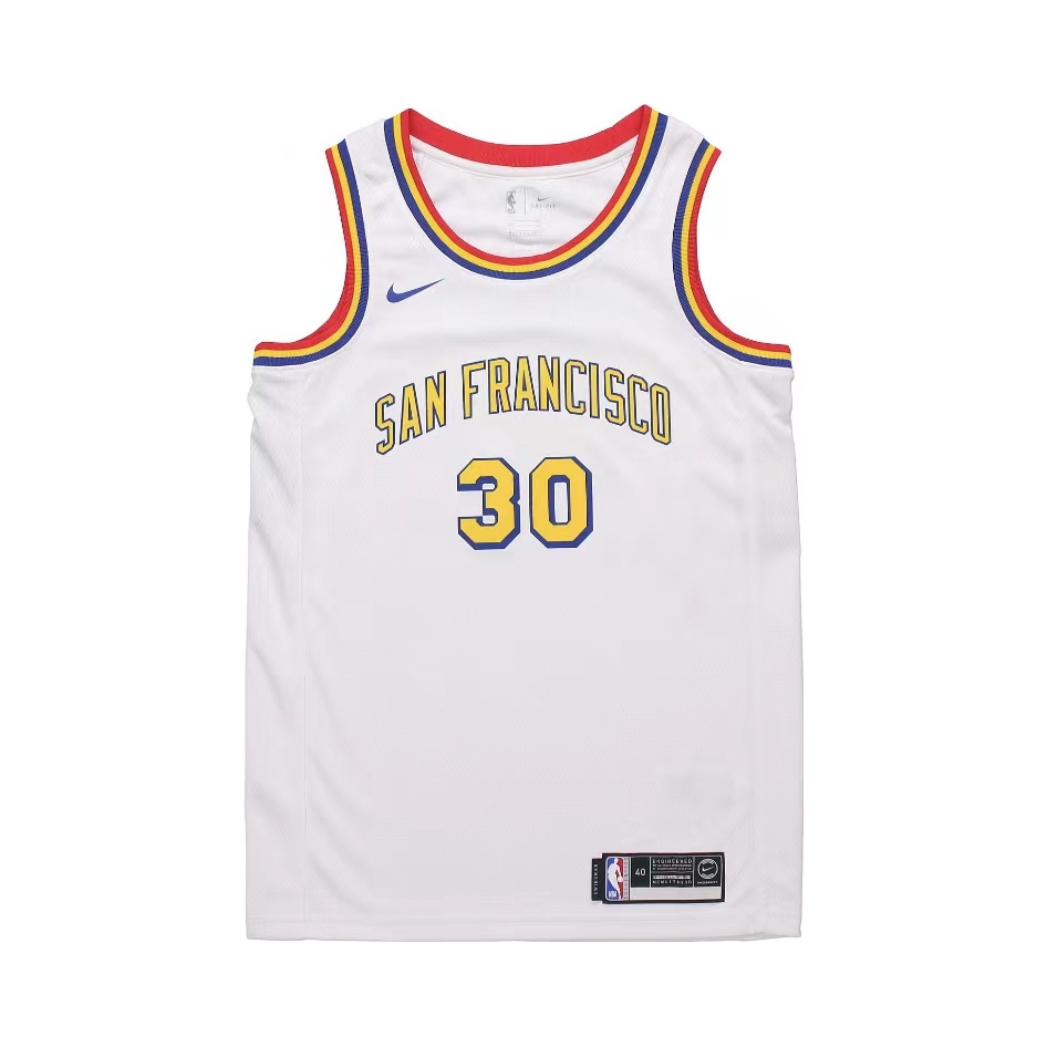 19-20赛季金州勇士的城市版球衣 那个赛季库里并没有打太多的比赛,赛季开始就因为手部伤势缺席了大部分时间,复出后仅仅打了一场就因为😷问题全联盟停赛,而后的迪士尼园区复赛计划勇士队也并不在其中,所以库里19-20赛季的出场次数也就仅仅定格在了5场 回到这件球衣,库里赛季复出第一场曾穿过这件球衣,并且完成了一记精彩的3+1,球衣白黄的配色也是十分耐看,球衣原形是1962年勇士从费城搬入旧金山的复古版...