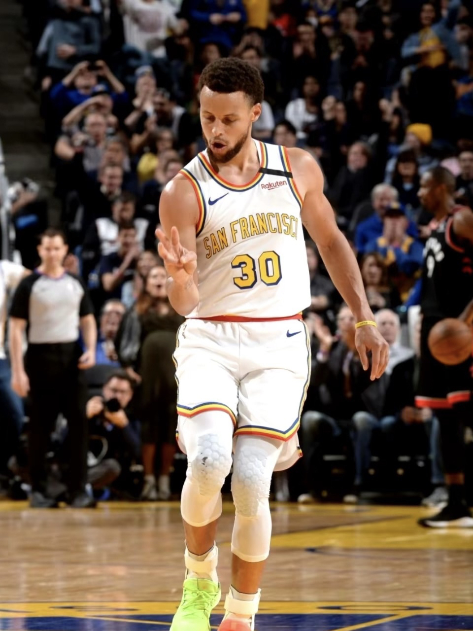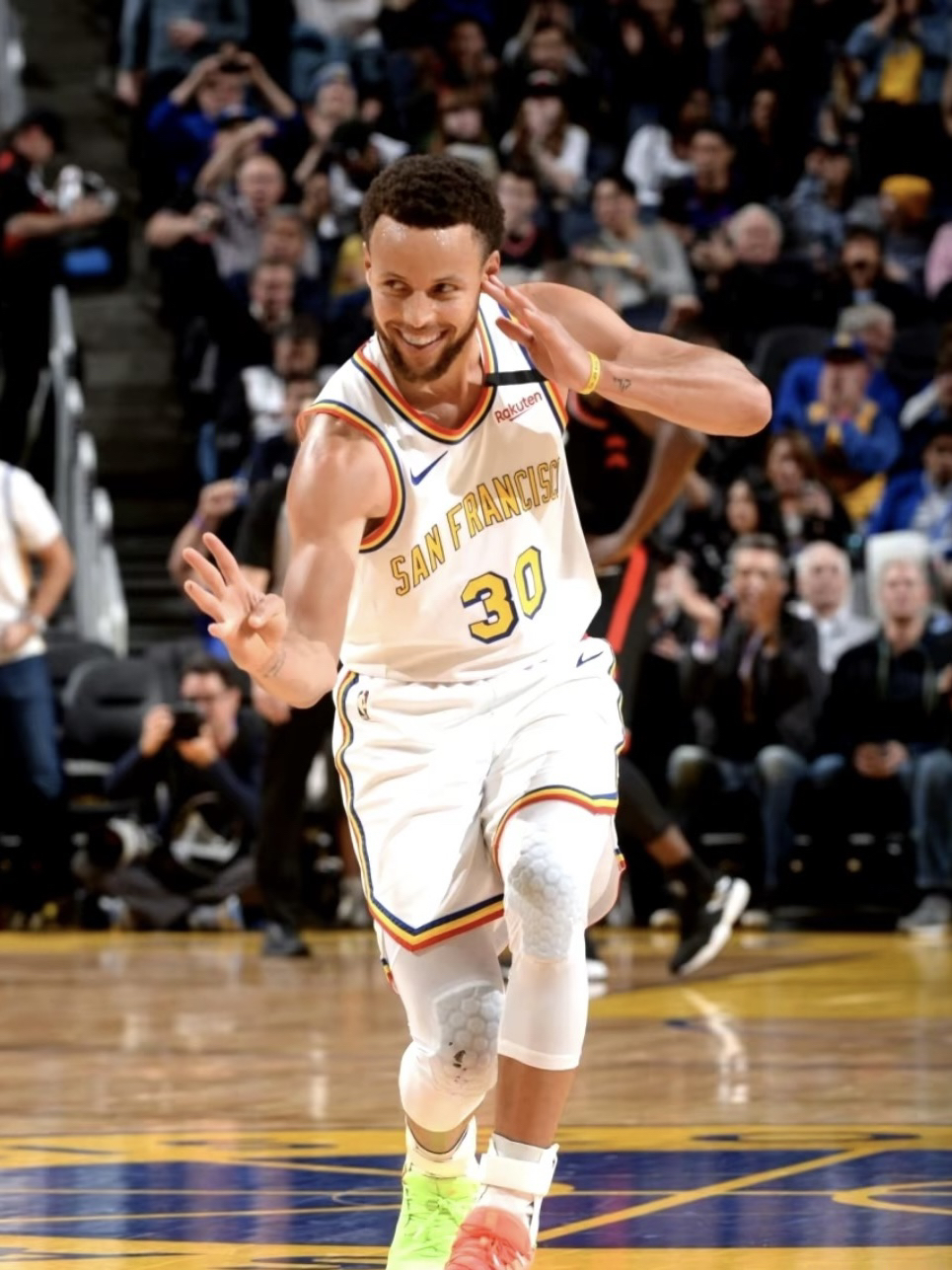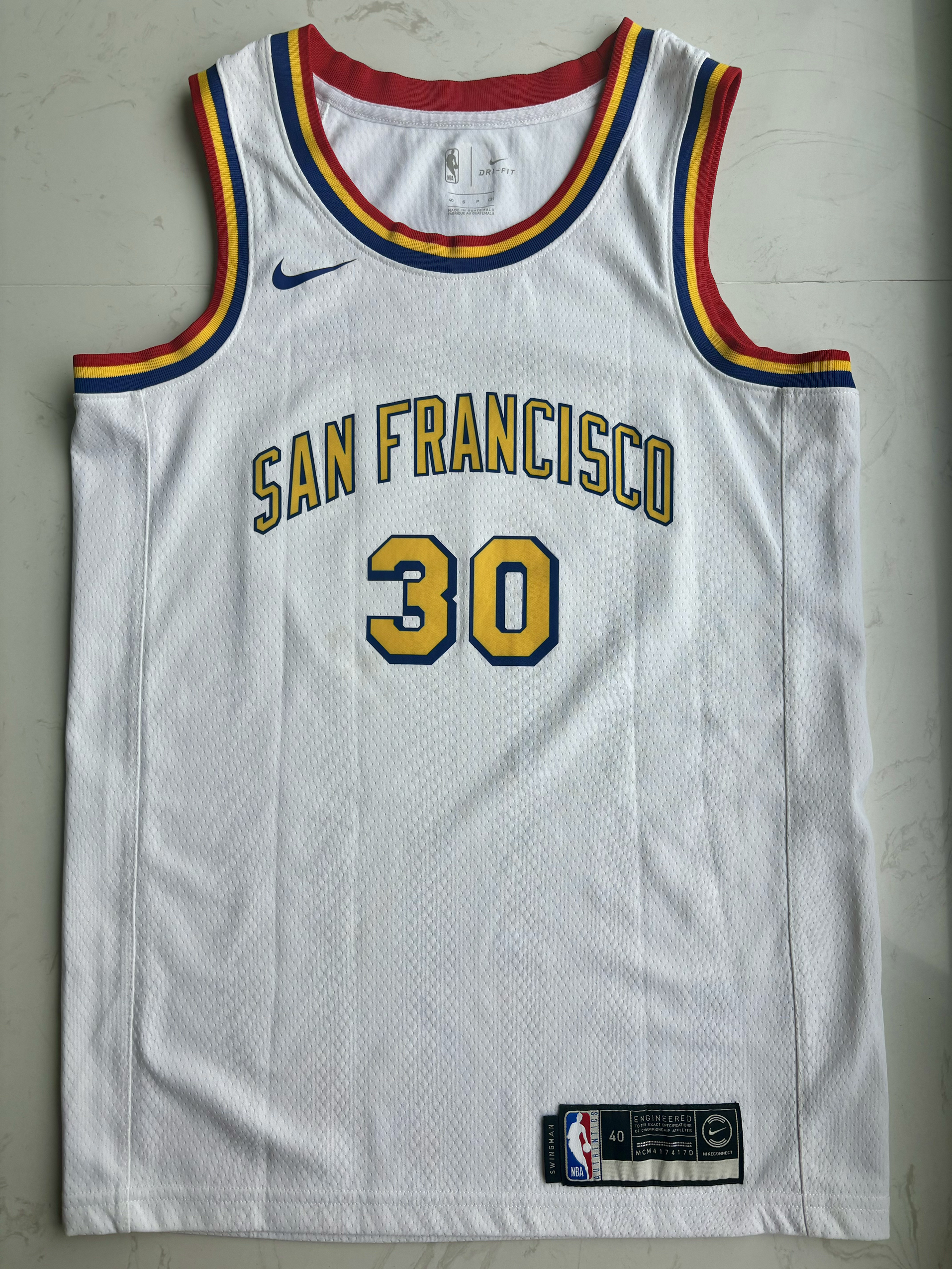 19-20赛季金州勇士的城市版球衣 那个赛季库里并没有打太多的比赛,赛季开始就因为手部伤势缺席了大部分时间,复出后仅仅打了一场就因为😷问题全联盟停赛,而后的迪士尼园区复赛计划勇士队也并不在其中,所以库里19-20赛季的出场次数也就仅仅定格在了5场 回到这件球衣,库里赛季复出第一场曾穿过这件球衣,并且完成了一记精彩的3+1,球衣白黄的配色也是十分耐看,球衣原形是1962年勇士从费城搬入旧金山的复古版...