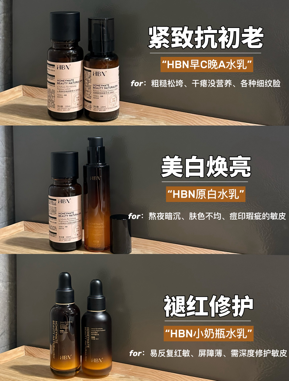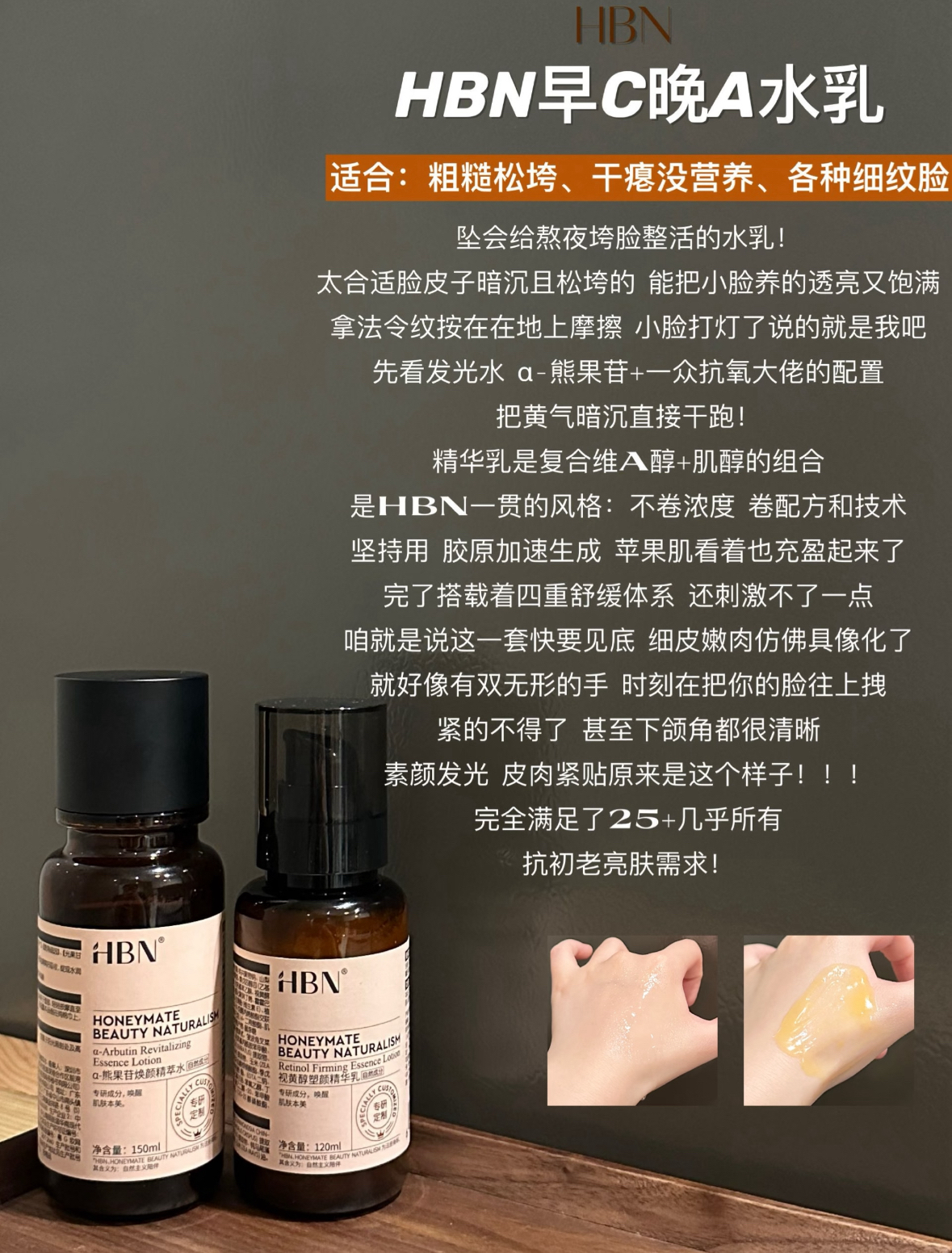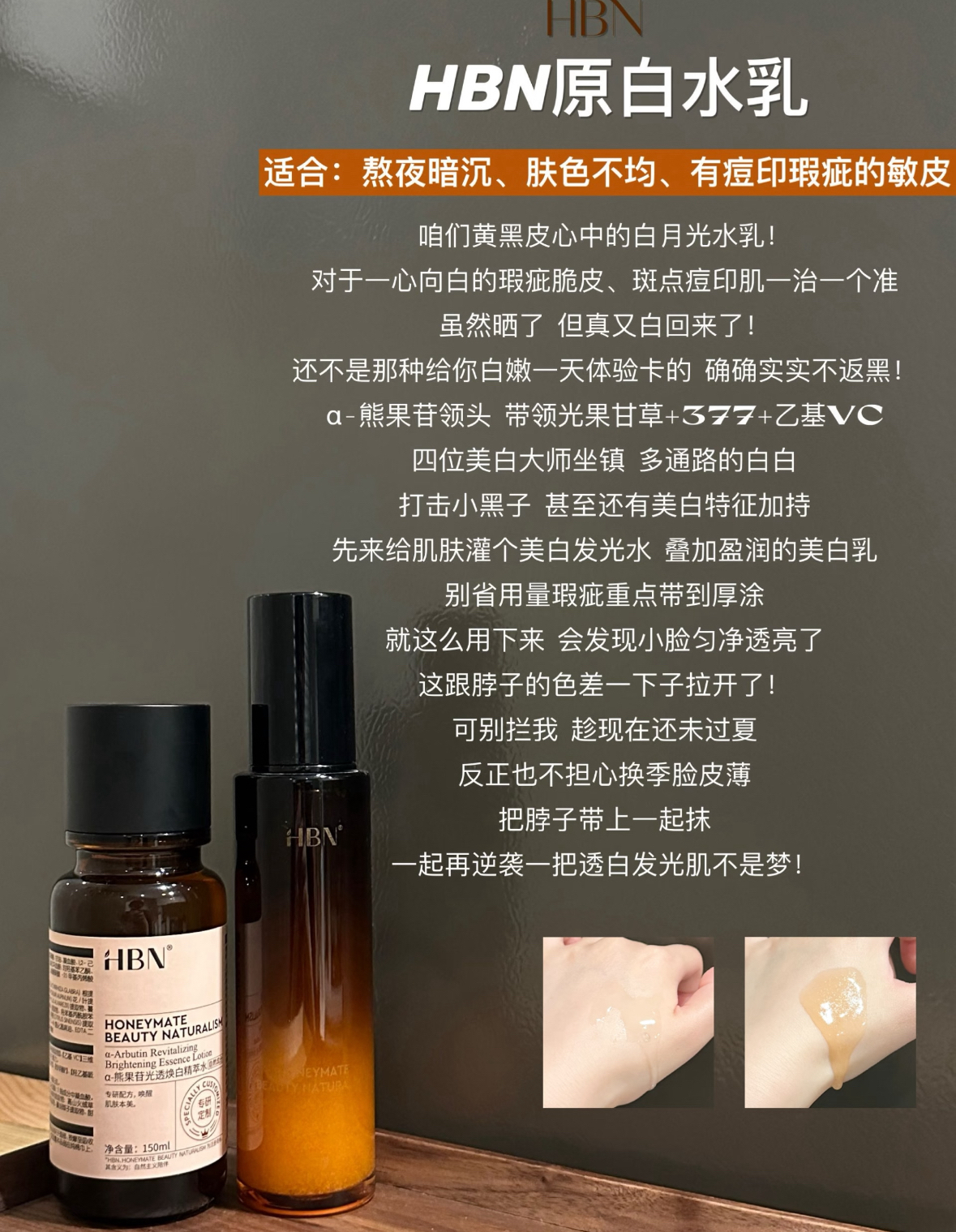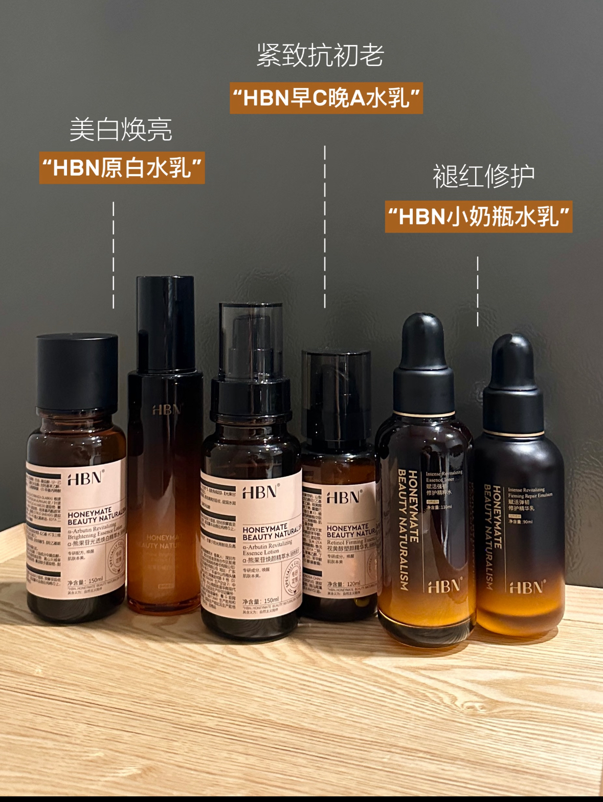 本篇笔记关联了HBN 熊果苷早C晚A护肤套装【水+乳】 提拉紧致焕亮祛斑淡纹 【2.0】发光水150ml+精华乳120ml、HBN 精粹水乳套装【水+乳】紧致舒缓泛红强韧屏障 水110ml+乳90ml、HBN 特证版三重蛋白护肤套装 提拉紧致弹润美白祛斑焕亮不反黑促弹 发光水150ml+原白乳90ml等商品,为用户提供真实的使用体验和购买参考。