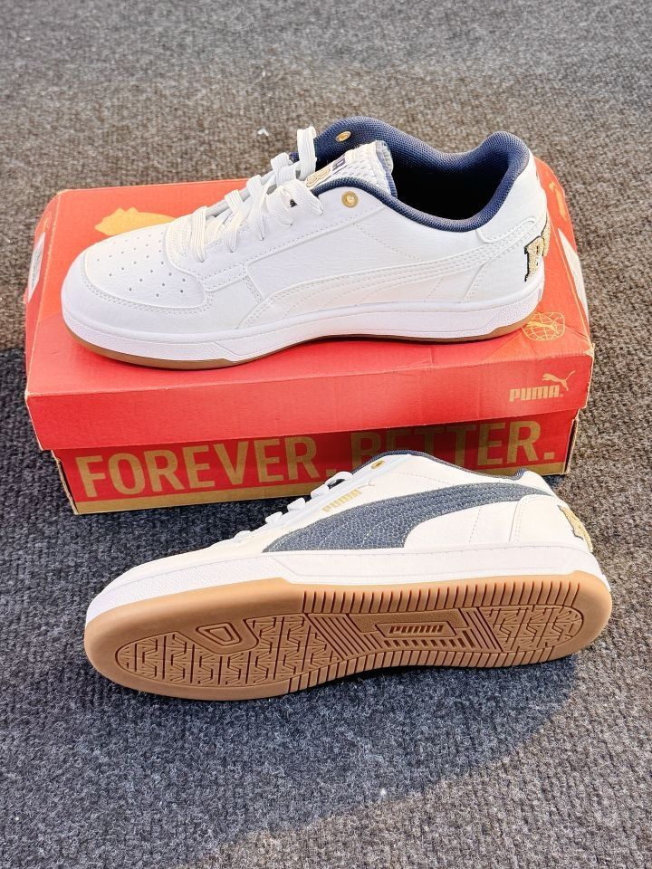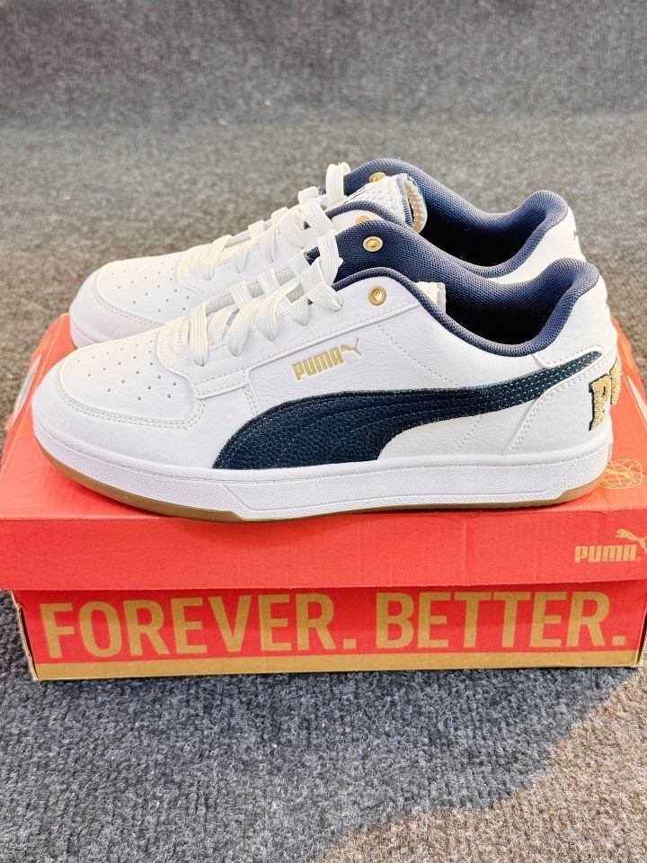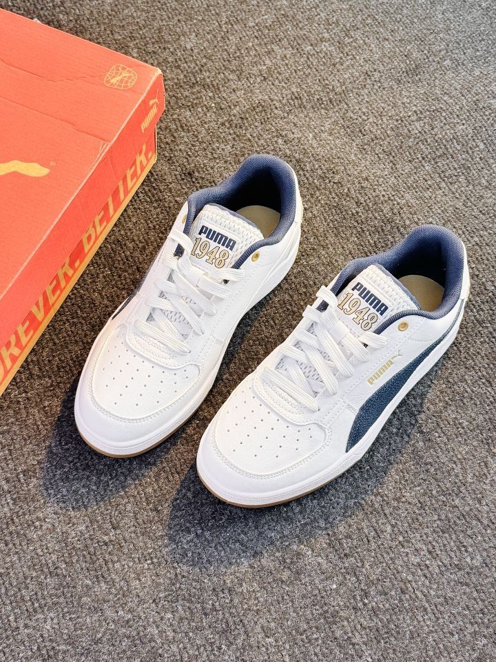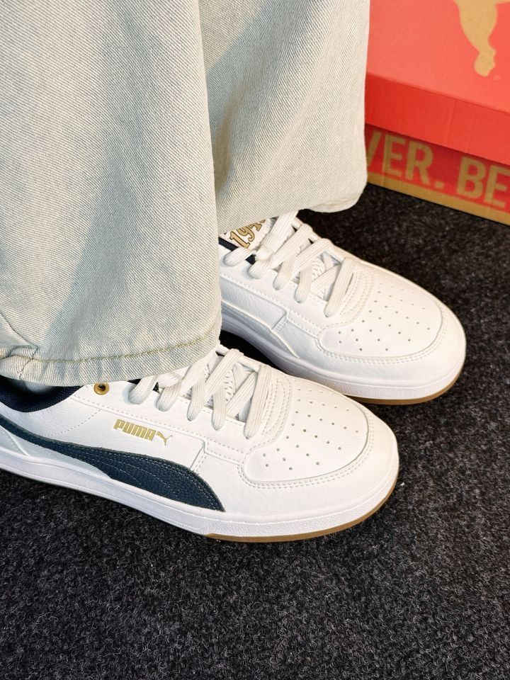 时尚运动党必入 | PUMA板鞋来袭 👟鞋面以纯净白色打底,搭配深邃海军蓝侧边条纹,简约又不失时尚感,经典的配色组合,无论是运动风穿搭,还是休闲装,都能轻松适配,出街吸睛度拉满。 🌟细节之处尽显品质,鞋侧精致的“PUMA” 标识,搭配亮眼的金属鞋带孔,质感瞬间提升。 🌈优质皮革材质,耐磨又耐造,脚感舒适,日常通勤、运动健身穿都没问题。 快穿上它,迈出时尚步伐,开启活力满满的每一天!