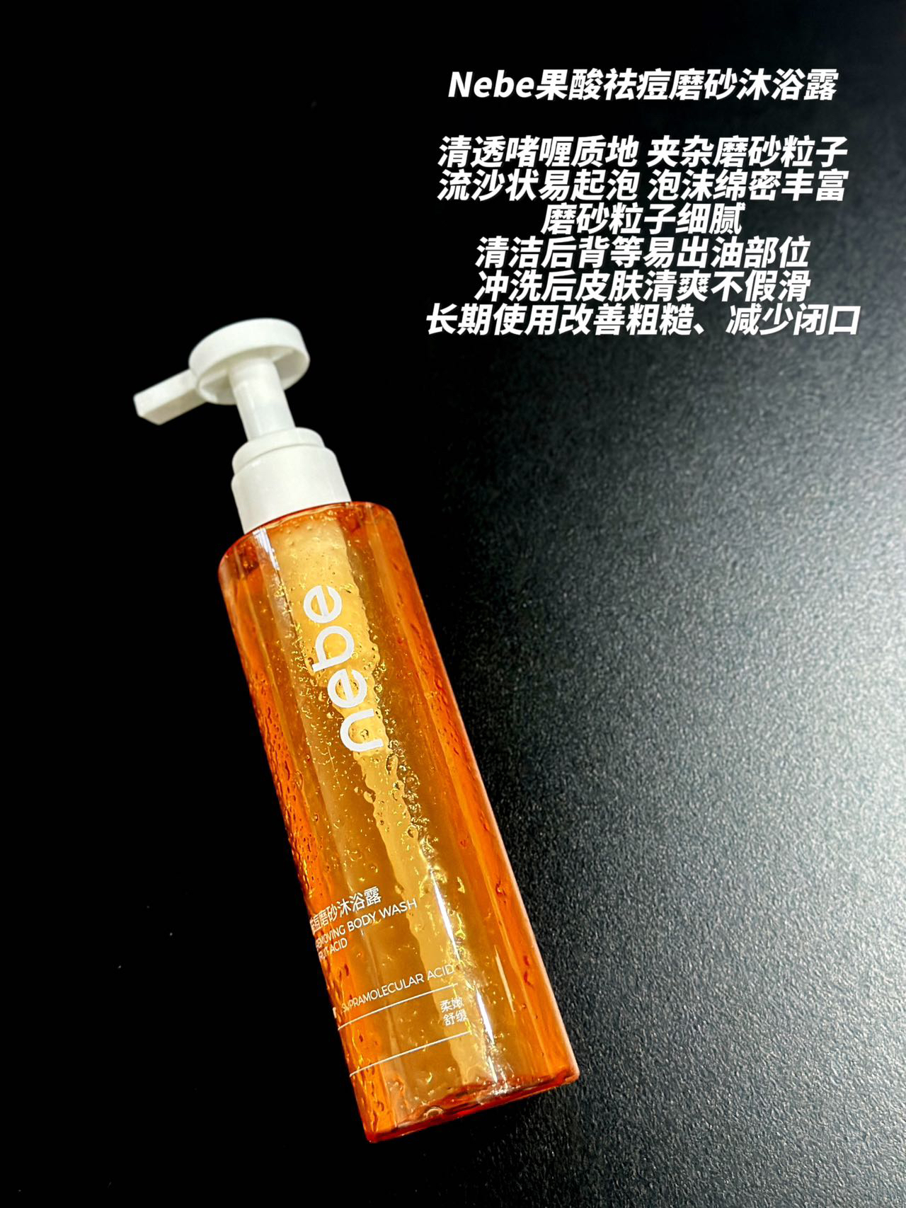 Nebe果酸祛痘磨砂沐浴露 清透啫喱质地 夹杂磨砂粒子 流沙状易起泡 泡沫绵密丰富 磨砂粒子细腻 清洁后背等易出油部位 冲洗后皮肤清爽不假滑 长期使用改善粗糙、减少闭口 欧舒丹马鞭草身体乳 清透乳液质地 吸收很快不黏腻 中性香 柠檬柑橘夹杂着青草气息 呵美洗发水 透明啫喱质地 流动性强 泡沫丰富绵密 上头皮后有清凉感 易冲洗无残留 吹干后头发蓬松柔顺 雅诗兰黛洁面乳 泡沫细腻 不会让皮...