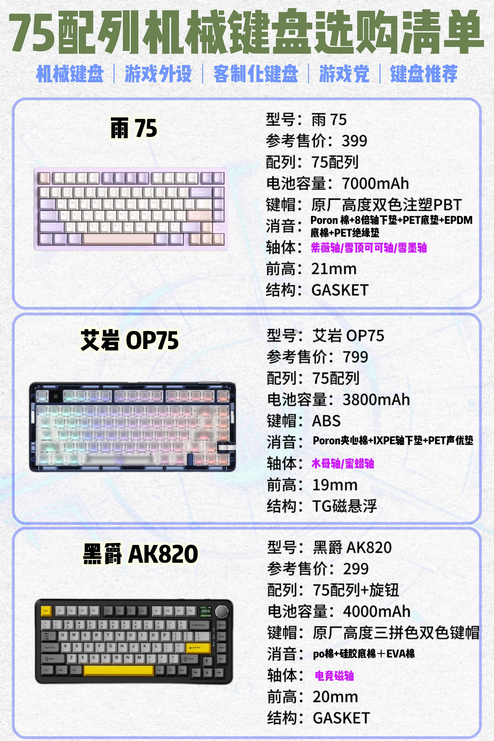 本篇笔记关联了AULA/狼蛛 F75 三模 机械键盘 80键 收割者轴 新月轴 冰脉轴 客制化 热插拔 全键 性价比高 冰川蓝 游戏、GANSS/高斯 XS75T 三模 机械键盘 75键 热升华 云门黄、Ajazz/黑爵 AK820 三模 机械键盘 81键 TFT彩屏 1.2mm单键开槽 客制化 热插拔 全键 青轴 消音 红轴 蓝白紫等商品,为用户提供真实的使用体验和购买参考。
