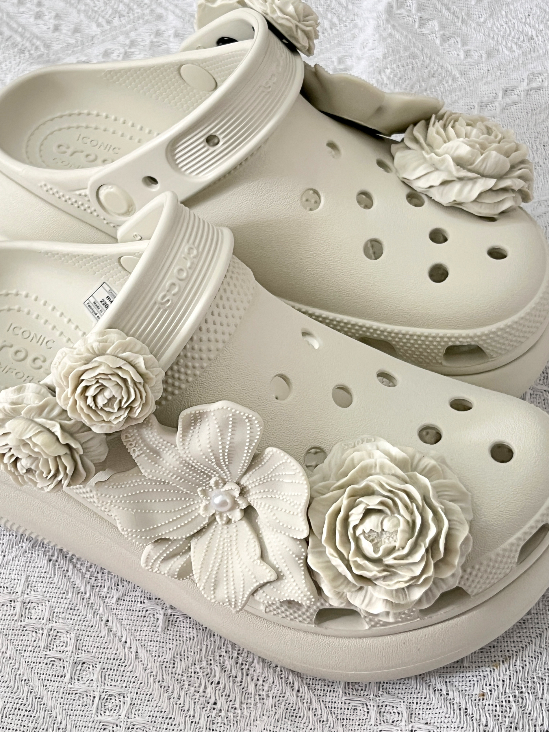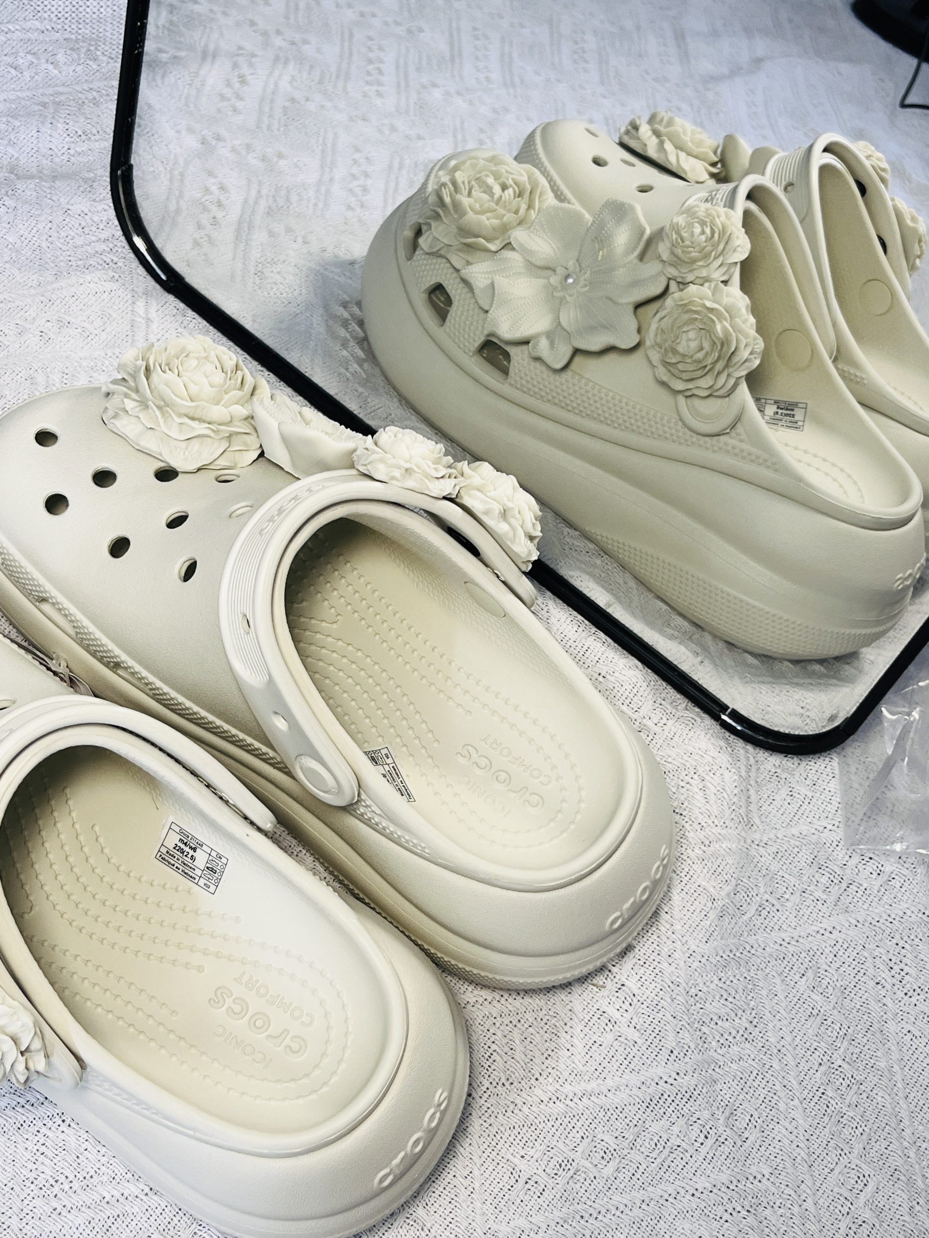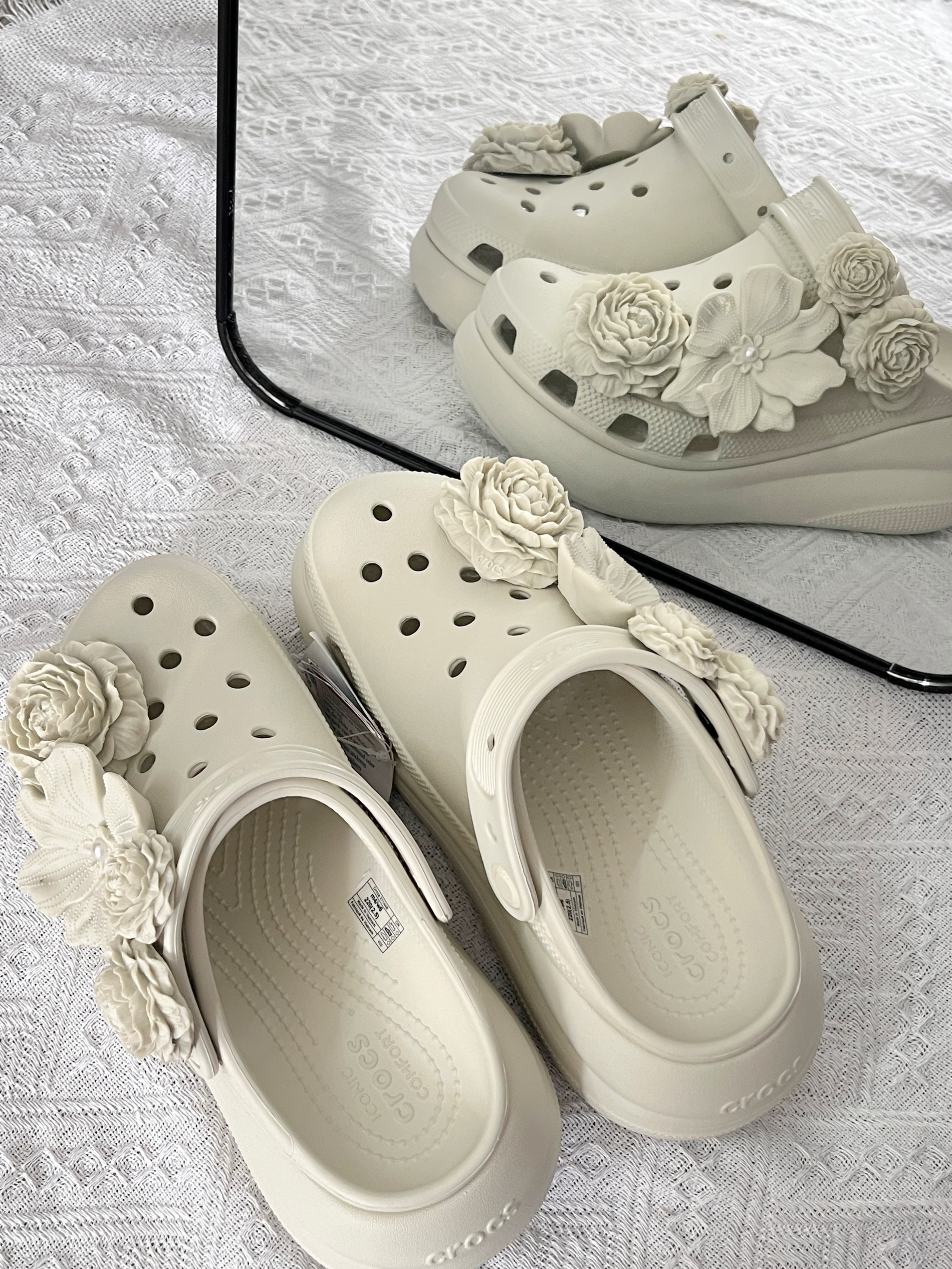 宝子们,一眼沦陷的Crocs花朵洞洞鞋必须安利给你们! 这双鞋简直是时尚与舒适的完美融合。奶呼呼的配色,温柔又百搭,不管是搭小短裙还是阔腿裤,瞬间就能提升整体造型的精致感。鞋面上立体花朵装饰,细节满满,仿佛把春日花园踩在脚下,走在路上回头率爆表! 而且Crocs家的Croslite材质,脚感软乎乎的,就像踩在云朵上,轻盈又透气。走路久了也不累脚,日常出行、逛街,完全无压力。 谁穿谁好看,真的很难不...