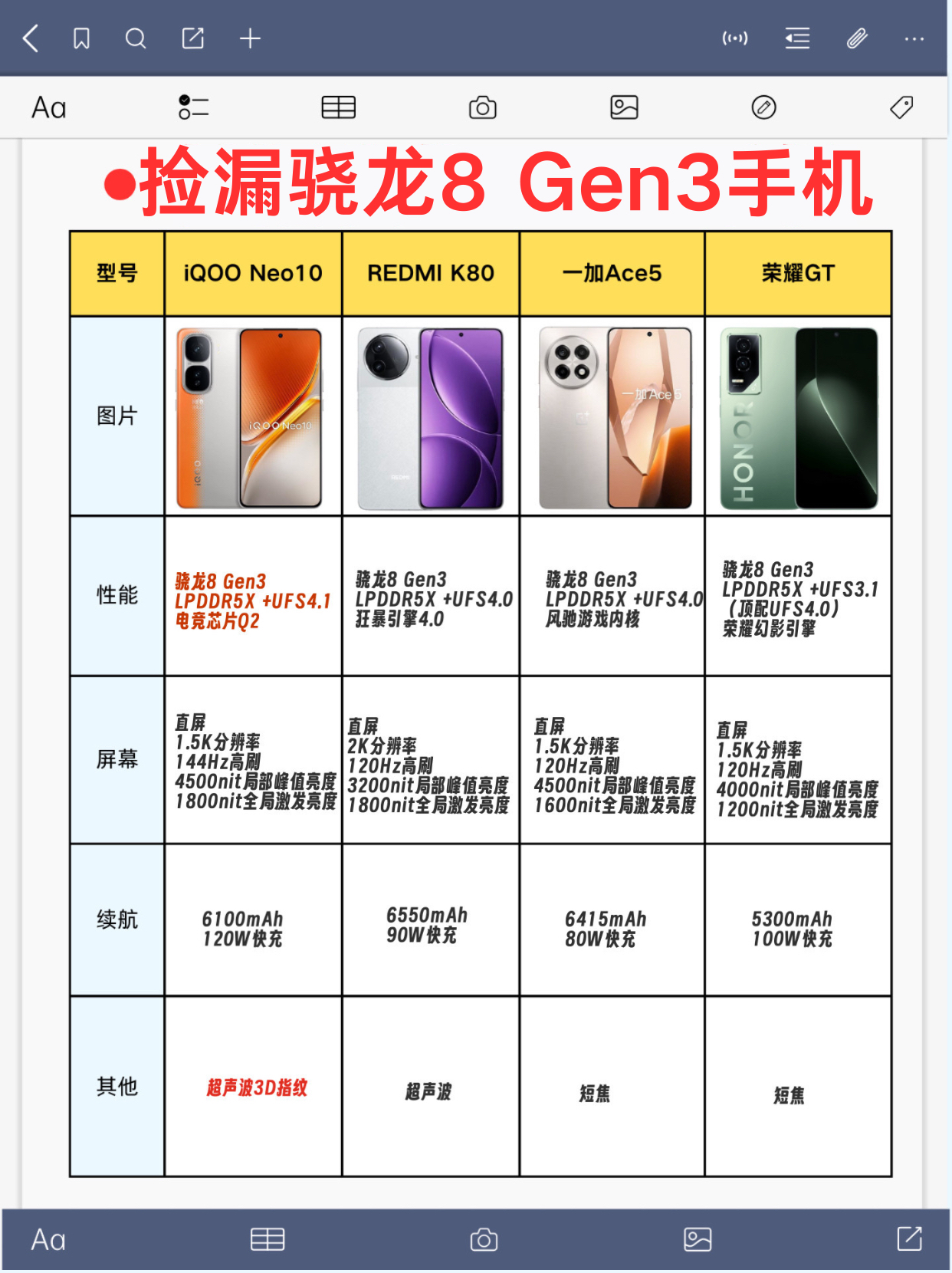 最近很多骁龙8 Gen3的手机迎来了大促优惠,部分热门配置的价格基本上都来到了2000以内,我挑选出了四款目前比较热门的机型给大家做做对比分析,分别是iQOO Neo10、REDMI K80、一加Ace5和荣耀GT,方便大家在选购时能有更明确的方向。 ✅性能 四款机型都是搭载的骁龙8 Gen3处理器并且针对游戏性能做了专属优化,尤其是iQOO Neo10,配备了双芯,自研电竞芯片Q2能大幅提升...