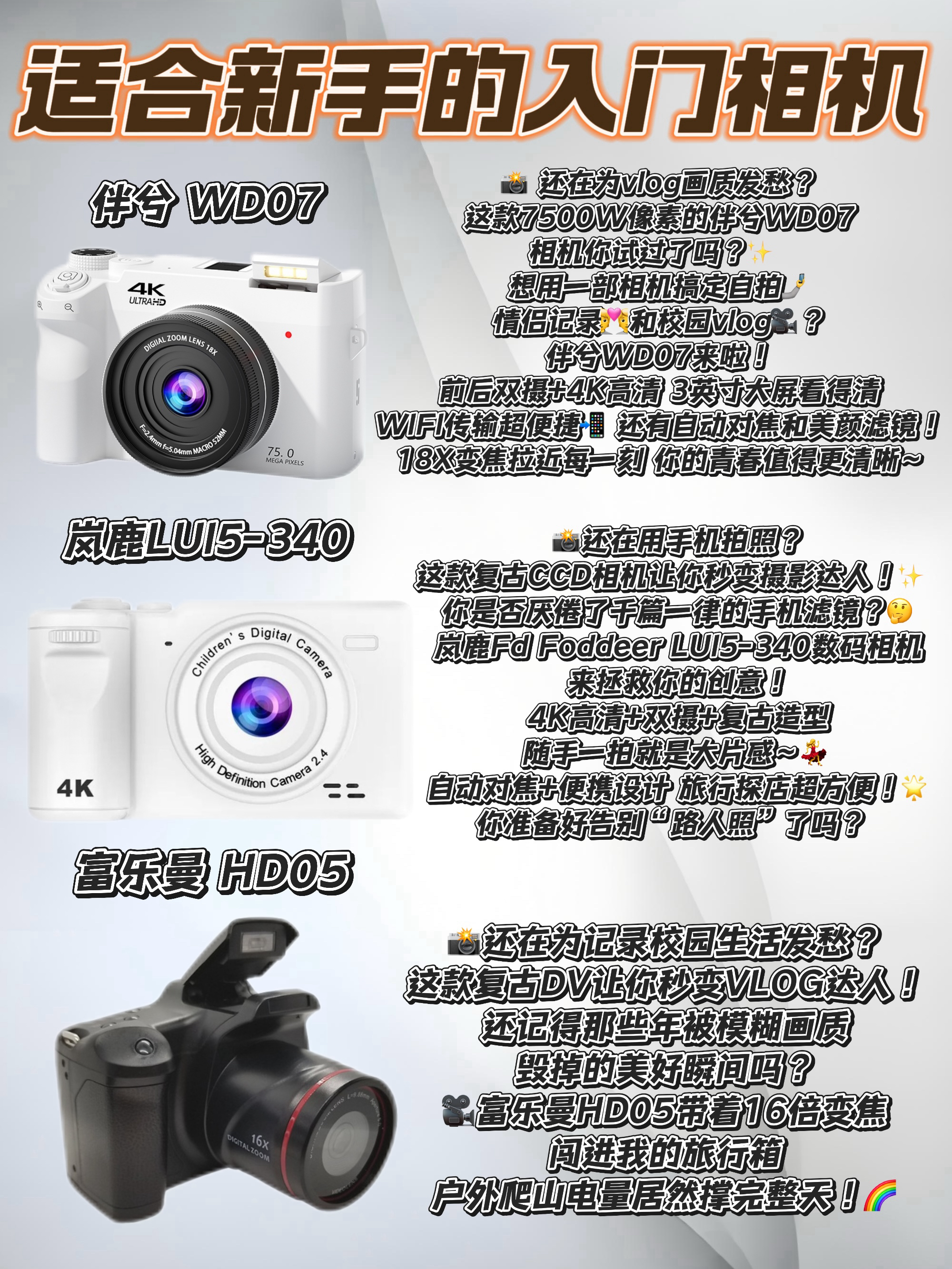 还在为挑选人生首相机纠结吗?😵 作为过来人,我翻遍全网整理出这份《校园摄影装备红榜》!✨ 松典DC306真的只是"入门级"吗?🎯 6400万像素+轻巧机身,拍vlog时连手抖星人都能出片!上周闺蜜用它记录毕业典礼,朋友圈点赞直接破百👏 但...弱光环境画质会糊成油画?🌙 彩族复古相机是颜值党还是实力派?🎞️ CMOS传感器拍出的胶片感绝了!学弟用它扫街还被误认为摄影系学长😂 不过要...
