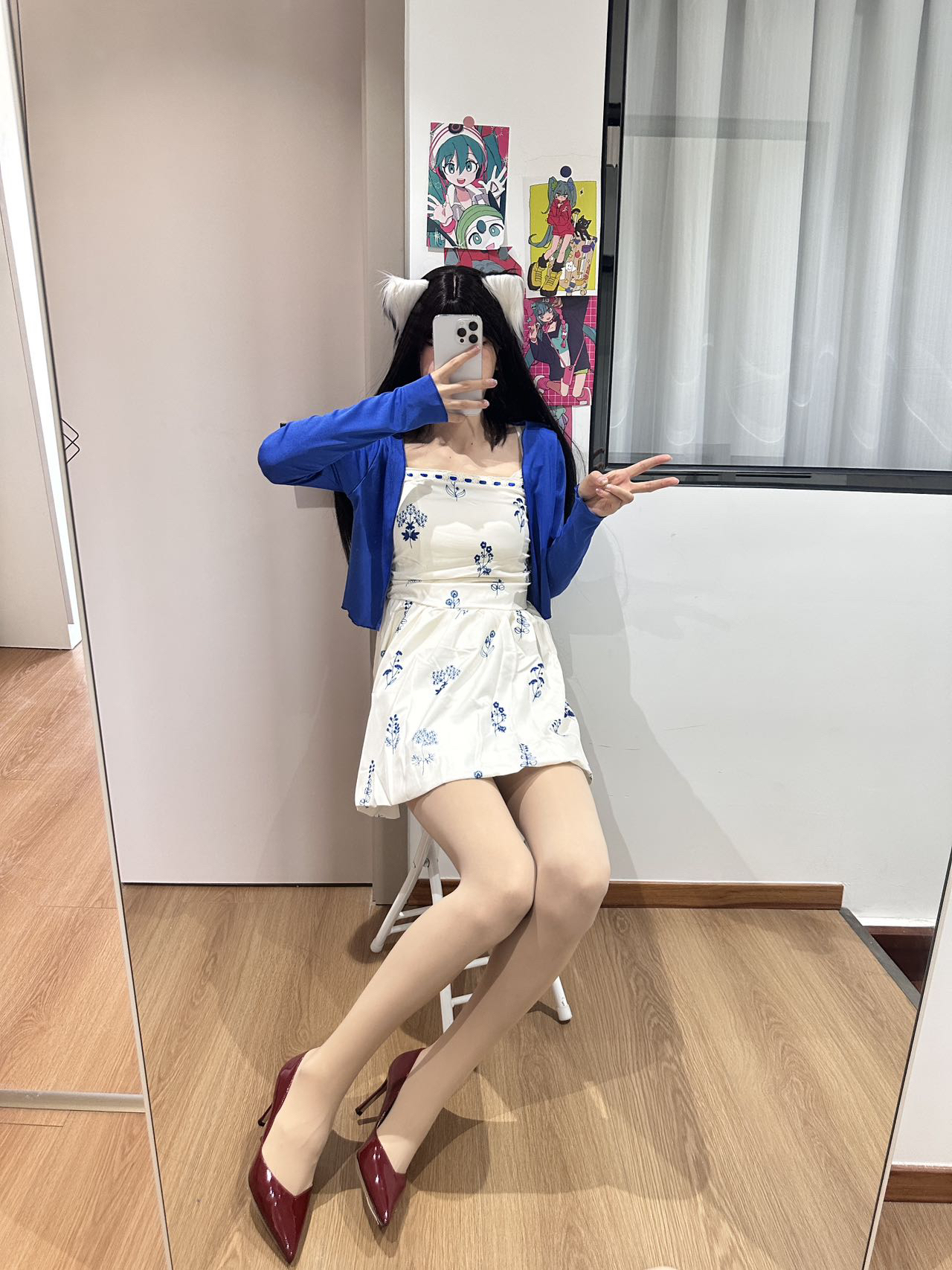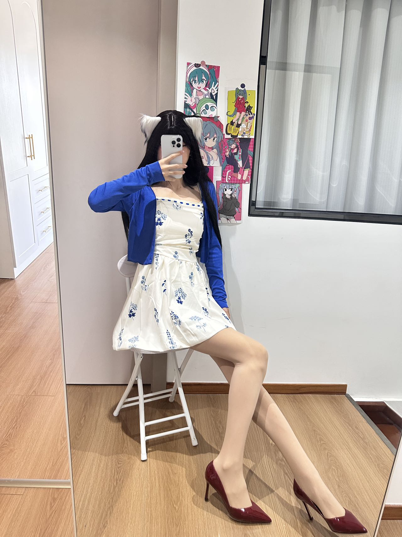 蓝色开衫➕白裙子 温柔又韩系 好喜欢😻 搭配了一双酒红色高跟鞋 既显气质又显白 有小说女主那味辣~