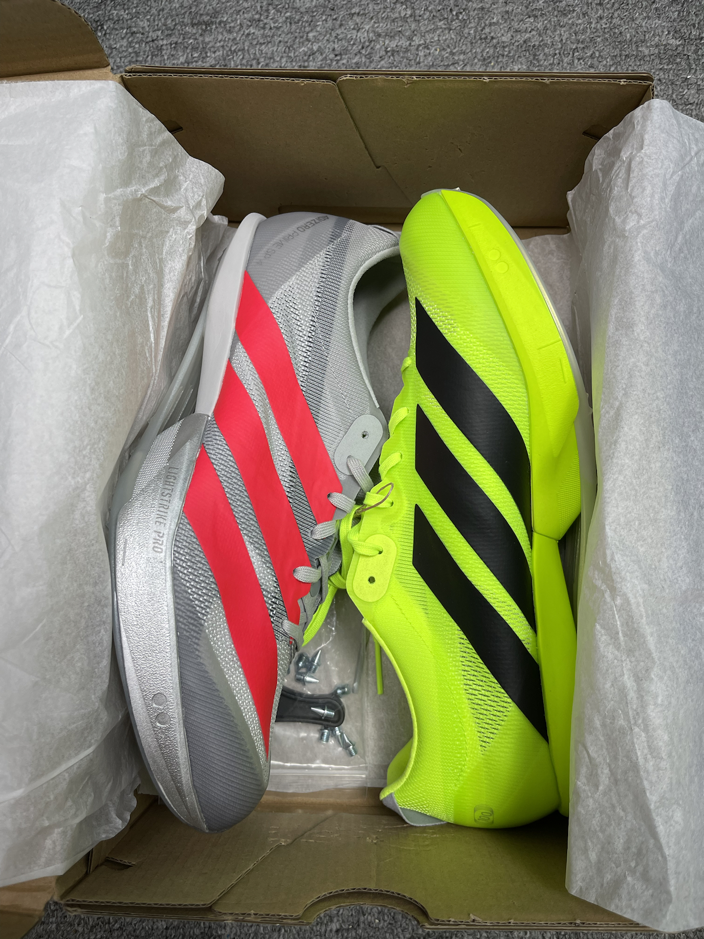 首发两款配色都是激进配色经典款!你喜欢吗?不过现在价格还有点高都是博主在买[吃瓜_blue]下期视频讲一下升级了什么🤔 #大蝉翼4代 #阿迪达斯大蝉翼4 #田径钉鞋 #体考体测满分鞋 #夏季宝藏运动鞋分享 @得物创作课代表 @引力平台小助手 @得物运动 @得物App @得鞋狗