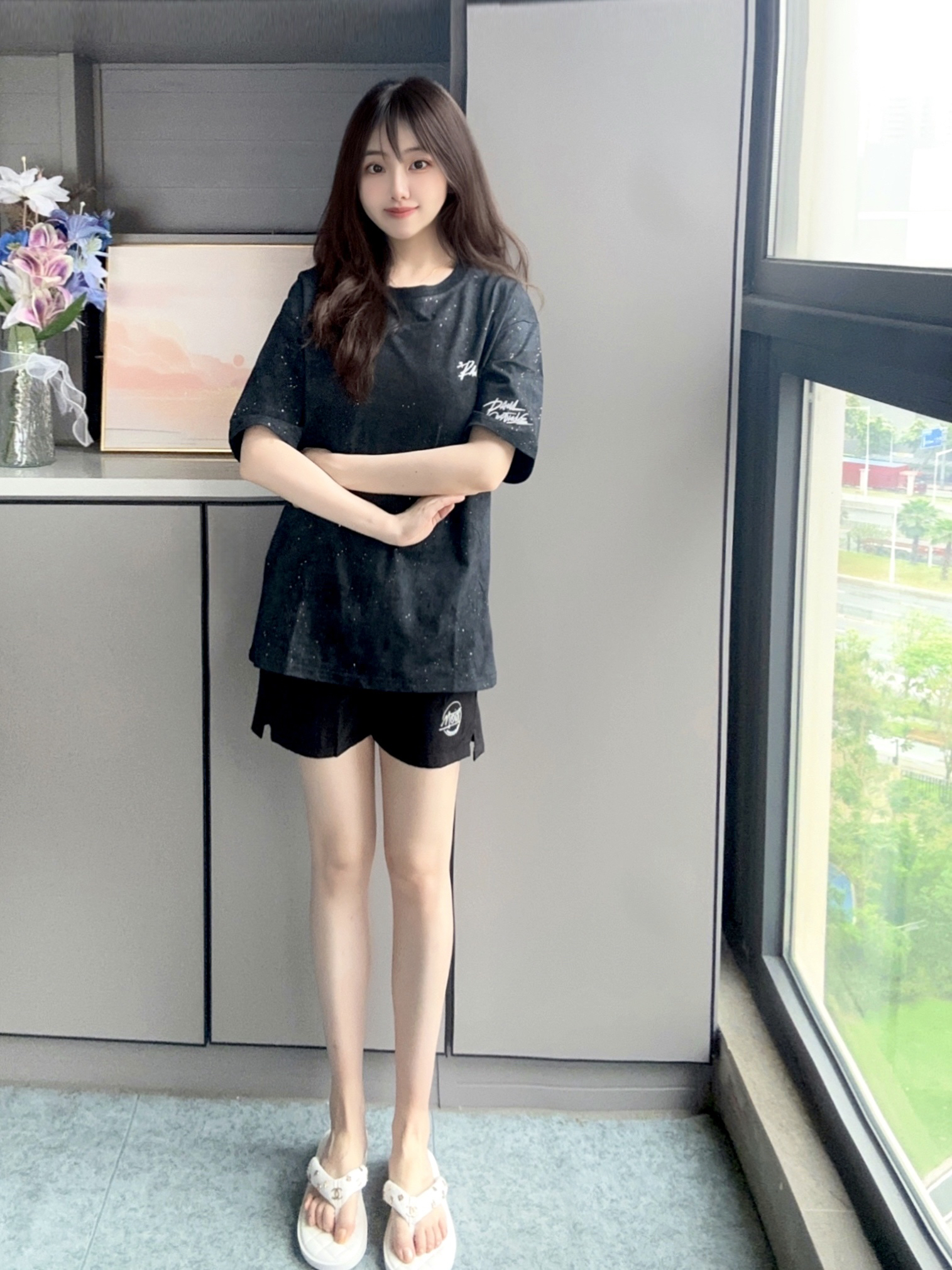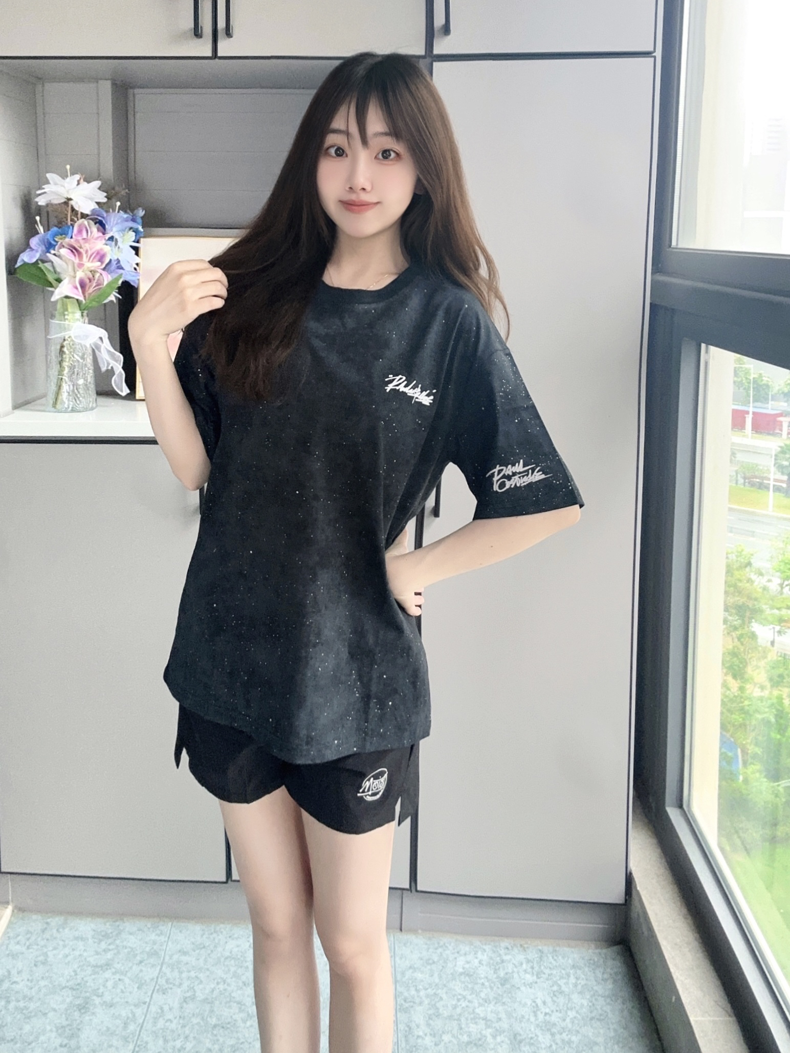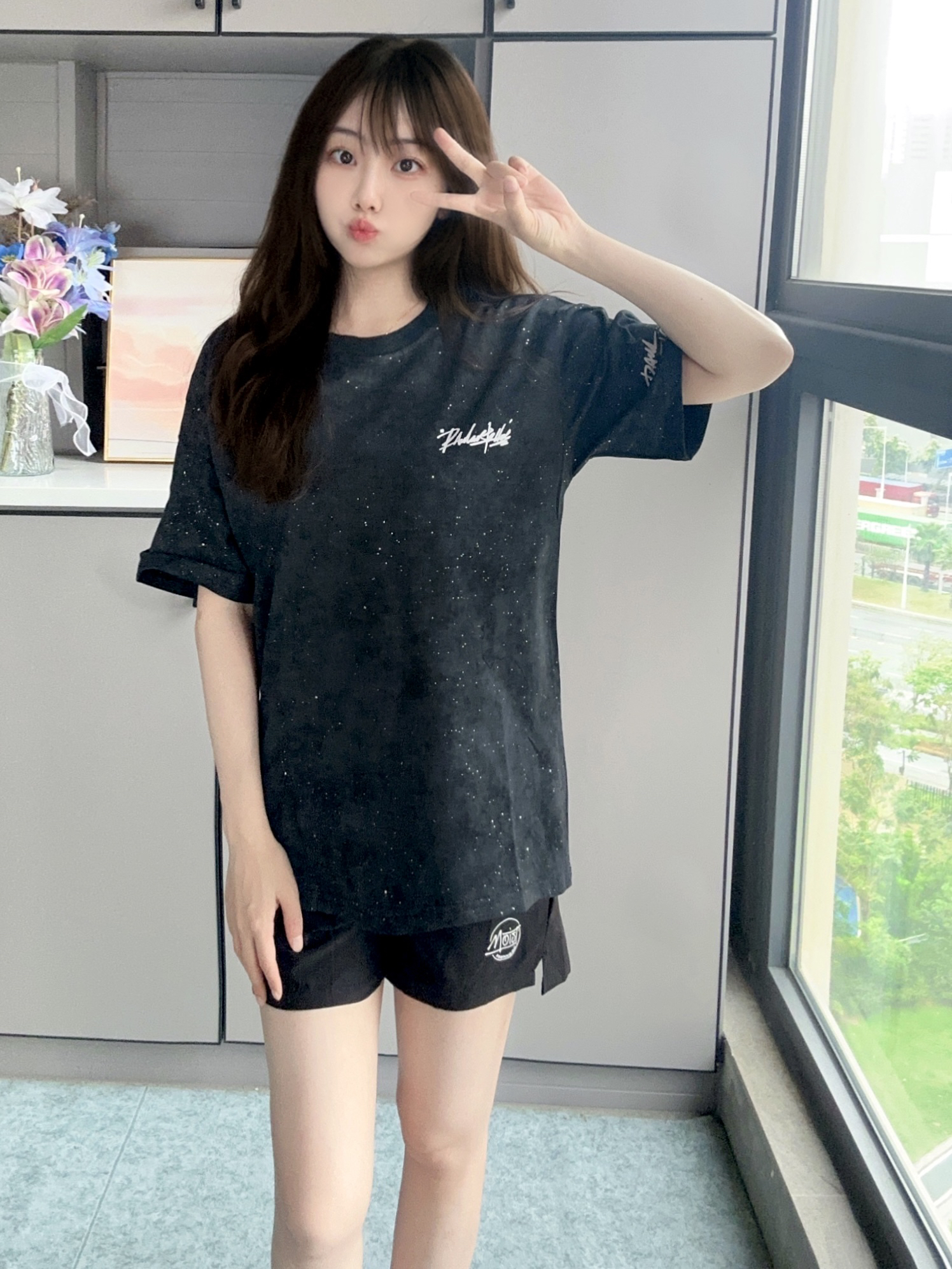 夏天穿上黑色T恤和黑色运动短裤 很有潮酷感的一套look 黑色t恤百搭而且有点细闪很好看